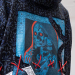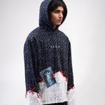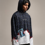 This hoodie creatively weaves the tale of Salim and Anarkali, symbolizing Anarkali's entombment. The floral block printing evokes Rajasthan's walls, while contrasting panels represent different eras: white for the past and black for the modern age, reflecting our view of history.
