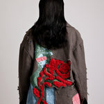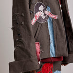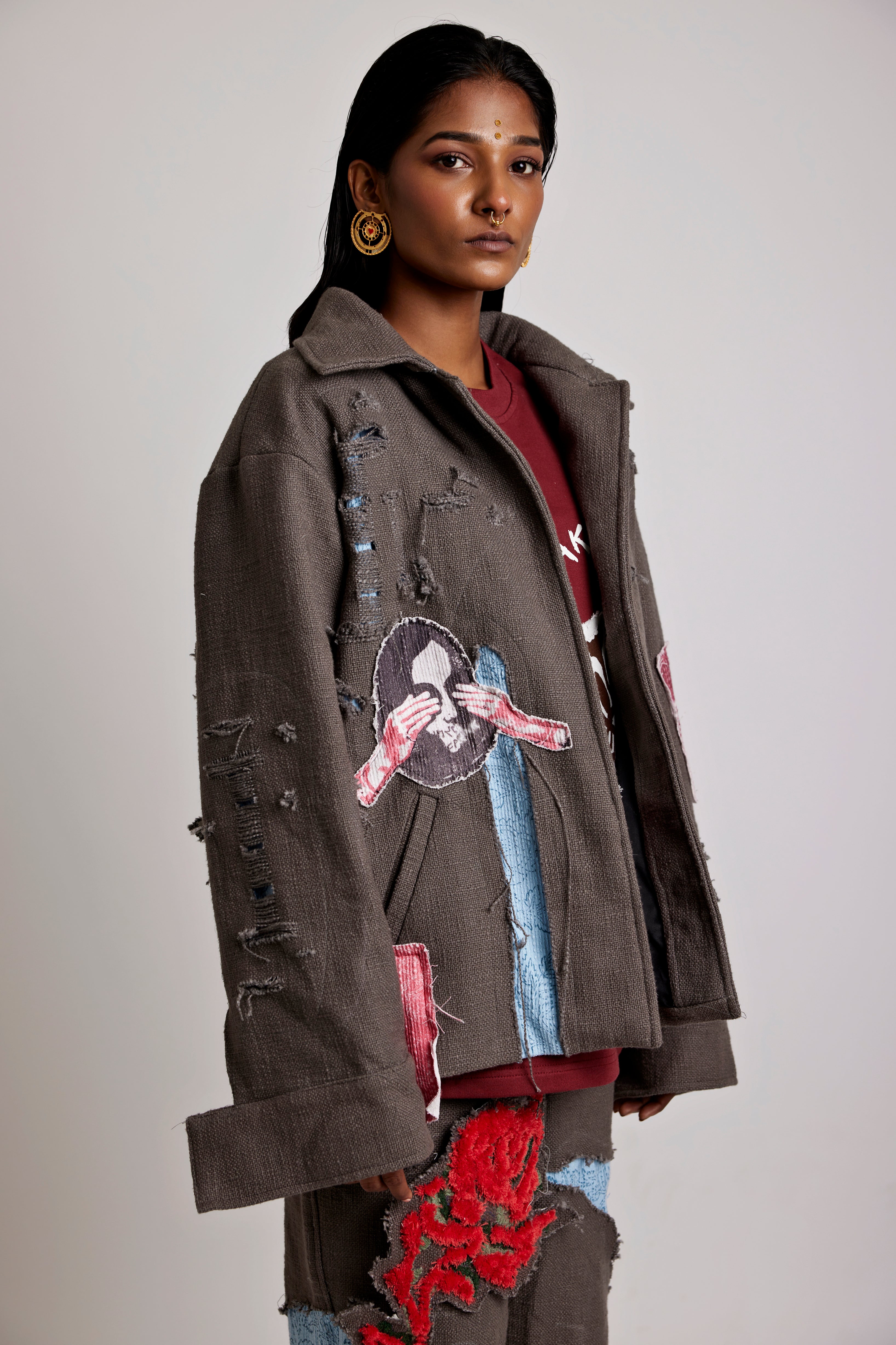 Crafted entirely from 100% Khadi cotton, this masterpiece proudly bears the label "Made in India". The intricate patches are expertly hand-block printed by the skilled hands of Hari Om Ji, a fourth-generation artisan from Jaipur. Adding to its allure, delicate hand-embroidered details are meticulously crafted by Moshraf Bhai, also from Jaipur. With hand-screen printed elements and digital patches, this jacket is truly a work of art, celebrating the rich heritage and craftsmanship of India.