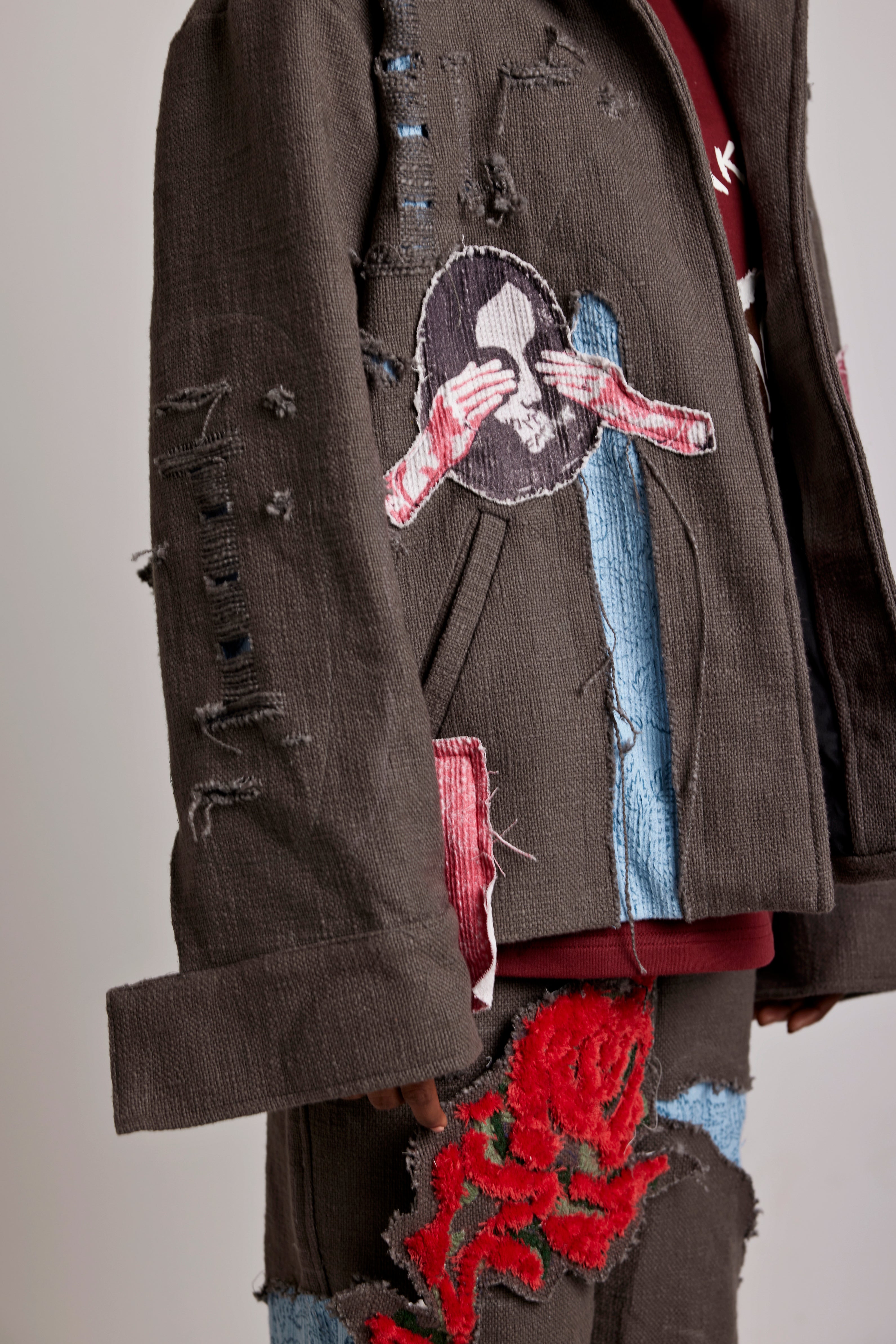 The Jacket holds a special place in Farak's collection, embodying the art of storytelling inspired by the poignant lines, "taj duniya ne dekha hai, Mumtaz ne nhi". It skillfully captures the essence of this enduring love tale in its distressed fabric, serving as a canvas for the passage of time and history. Adorned with meticulously crafted patches, including a hand-embroidered flower symbolizing love on the back and a blue patch reminiscent of the Taj Mahal's silhouette, the pant pays homage to the timeless romance of Shah Jahan and Mumtaz.