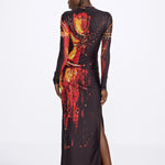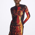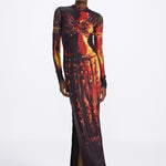 Fierce heritage meets futuristic form. The Choli Dress reimagines traditional silhouettes through a lens of bold artistry—where the classic choli becomes a full-length statement. Printed with dramatic imagery that dances between power and poise, this body-hugging piece channels divine femininity and raw strength. With every step, it tells a story—of roots, rebellion, and unapologetic beauty.