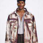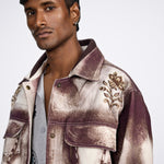 This handmade Dastaan jacket fuses raw craftsmanship with artistic expression. Featuring intricate embroidery and a burnished, airbrushed texture, it evokes a rugged yet refined aesthetic. The distressed finish and earthy tones capture a sense of nostalgia and rebellion, while the relaxed silhouette adds effortless edge. It’s not just outerwear—it’s a statement of soul, story, and street sophistication.