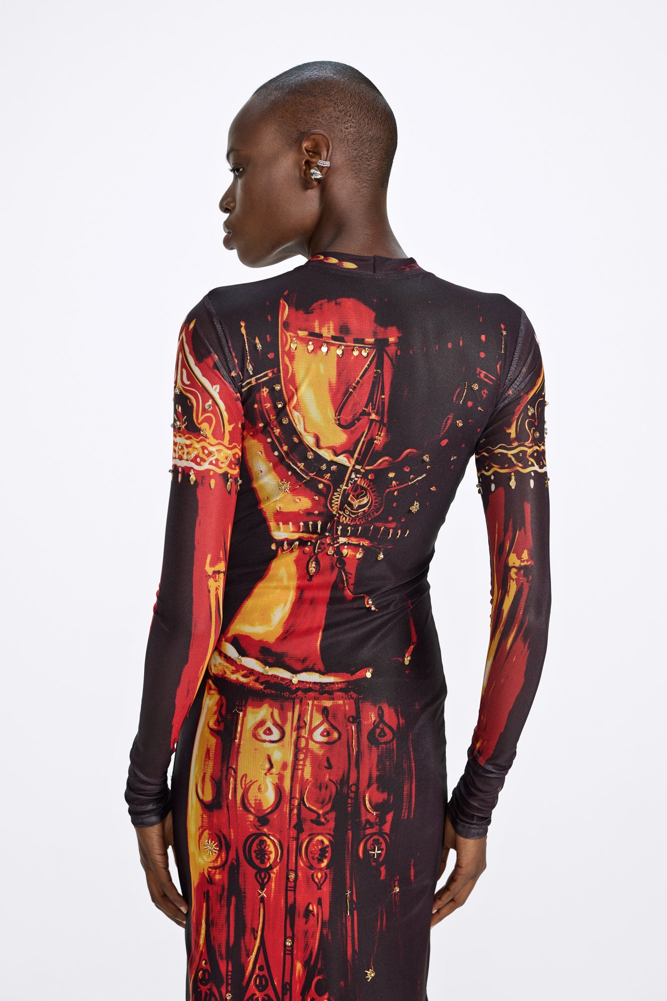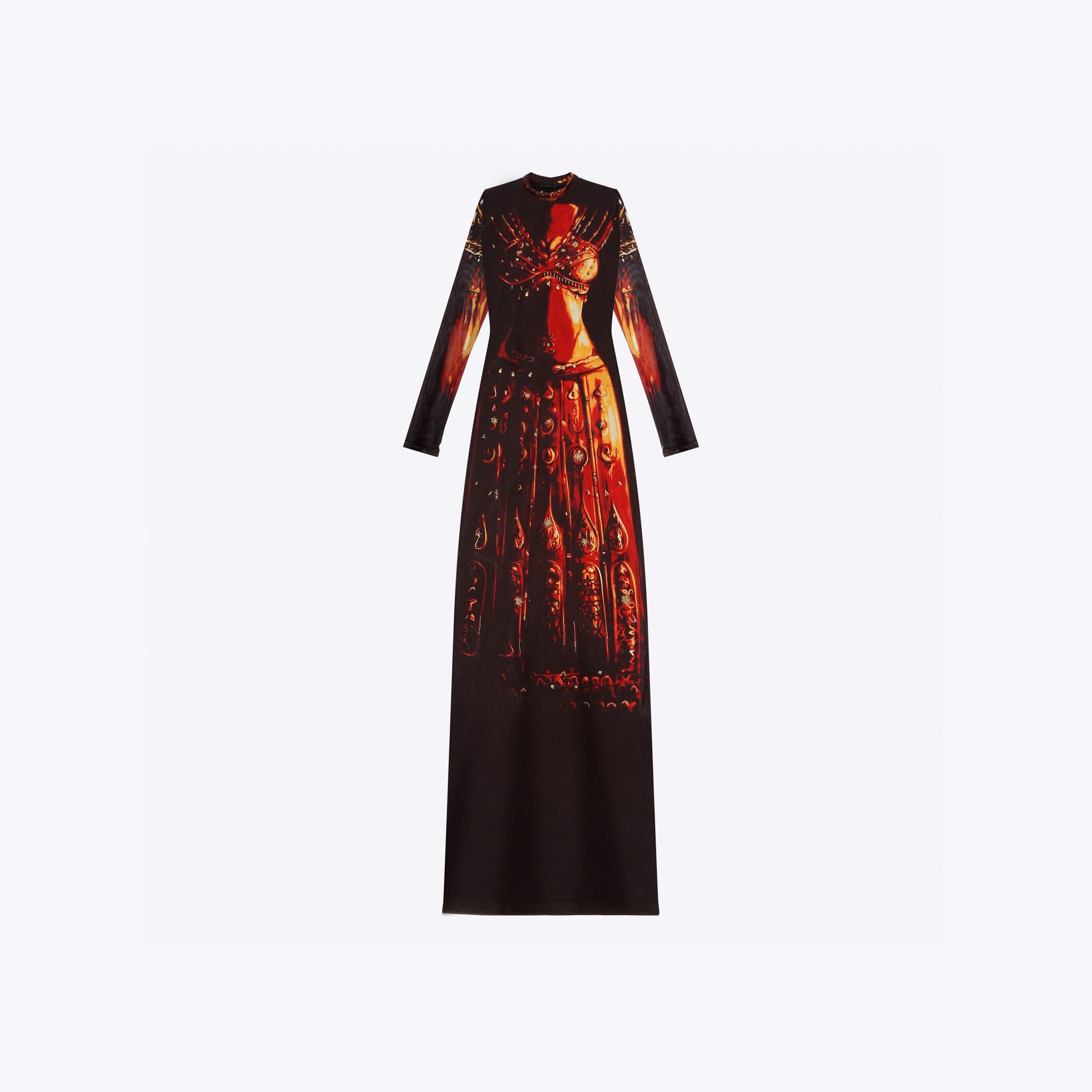 Fierce heritage meets futuristic form. The Choli Dress reimagines traditional silhouettes through a lens of bold artistry—where the classic choli becomes a full-length statement. Printed with dramatic imagery that dances between power and poise, this body-hugging piece channels divine femininity and raw strength. With every step, it tells a story—of roots, rebellion, and unapologetic beauty.