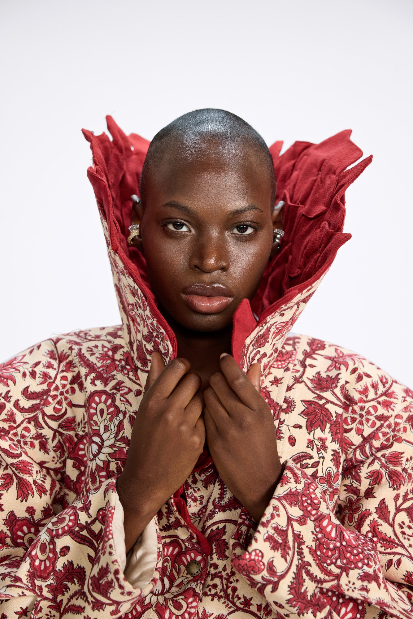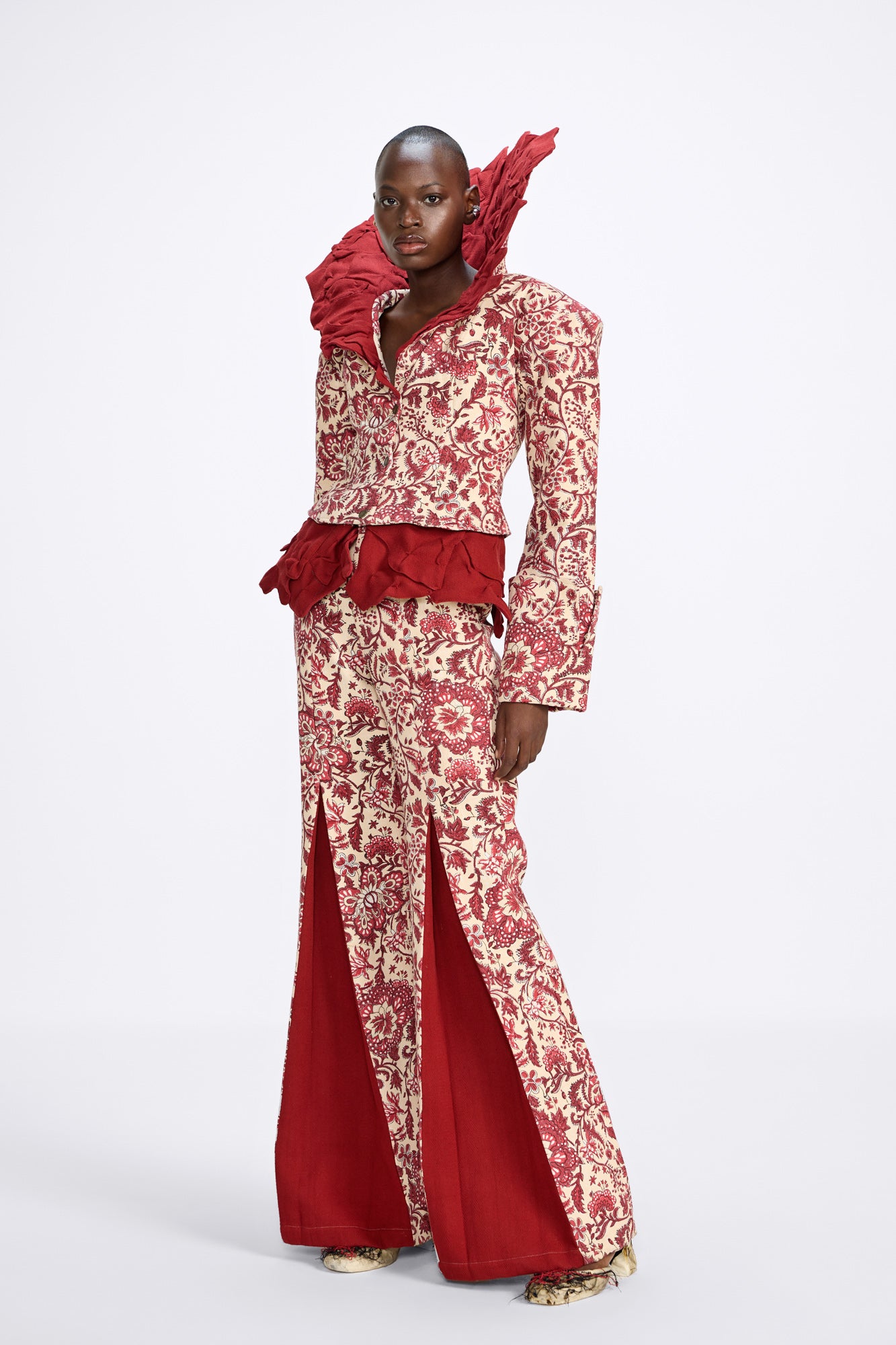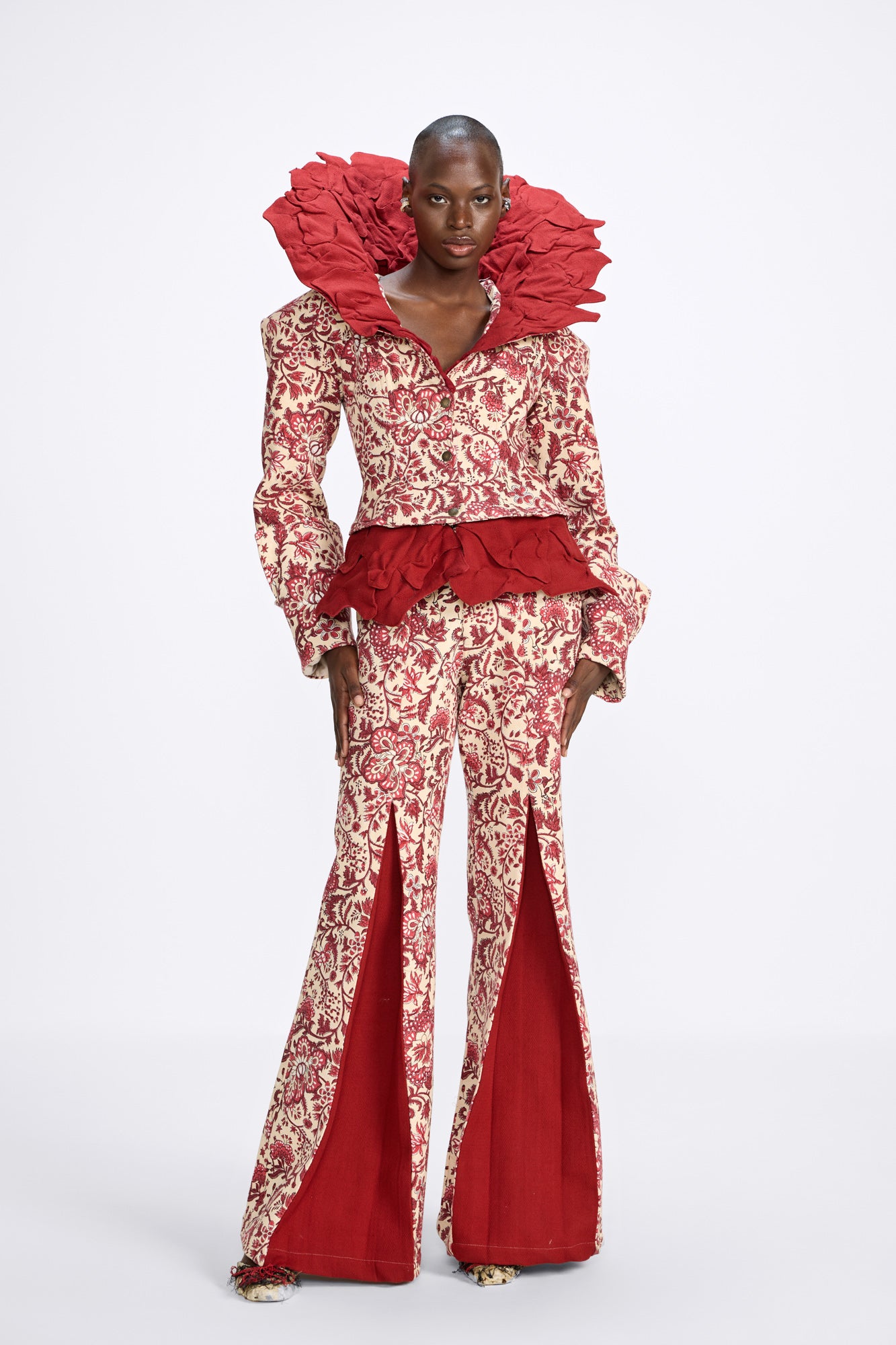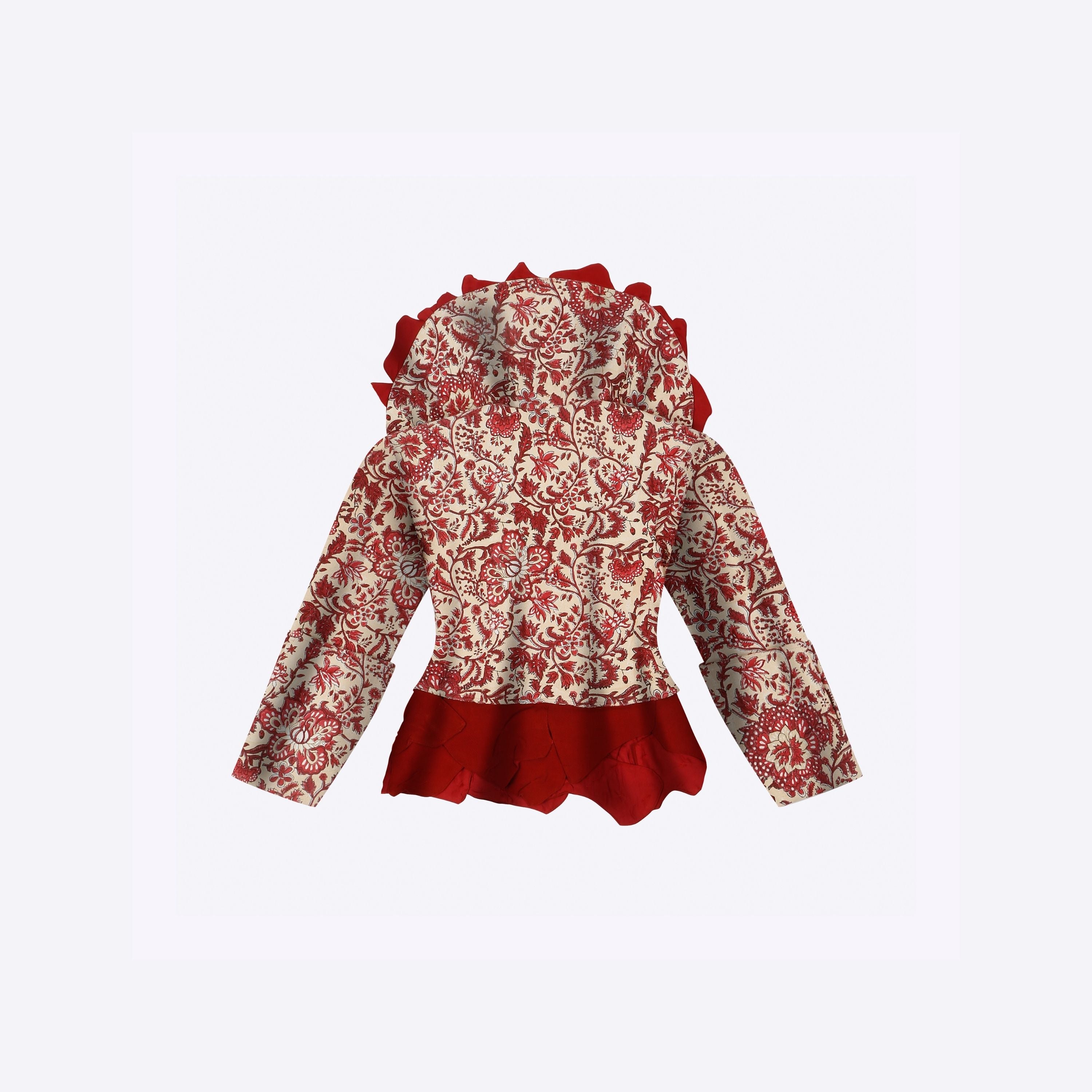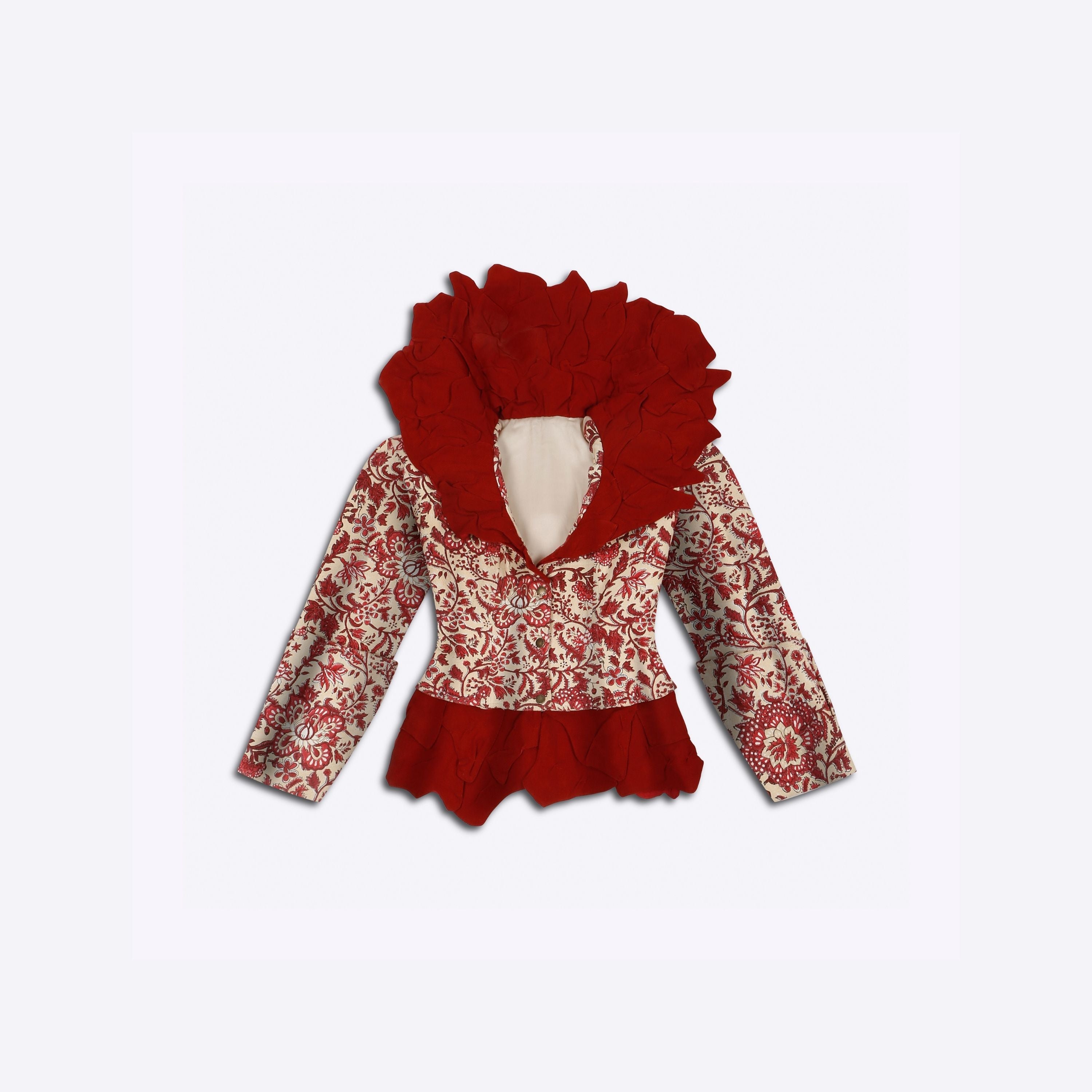 A royal bloom in motion, the Phoolon ki Rani Jacket is a celebration of fierce femininity rooted in floral grace. Handcrafted with heritage block prints and sculpted with dramatic flares, it’s a piece that commands presence and holds stories in every pleat. The exaggerated collar and waist ruffles echo a regal rebellion—bold, unapologetic, yet intricately beautiful. At Farak, this is where power meets poetry, stitched in petals and pride.