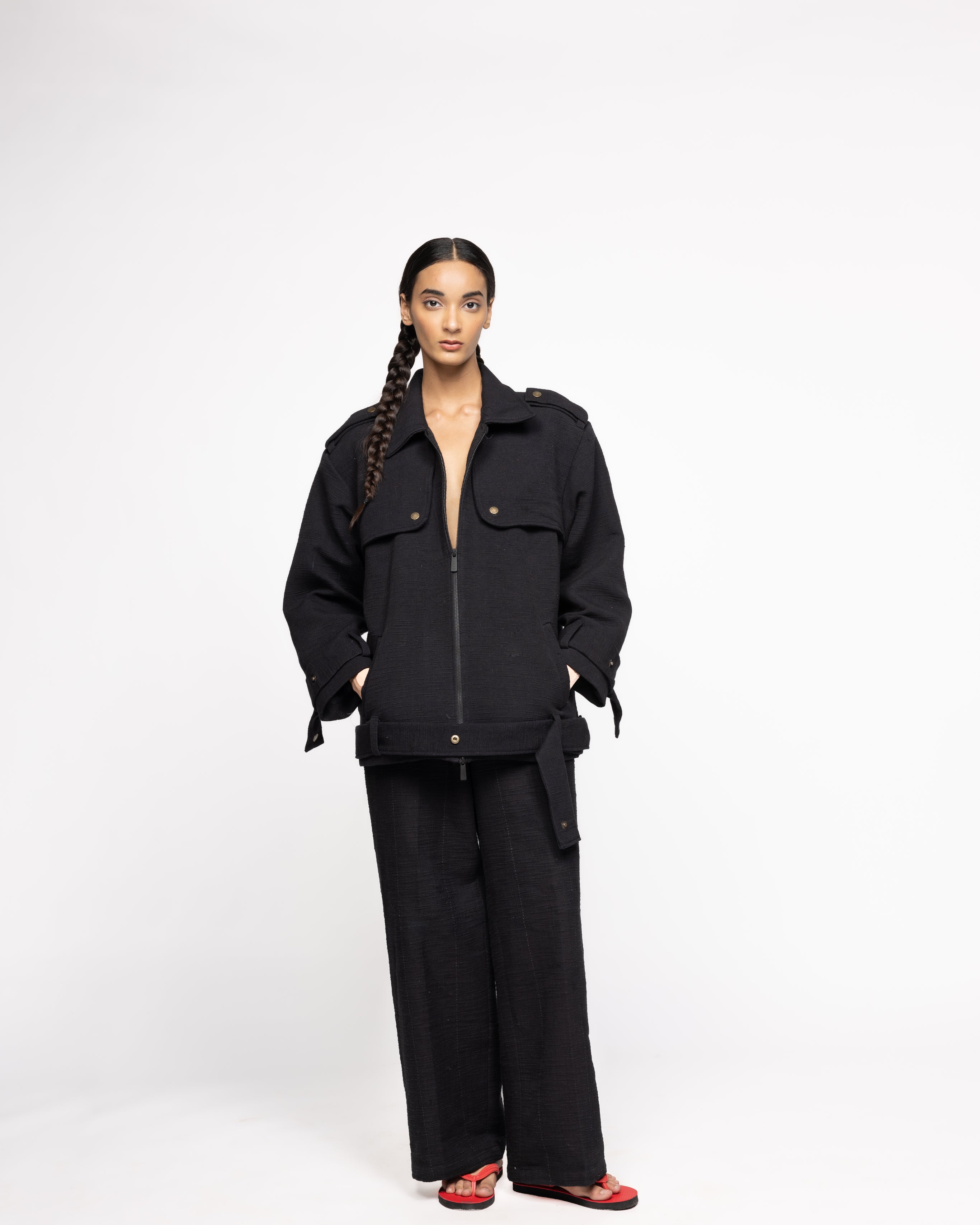 Handcrafted with meticulous care and artisanal expertise, our Handwoven Trench Jacket epitomizes the fusion of tradition and modernity. Each garment is handwoven by generational artisan Pramod Ji, ensuring the highest quality and authenticity. This versatile jacket seamlessly combines the timeless silhouette of a trench coat with contemporary details. Featuring straps on the sleeves, a two-way zipper, and hemp detailing at the bottom, it exudes a blend of sophistication and functionality. Whether layered over casual attire or paired with more formal ensembles, this handwoven trench jacket is a statement piece that embodies artisanal craftsmanship and timeless style.