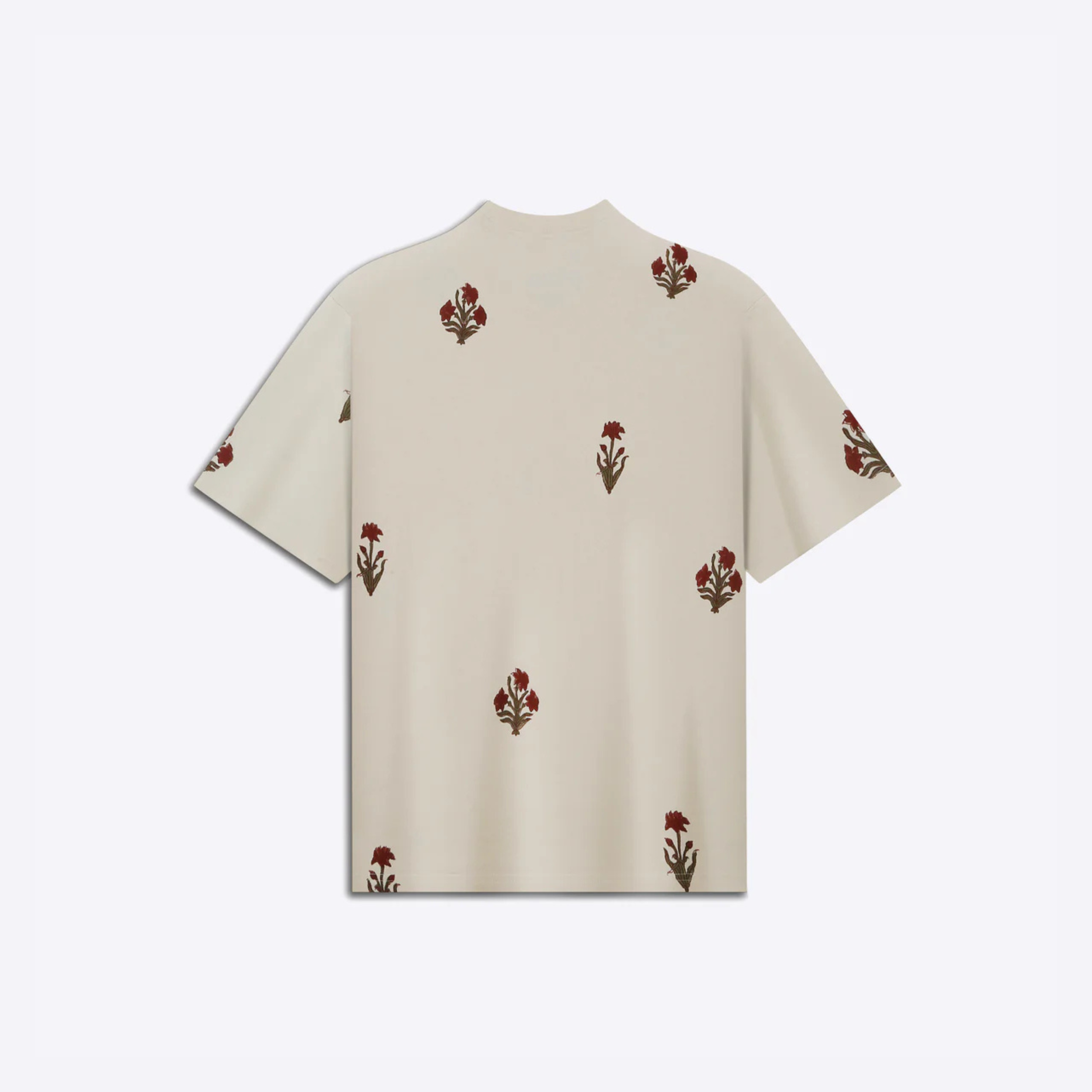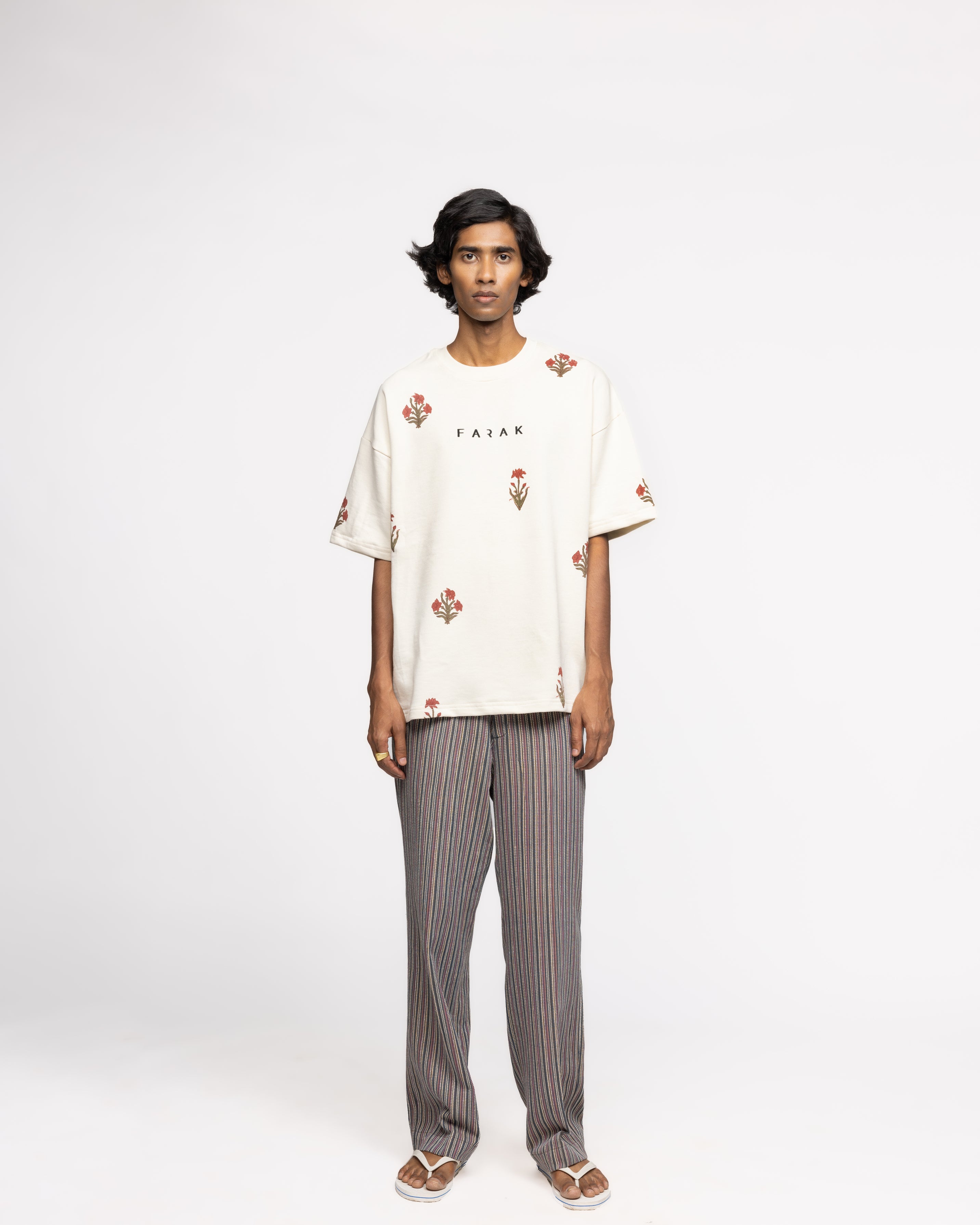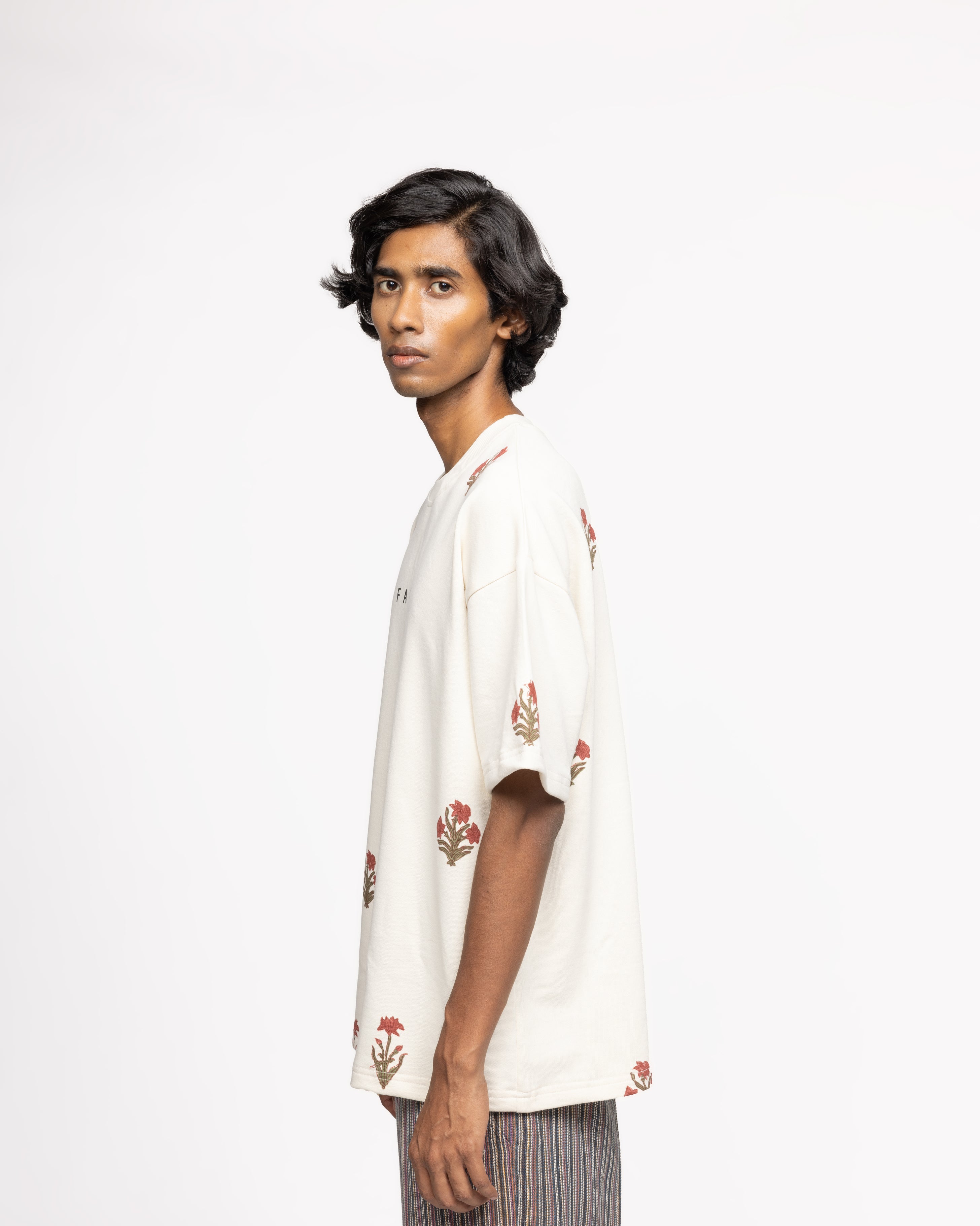 Presenting the Sanganeri Block Print Tshirt, a delightful fusion of tradition and contemporary style. This tee features intricate block-printed motifs throughout, meticulously created by master artisan Hari Om Ji using the traditional Sanganeri motif block print technique. The base color is a soothing cream shade, complementing a warm and vintage-inspired colour palette, giving an essence of the time passed. Each motif evokes a sense of nostalgia, reminiscent of classic designs yet adapted to modern silhouettes. With its conventional print and modern silhouette, this tee is timeless, perfect for adding a touch of heritage charm to any outfit.