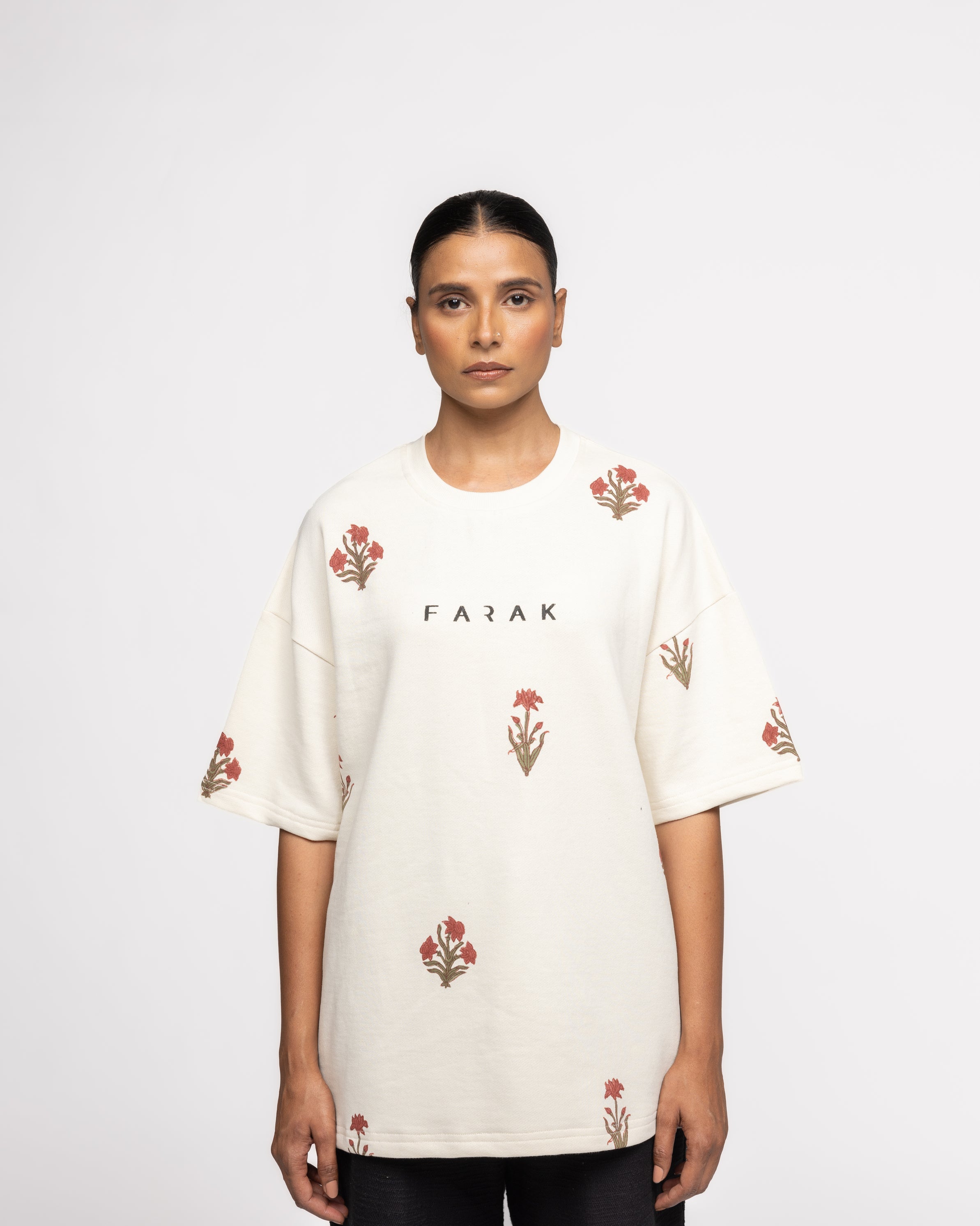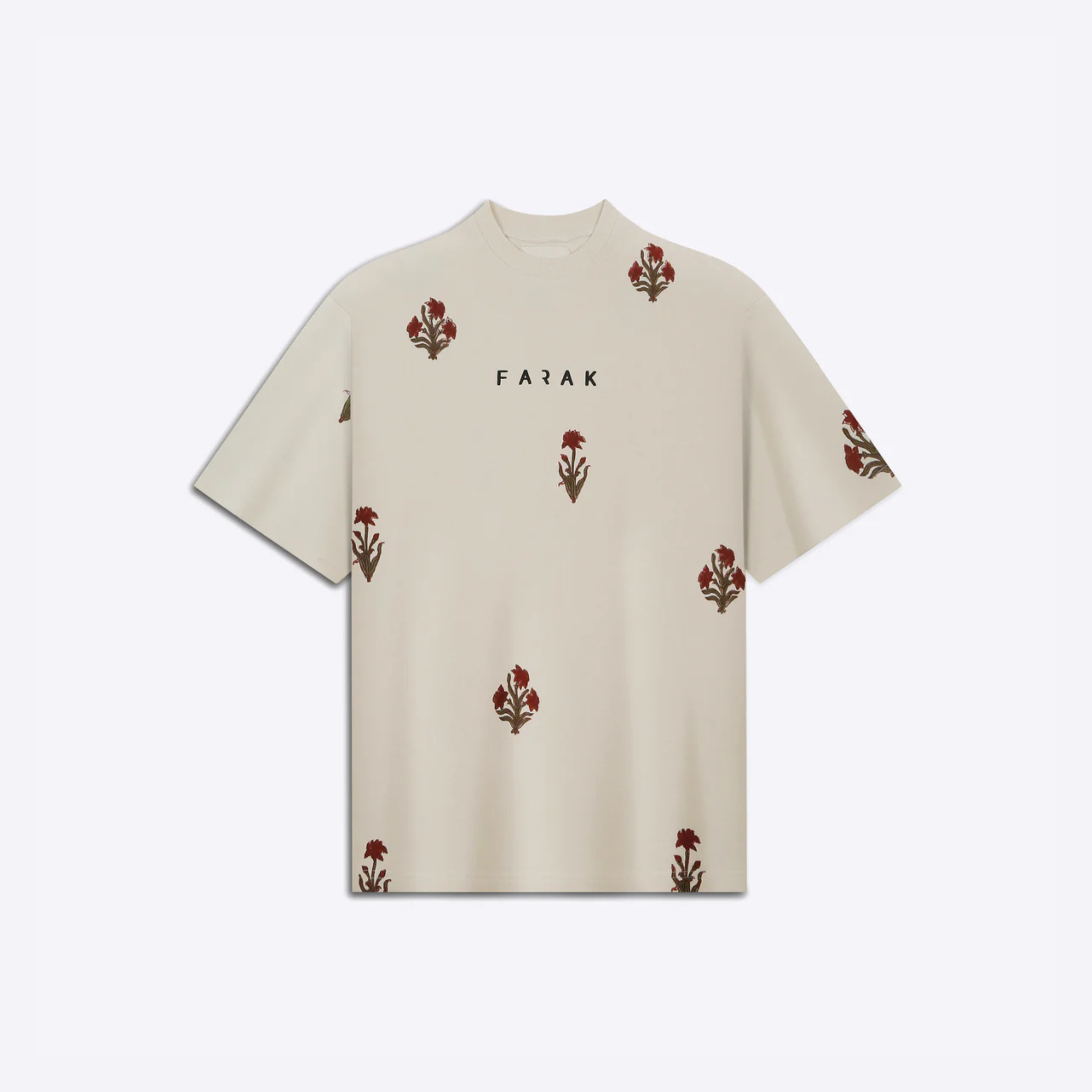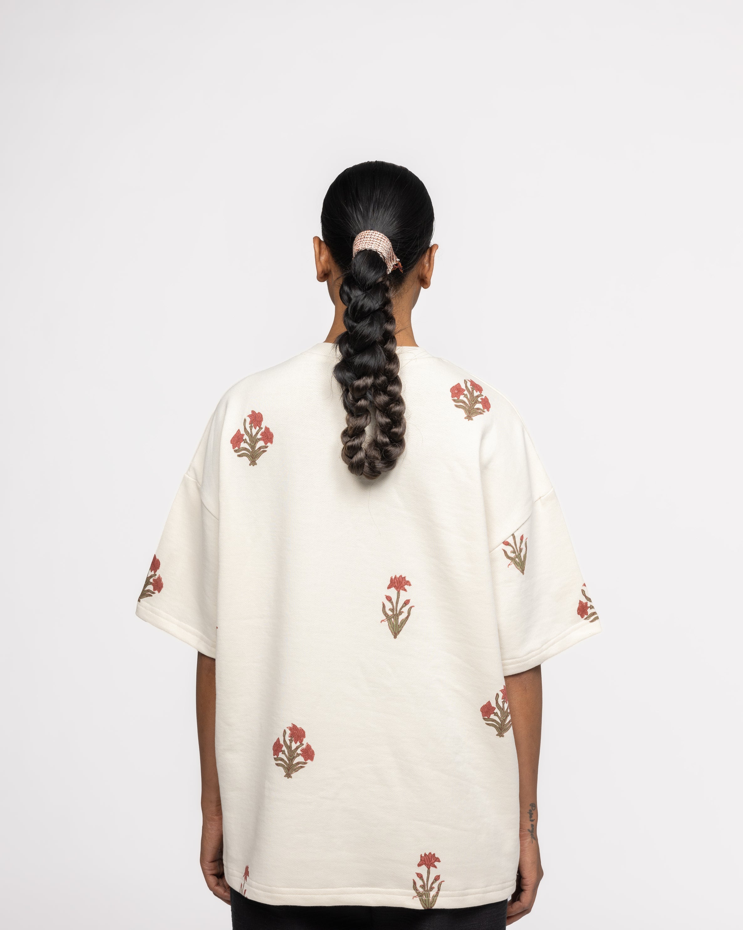 Presenting the Sanganeri Block Print Tshirt, a delightful fusion of tradition and contemporary style. This tee features intricate block-printed motifs throughout, meticulously created by master artisan Hari Om Ji using the traditional Sanganeri motif block print technique. The base color is a soothing cream shade, complementing a warm and vintage-inspired colour palette, giving an essence of the time passed. Each motif evokes a sense of nostalgia, reminiscent of classic designs yet adapted to modern silhouettes. With its conventional print and modern silhouette, this tee is timeless, perfect for adding a touch of heritage charm to any outfit.