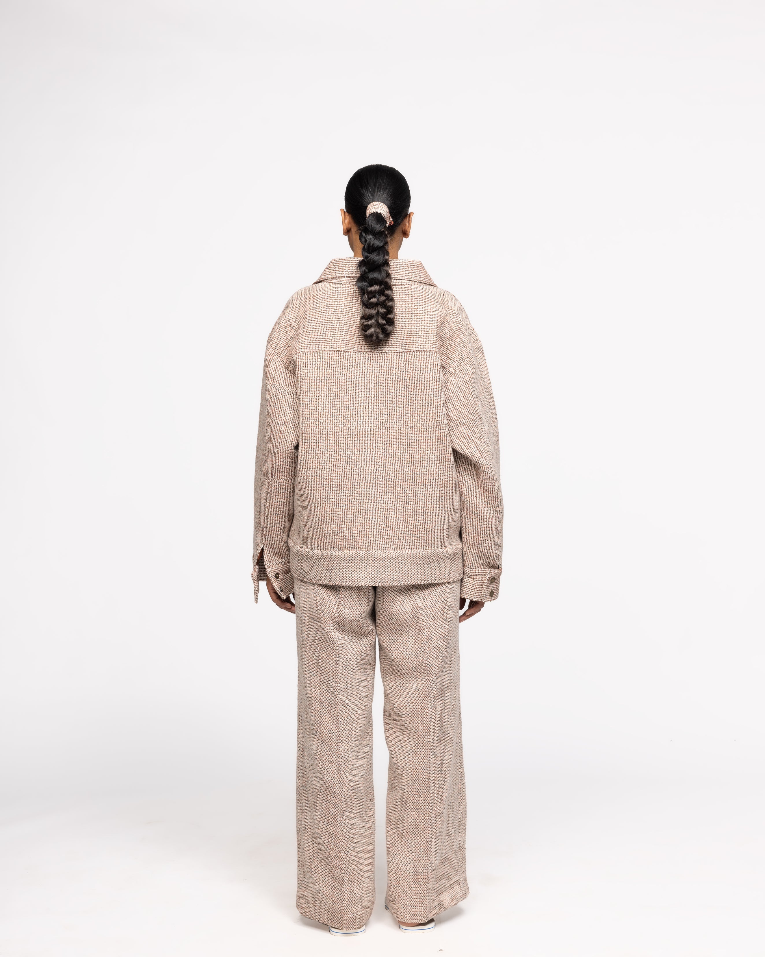 This co-ord set marks a journey of commitment, a testament to our brand's core values. This piece represents our promise to build not just a brand, but an emotion, a value, and a community of individuals who appreciate the true essence of craftsmanship. Partnering with Shyam Ji Bhai from Bhuj, Gujarat, an 11th-generation artisan from a family of Padma Shree awardees, we have created this exquisitely handmade piece. Crafted with immense care, this piece undergoes a time-intensive process where colours are extracted from natural dyes, three colours of yarn are handspun, and the fabric is handwoven. It also comprises hand block printing on the lining by 4th-generation artisan Pankaj Ji. Every element is handmade, showcasing our commitment to sustainable practices with zero electricity consumption. The natural dyes used also offer the unique benefit of keeping the body temperature cooler than the outside temperature, adding to the exceptional qualities of this piece.
