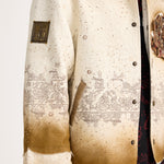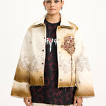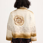 The Burning Flower Handmade Jacket is a striking fusion of traditional craftsmanship and modern storytelling, offering a fresh take on age-old techniques. This design embodies the complex emotions of love—fading beauty, obsession, and the inevitable passage into chaos. The burning flower represents a love so intense that it leads to self-destruction, yet finds beauty within that chaos. Crafted from 100% denim twill cotton, the fabric lends structure to the intricate design. With a double collar and heavy, detailed work on the surface, each piece is unique—hand painted, and block-printed—ensuring no two pieces are the same. The meticulous kantha embroidery adds further texture and depth to this artistic narrative, highlighting the delicate craftsmanship behind every stitch.