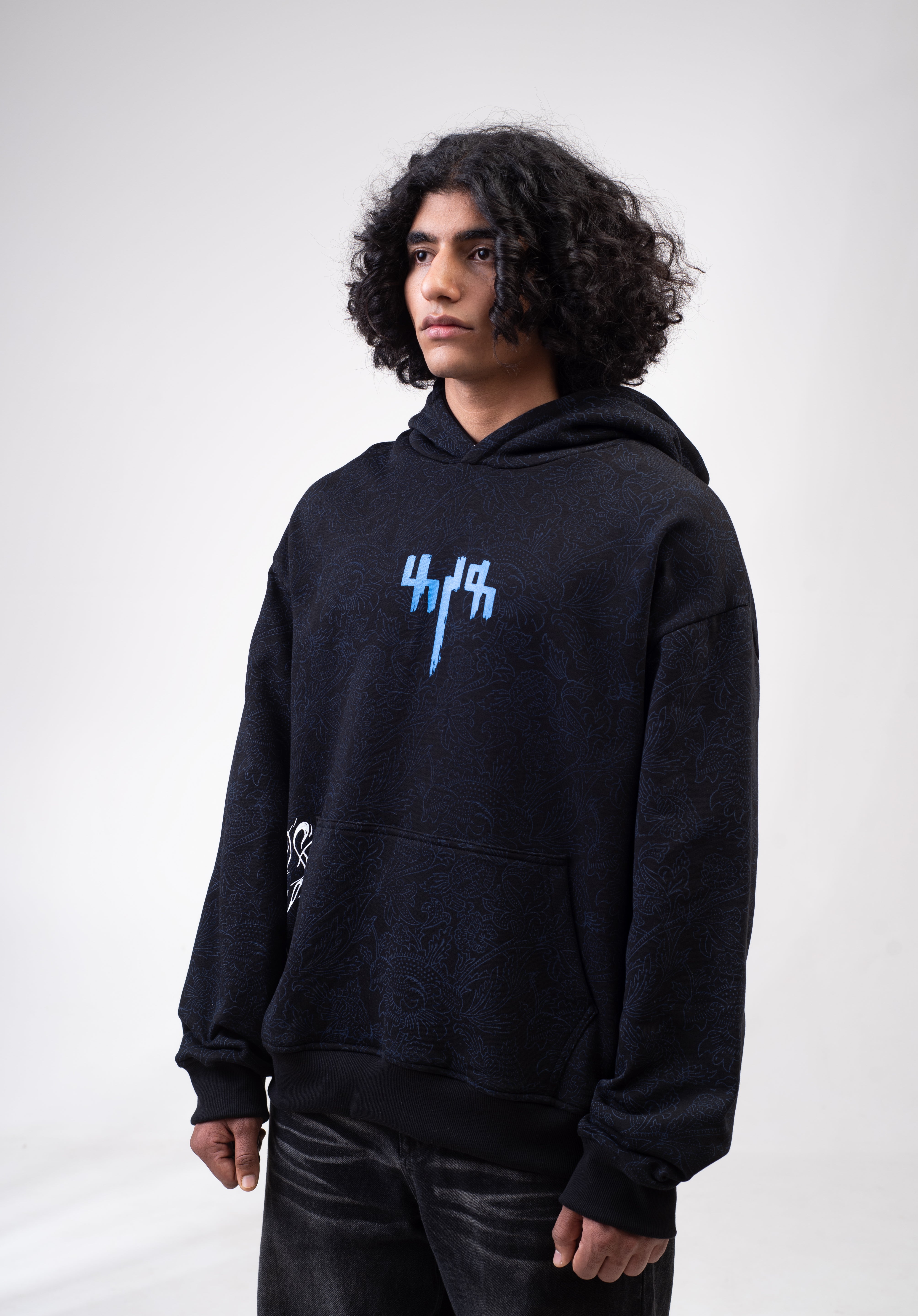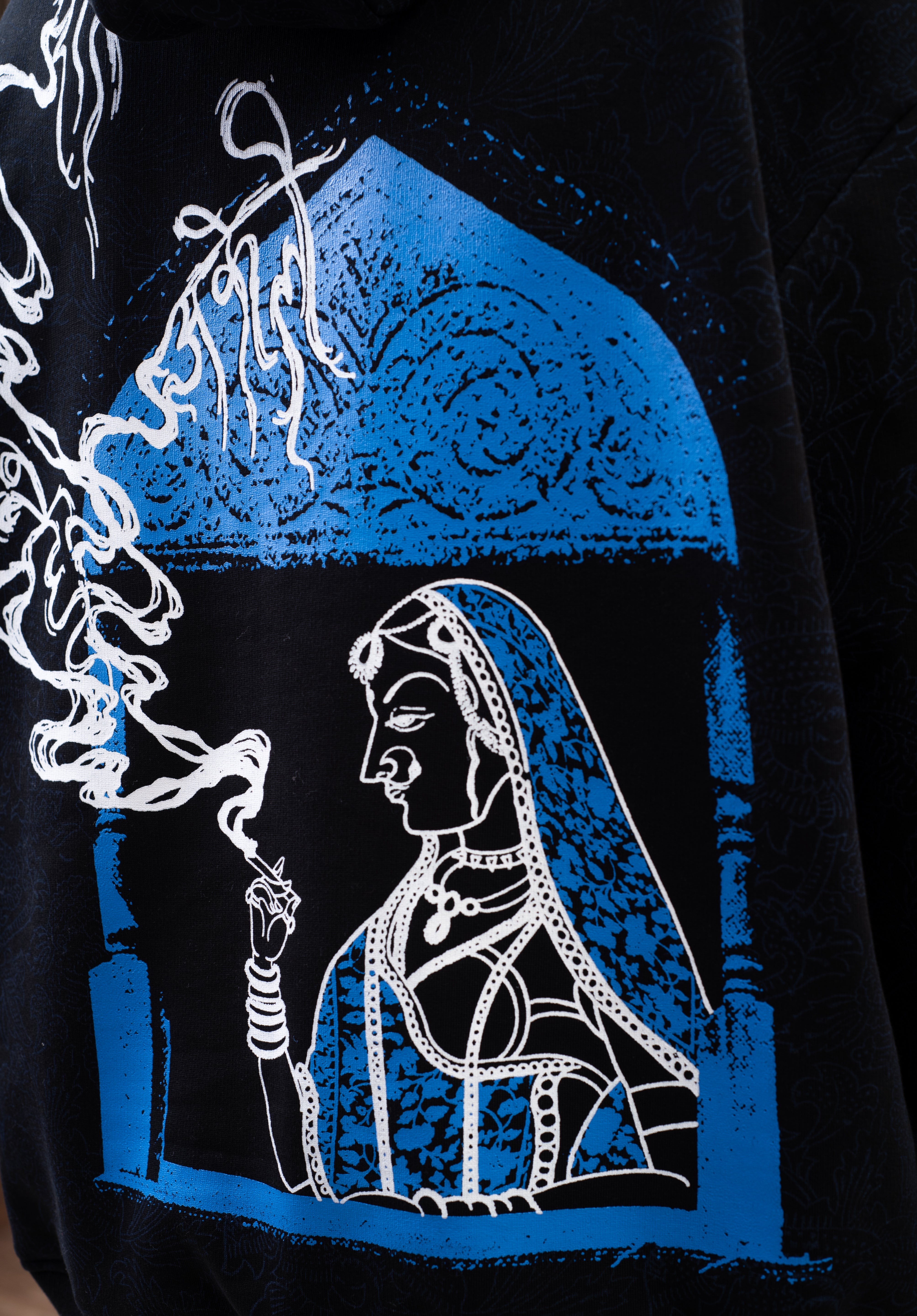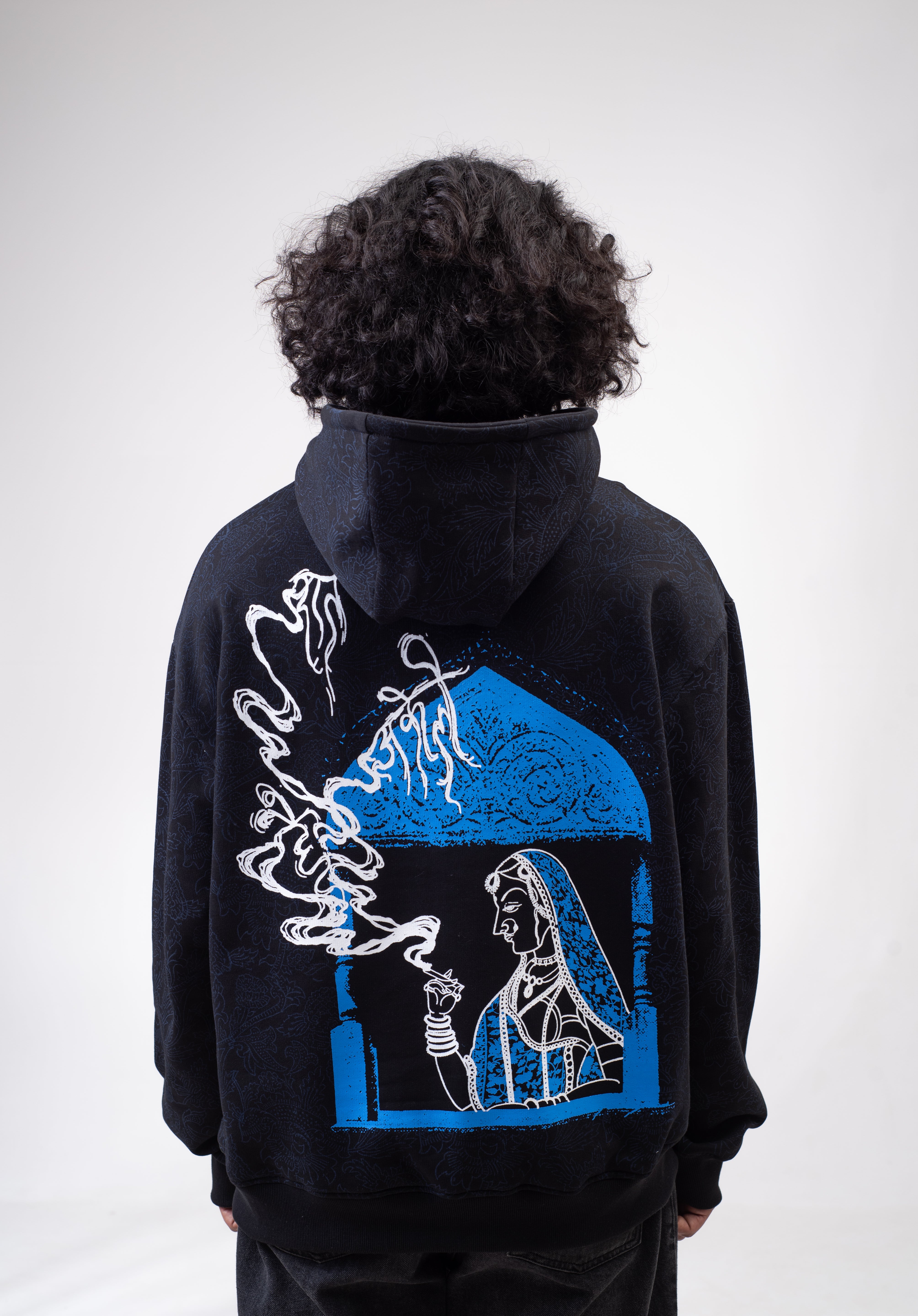 Capturing the essence of Indipop's queen, Asha Bhosle, this captivating hoodie is inspired by the lyrical masterpiece ‘Raat Akeli Hai, Bhuj Gye Diye’. Hand block printing by artisan Hari Om Ji transforms the fabric into a whimsical canvas.