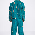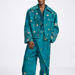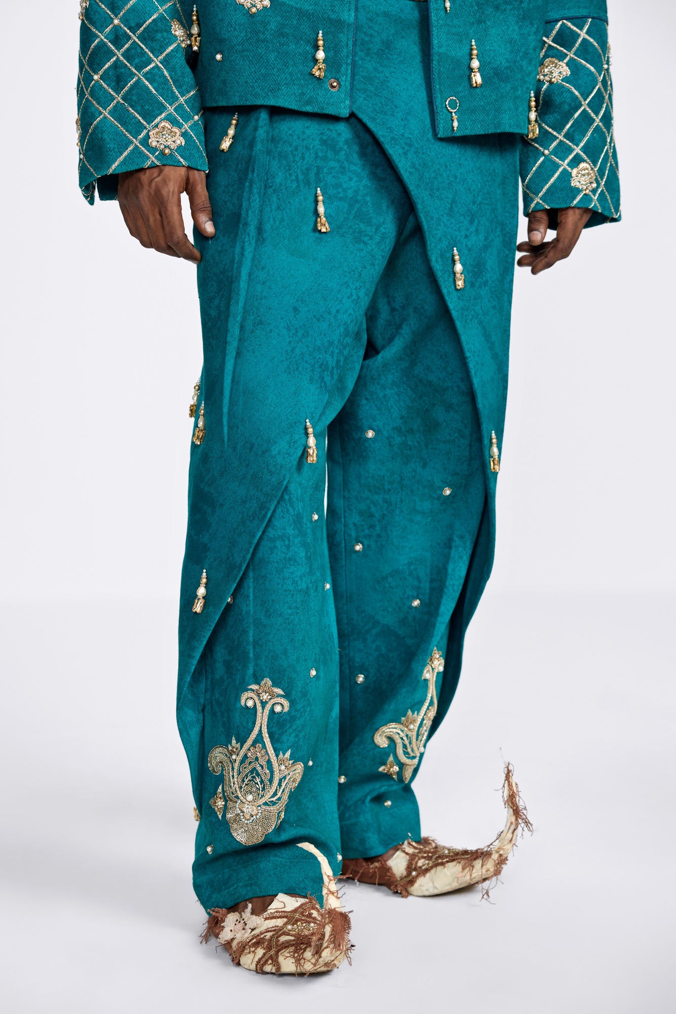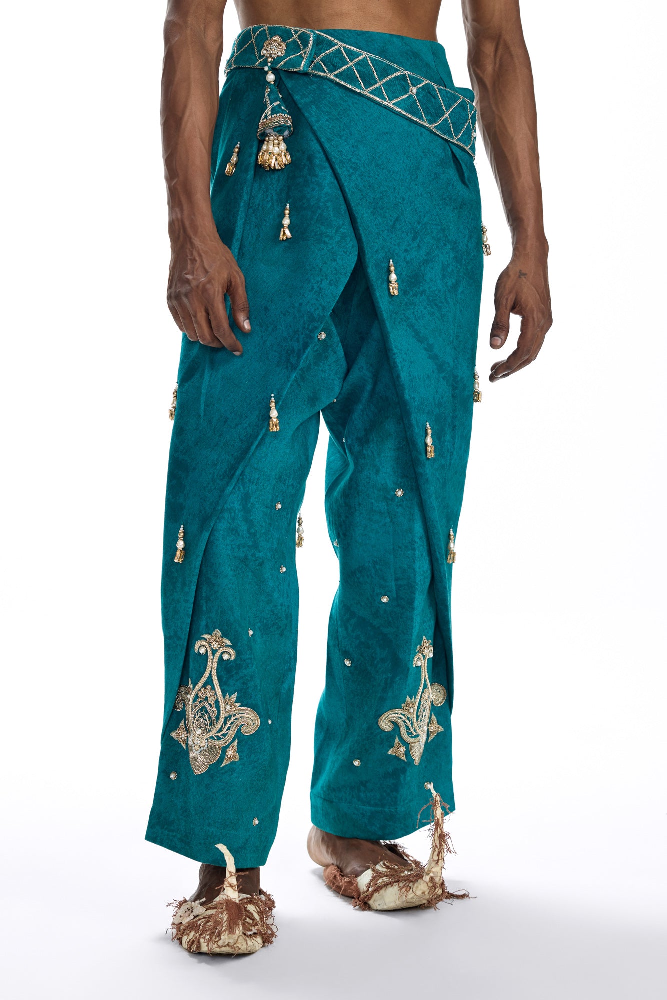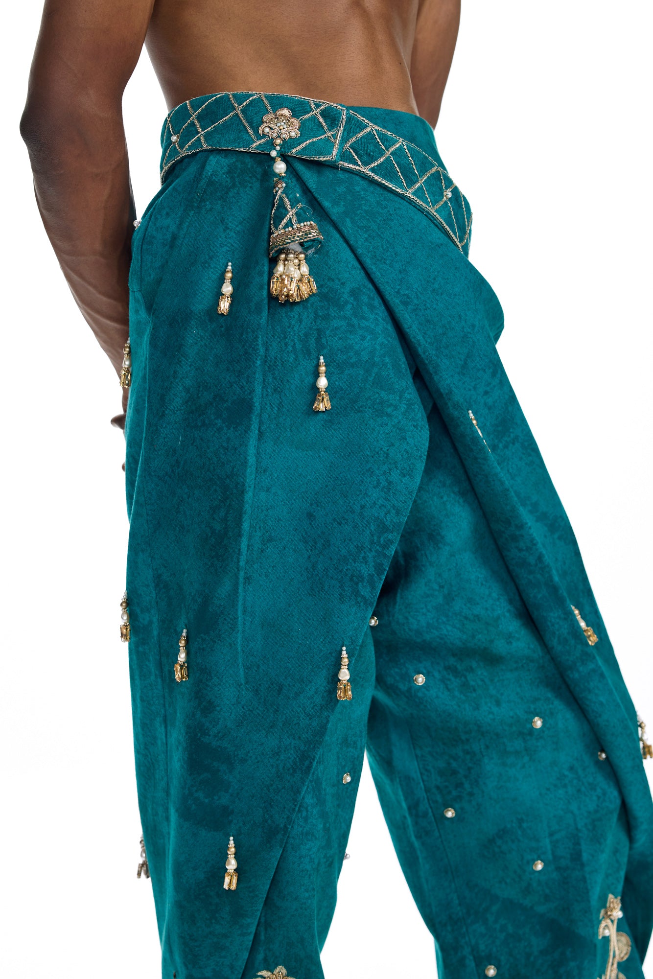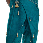 Draped like poetry, the Shehzaada Pants blend royal elegance with bold silhouette play. Hand-embroidered with ornate motifs and adorned with subtle tassels, they carry the weight of tradition with the ease of swagger. The asymmetrical wrap detail and rich teal base evoke a sense of movement — timeless, theatrical, and rooted in regality. At Farak, we turn legacy into language, one pleat at a time.