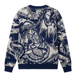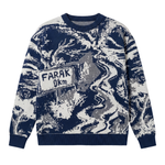 The Darbaar Flatknit Sweater is crafted from 100% organic cotton and features a richly textured flat-knit jacquard construction that brings its bold artwork to life. The sweater showcases an abstract, landscape-inspired pattern in deep blue and ivory tones, creating a visually striking marbled effect across the entire garment. At the center, a jacquard-woven directional sign reading “Farak 0km” adds a graphic, storytelling element that enhances the sweater’s unique character. The ribbed neckline, cuffs, and hem provide structure and comfort, while the relaxed silhouette ensures ease of movement and a contemporary fit. With its intricate knit pattern, premium organic cotton feel, and expressive design, the Darbaar Flatknit Sweater stands out as a statement piece that blends craftsmanship with artistic visual identity..