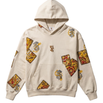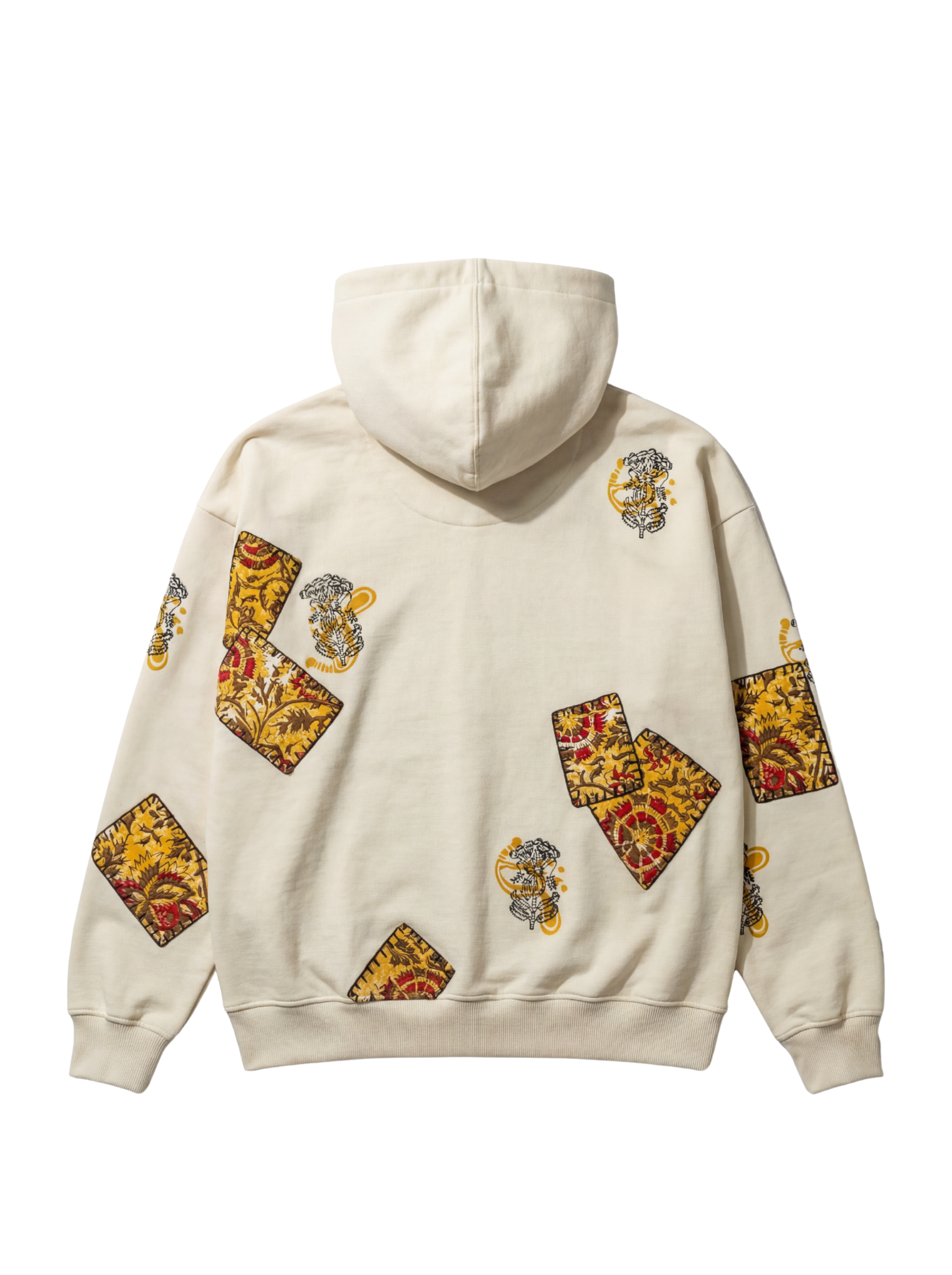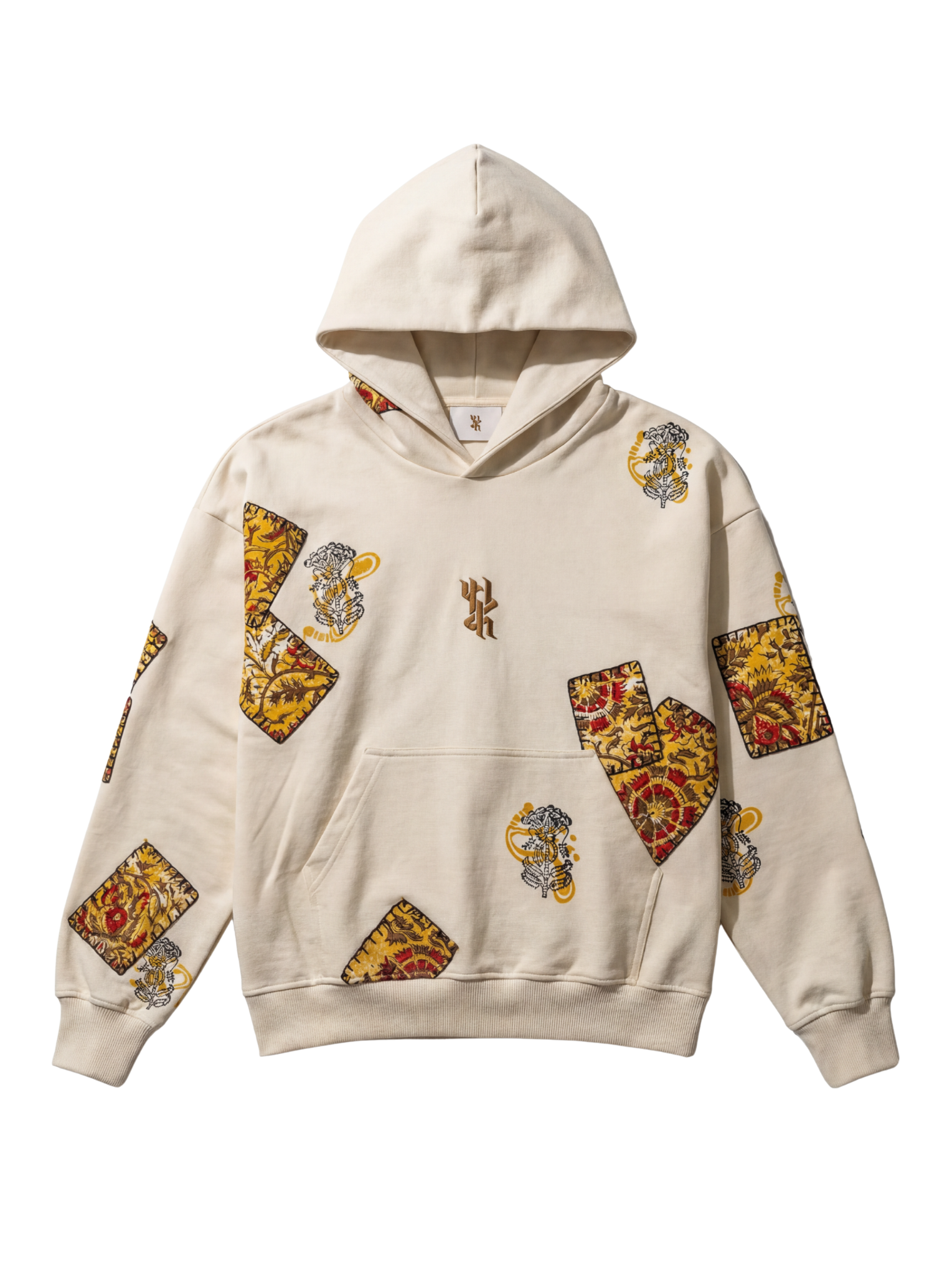 The Mustard Blockprinted Hoodie is crafted from 100% organic cotton, offering a soft, breathable feel while showcasing a vibrant blend of traditional artistry and modern streetwear. The hoodie features bold hand block–printed panels and motifs in rich mustard, red, and black tones, arranged across the sleeves, front, and hood to create a striking patchwork-like visual effect. Delicate hand embroidery detailing enhances each printed element, adding depth, texture, and a refined handcrafted finish. The central hand-embroidered logo gives the piece its signature touch, while the oversized silhouette, drop shoulders, and spacious kangaroo pocket add comfort and ease to the overall design. With its expressive colors, artisanal detailing, and contemporary relaxed fit, the Mustard Blockprinted Hoodie stands out as a unique fusion of culture, craftsmanship, and everyday wearability.