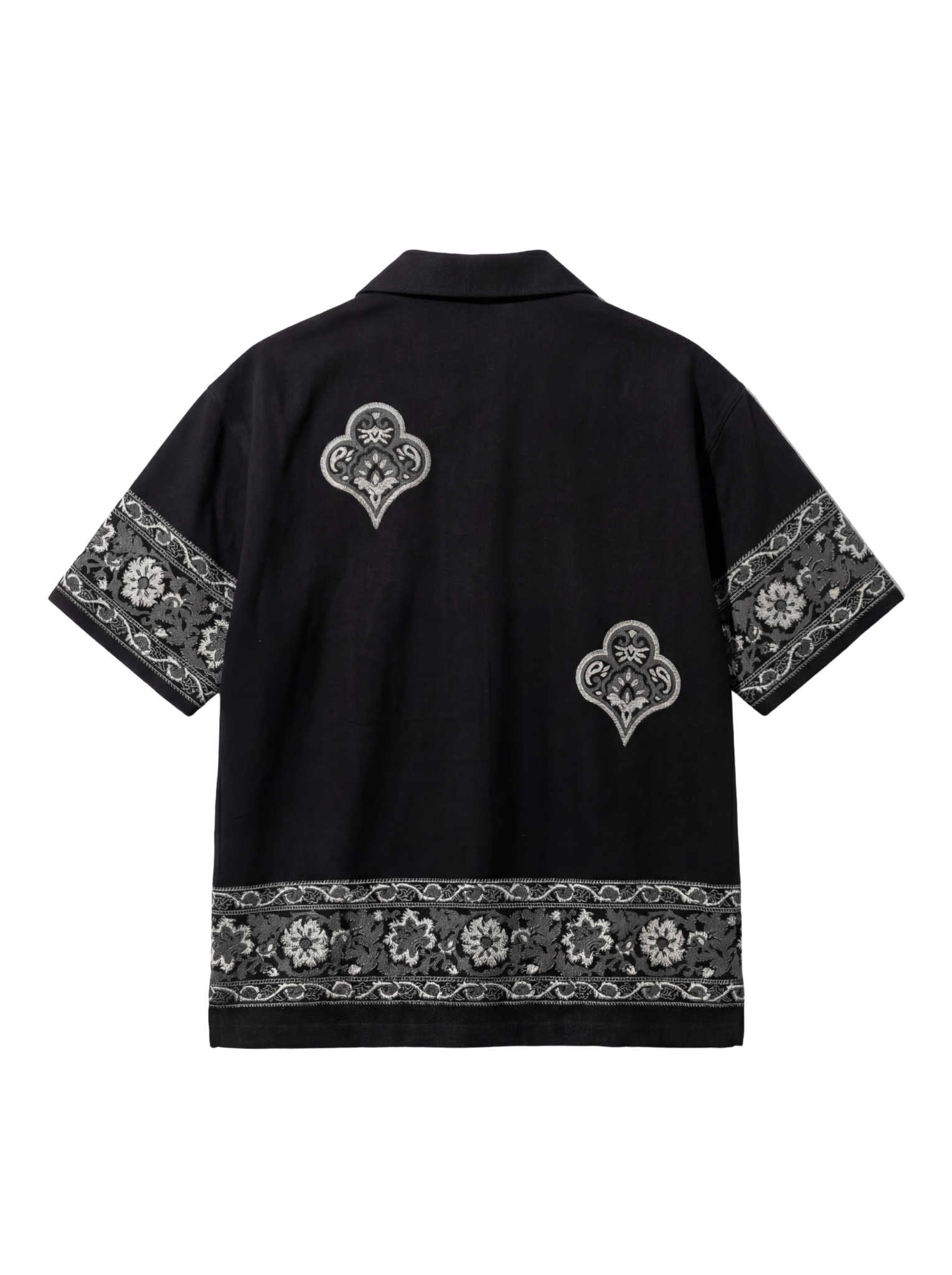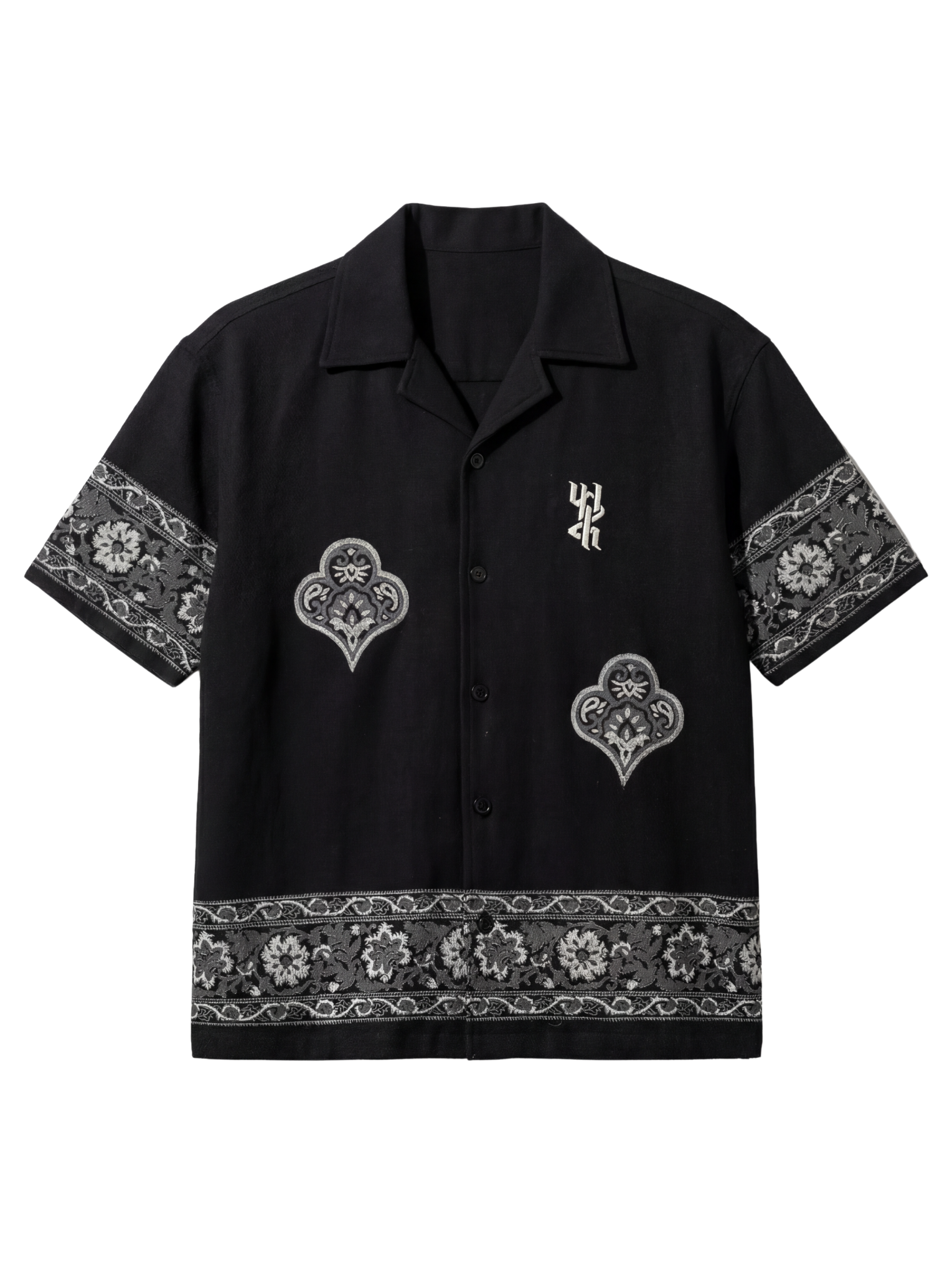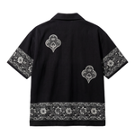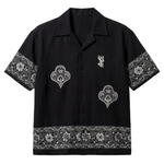 Crafted from 100% organic cotton, the Raatkala Handmade Shirt is woven on a traditional handloom over 12 meticulous hours, resulting in a rich, textured black fabric that sets the tone for its bold craftsmanship. The shirt features hand block printed floral and geometric borders along the sleeves and hem, created using heritage wooden blocks that lend a timeless character to the piece. The heart-shaped motifs seen across the front are also hand block printed, showcasing precise detailing and the charm of vintage block-carved forms. A hand-embroidered Farak emblem at the chest adds a subtle signature touch. Every element—from the placement of motifs to the depth of the prints—reflects the quiet intensity of nightfall, making this piece a refined blend of tradition, texture, and contemporary heritage.