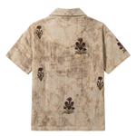 Crafted on 100% organic cotton, this shirt carries an earthy, uneven texture achieved through the traditional mud-resist technique, where natural dyes and hand-applied resist clay create organic patterns that cannot be replicated. The fabric becomes a canvas for age-old artistry as each motif is hand block printed using rare vintage wooden blocks sourced from Sanganer and Bagru, retaining their historic charm and imperfections. The piece is elevated with a meticulously hand-embroidered Farak logo, symbolising the precision and pride of our kaarigars. Woven over 12 dedicated hours, every inch of this shirt speaks of slow craftsmanship, mindful making, and the deep heritage woven into Rajasthan’s textile culture—making it a wearable story of tradition and artistry.
