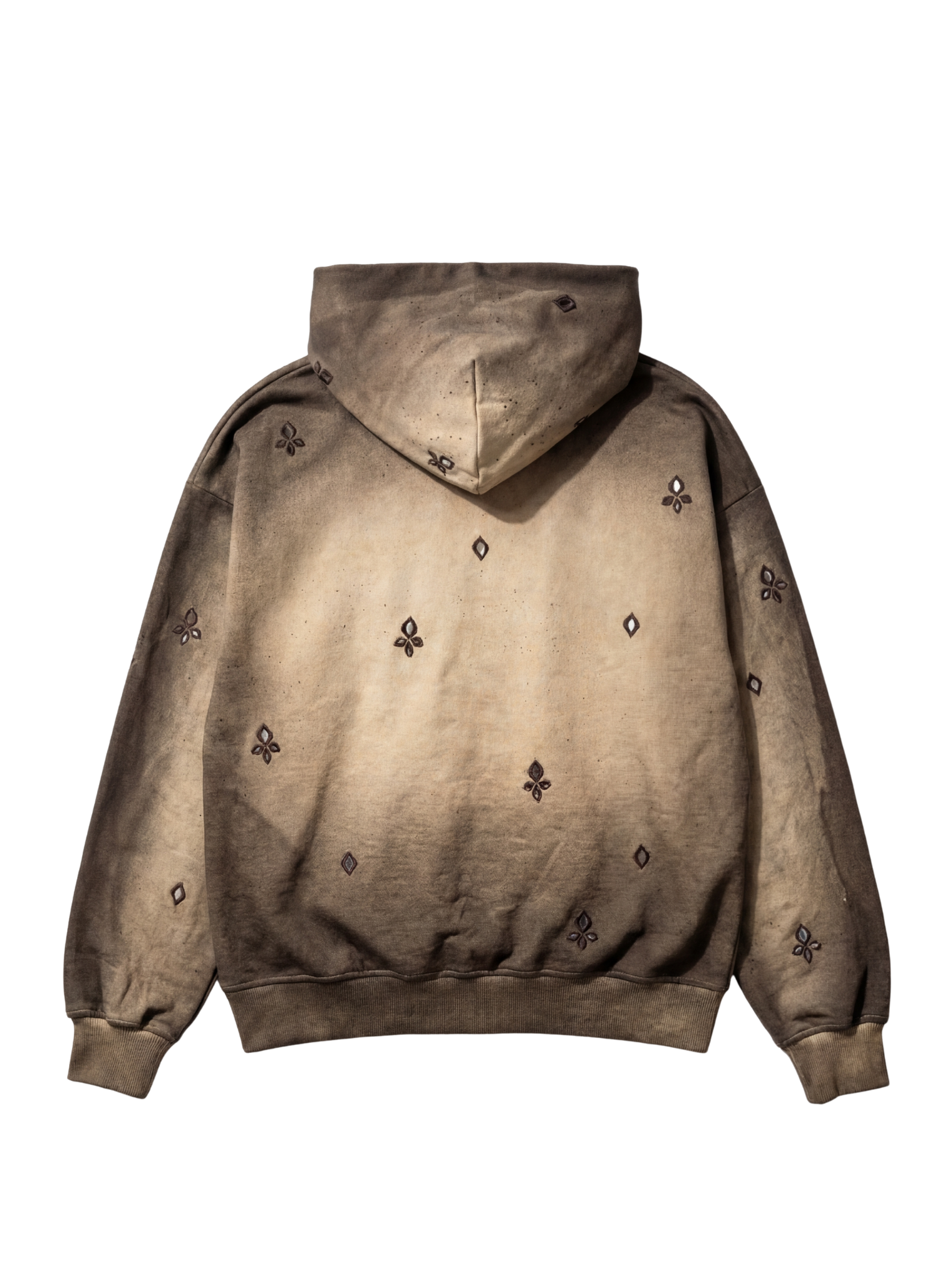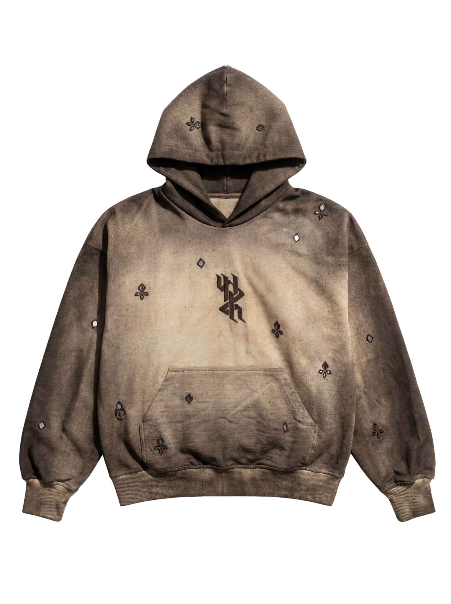 The ‘Sheesha’ Handmade Hoodie is crafted from 100% organic cotton and showcases a rich combination of traditional dyeing and meticulous hand-embellishment techniques. The garment features a Dabu resist-dyed base, creating a beautifully earthy gradient that shifts from deep brown to warm sand tones, enhanced by spray-printed textures that add depth and a weathered, artistic finish. Scattered across the hoodie are small mirror hand-embroidered motifs, each reflecting light subtly and giving the piece its signature “sheesha” character. The central hand-embroidered logo adds a refined focal point, while the relaxed silhouette and kangaroo pocket keep the design functional and contemporary. With over 18 hours of weaving and handcrafting poured into its creation, the Sheesha Hoodie stands as a unique blend of heritage craftsmanship, modern streetwear aesthetic, and wearable art.