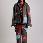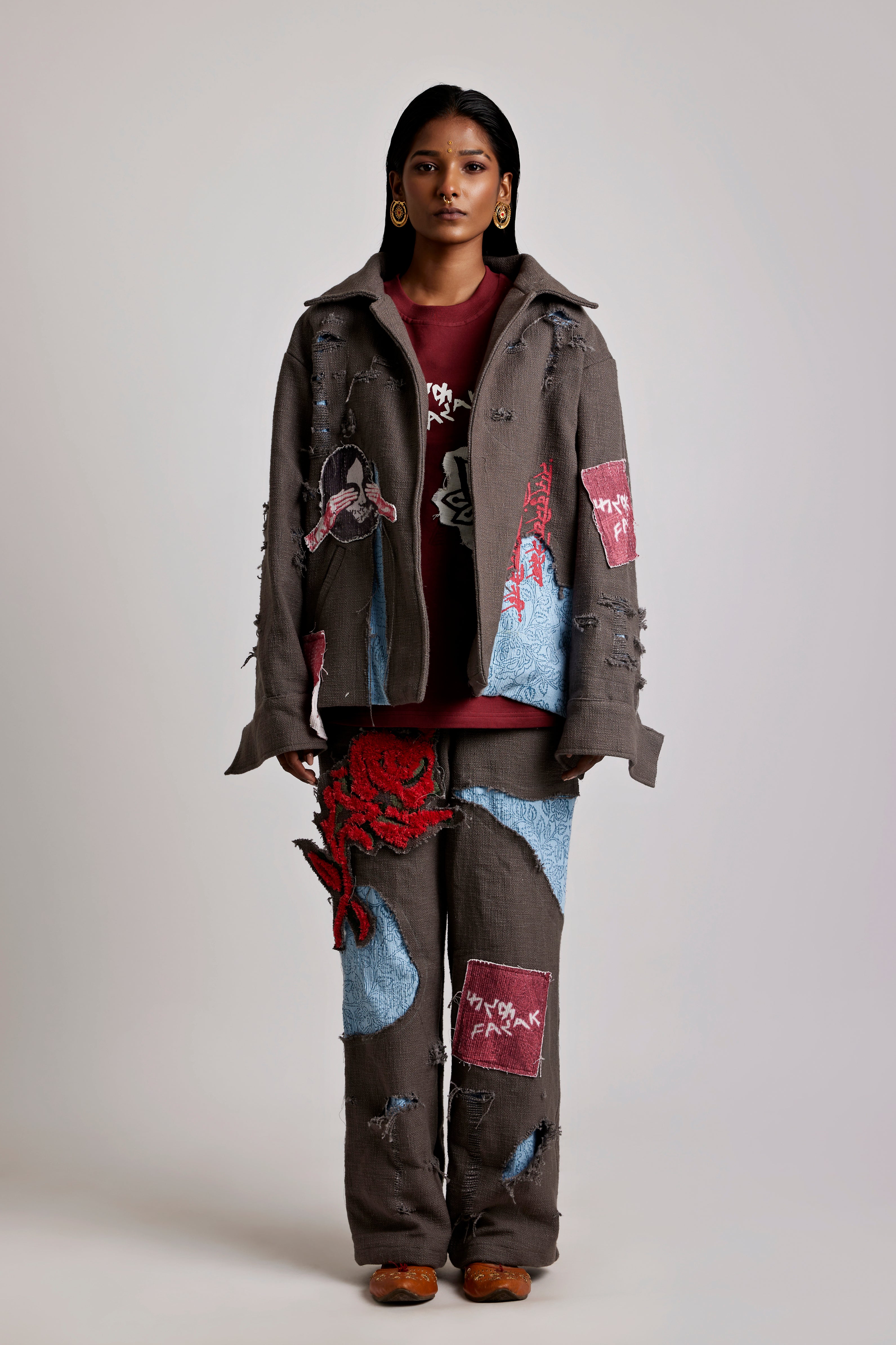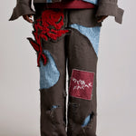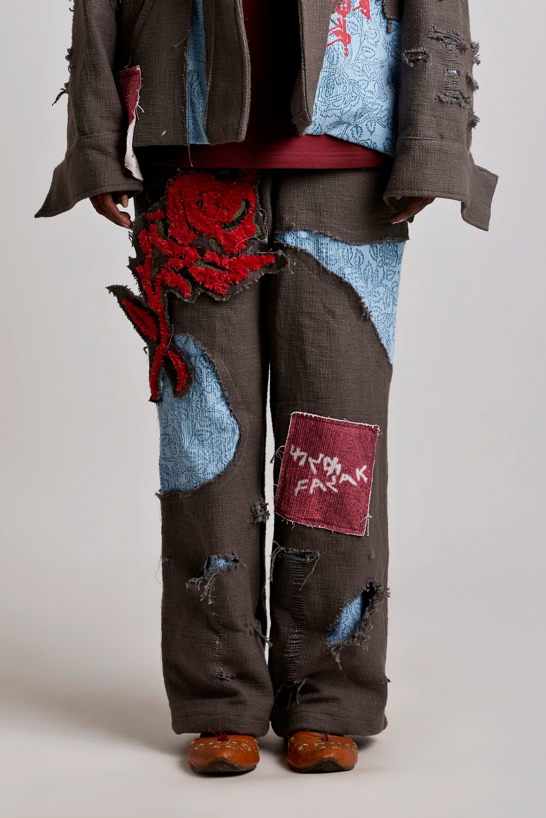 The Pant holds a special place in Farak's collection, embodying the art of storytelling inspired by the poignant lines, "taj duniya ne dekha hai, Mumtaz ne nhi". It skillfully captures the essence of this enduring love tale in its distressed fabric, serving as a canvas for the passage of time and history. Adorned with meticulously crafted patches, including a hand-embroidered flower symbolizing love on the back and a blue patch reminiscent of the Taj Mahal's silhouette, the pant pays homage to the timeless romance of Shah Jahan and Mumtaz.