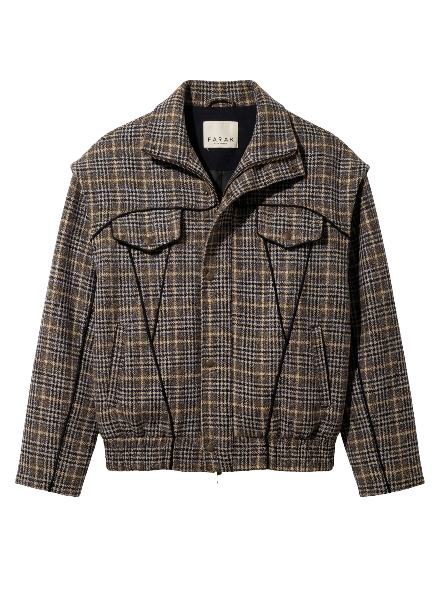 .The Plaid Bomber Jacket stands out with its bold, exaggerated shoulder design, giving it a structured and confident silhouette that instantly elevates the overall look. Crafted in a rich, textured plaid fabric, the jacket blends earthy tones with classic patterning, making it both visually striking and timeless. It features a dual-closure front combining a smooth zipper and secure snap buttons, ensuring both style and practicality. Further enhancing its modern appeal, the zipper detailing on the sleeves adds a sharp, contemporary touch. With clean seam lines, spacious pockets, and a well-built form, this jacket offers a perfect balance of durability, warmth, and statement-making design, ideal for those who want their winter wear to feel refined, premium, and effortlessly standout.