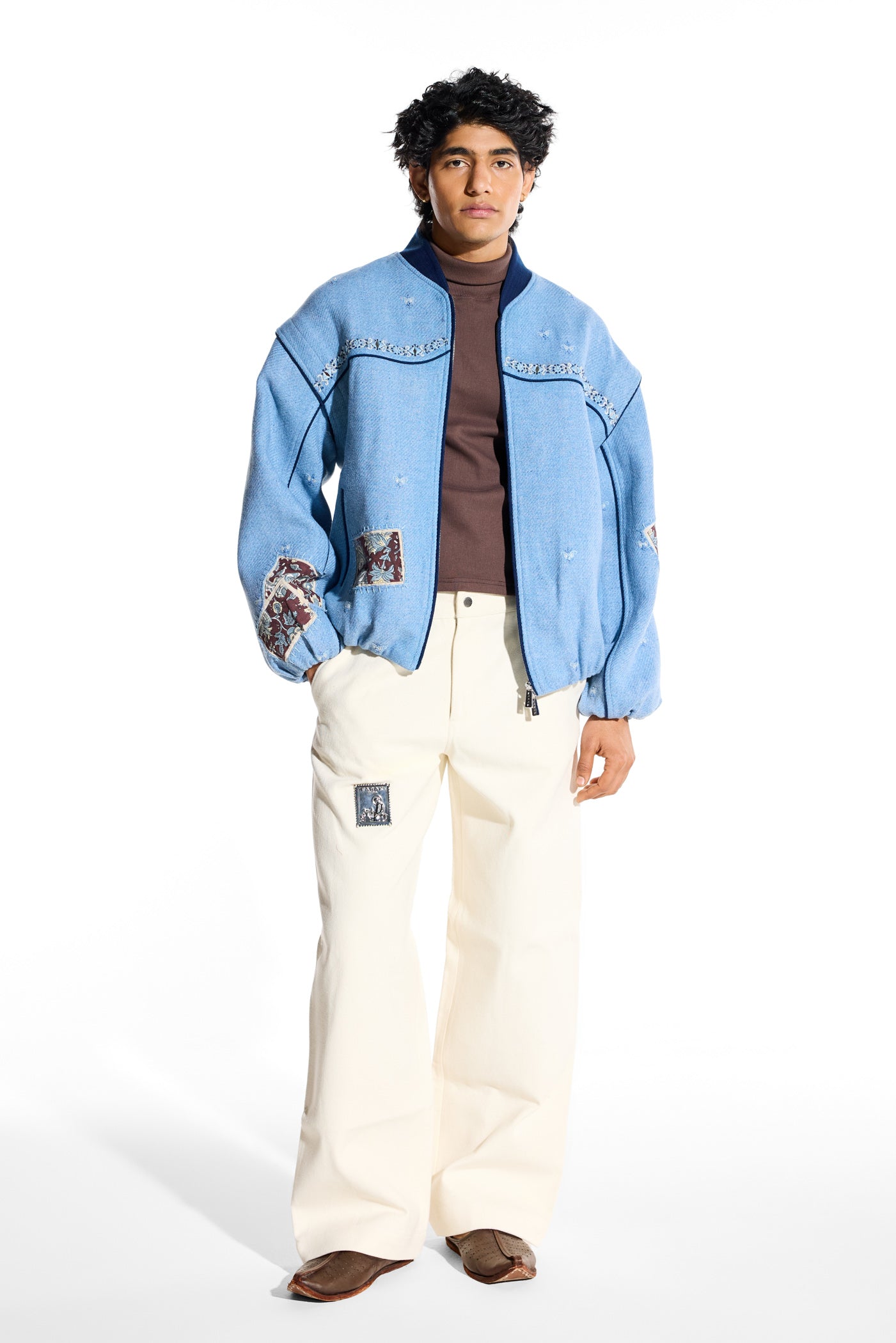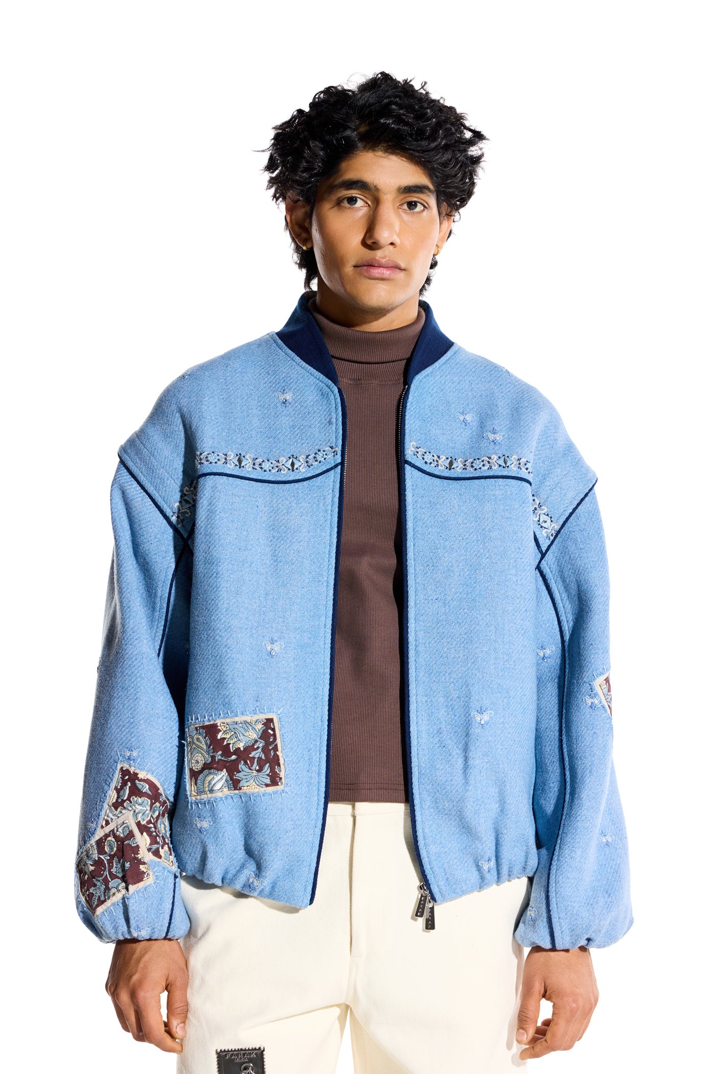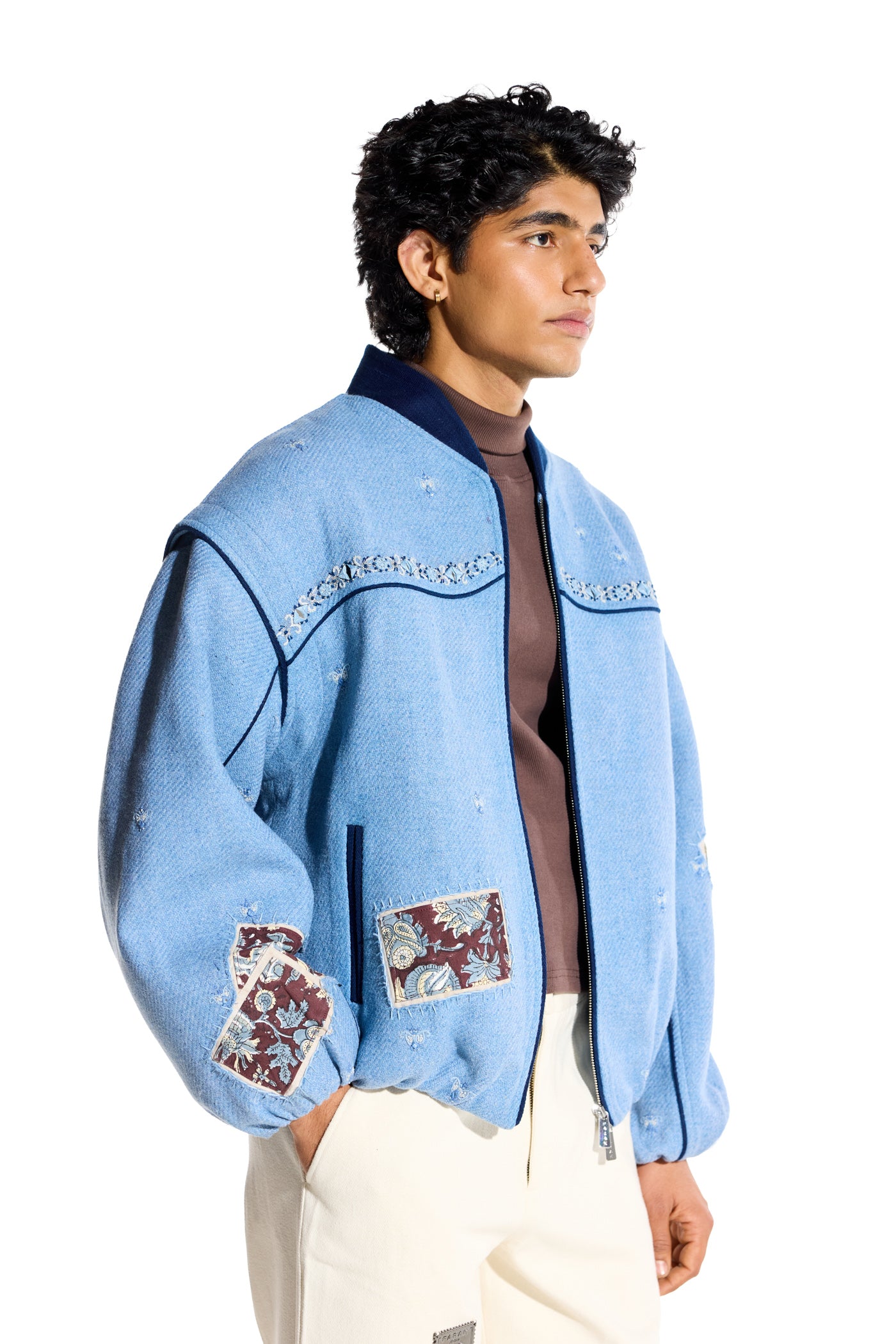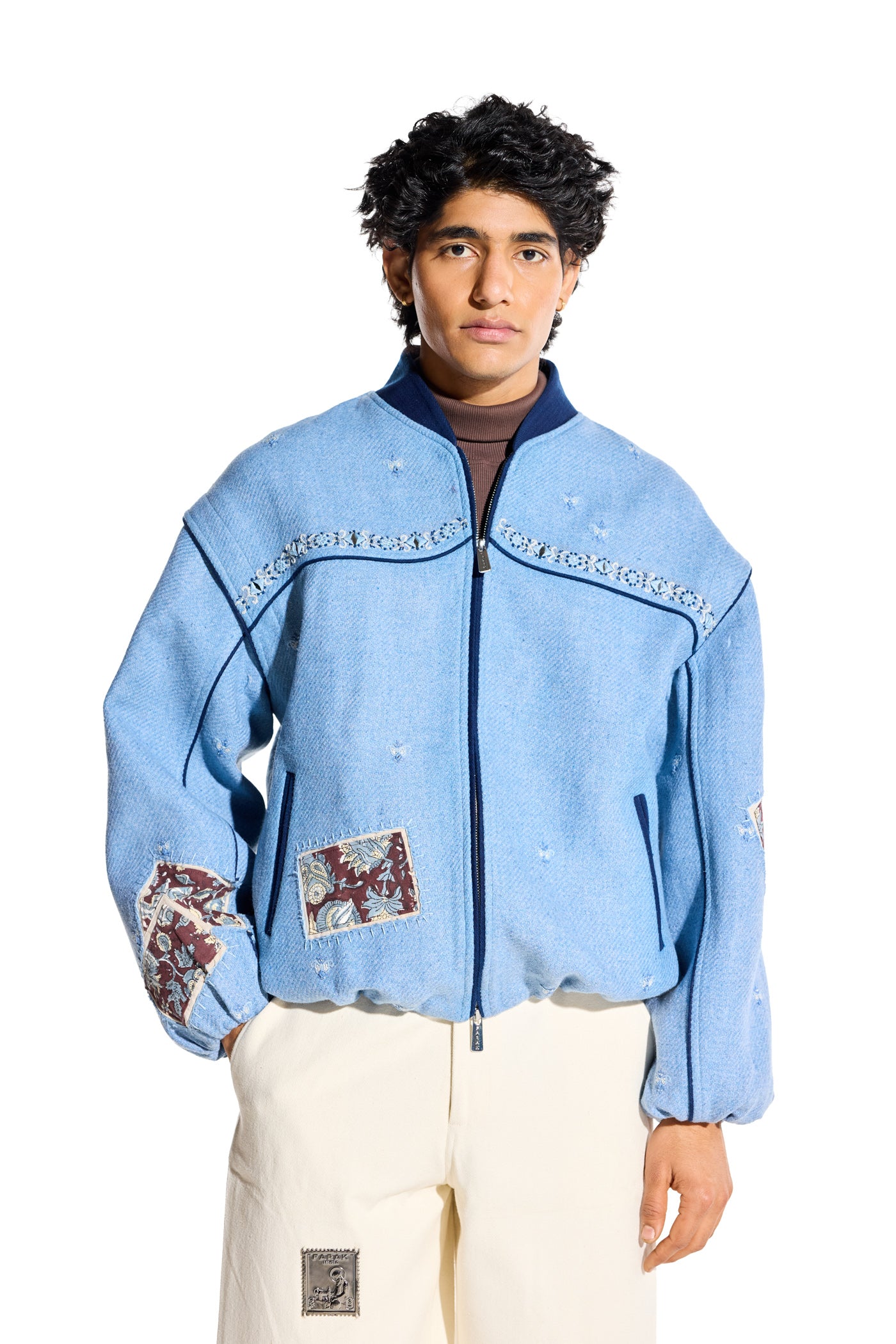 The Remnant Bomber Jacket is a tactile study of restraint, texture, and handcraft, made from 100% wool and shaped through 16 hours of skilled artisanal work. The jacket features a soft, naturally toned blue surface with a gently structured, relaxed unisex silhouette, finished with ribbed hems that lend the bomber its classic form. Subtle hand embroidery is scattered across the body, adding quiet detail and depth, while handprinted wooden block patches—notably on the sleeves—introduce contrast, narrative, and visible repair-inspired character. A clean zipper closure keeps the design functional and contemporary, balanced by the understated presence of a FARAK brass logo tag. Rooted in slow fashion and intentional imperfection, the Remnant Bomber Jacket stands as a wearable artifact shaped by time, touch, and thoughtful design.