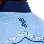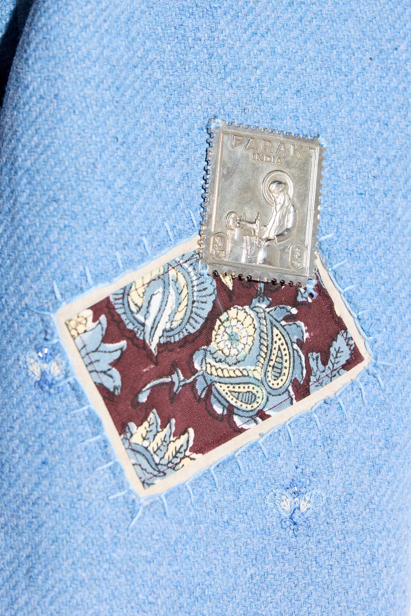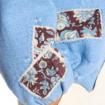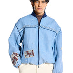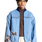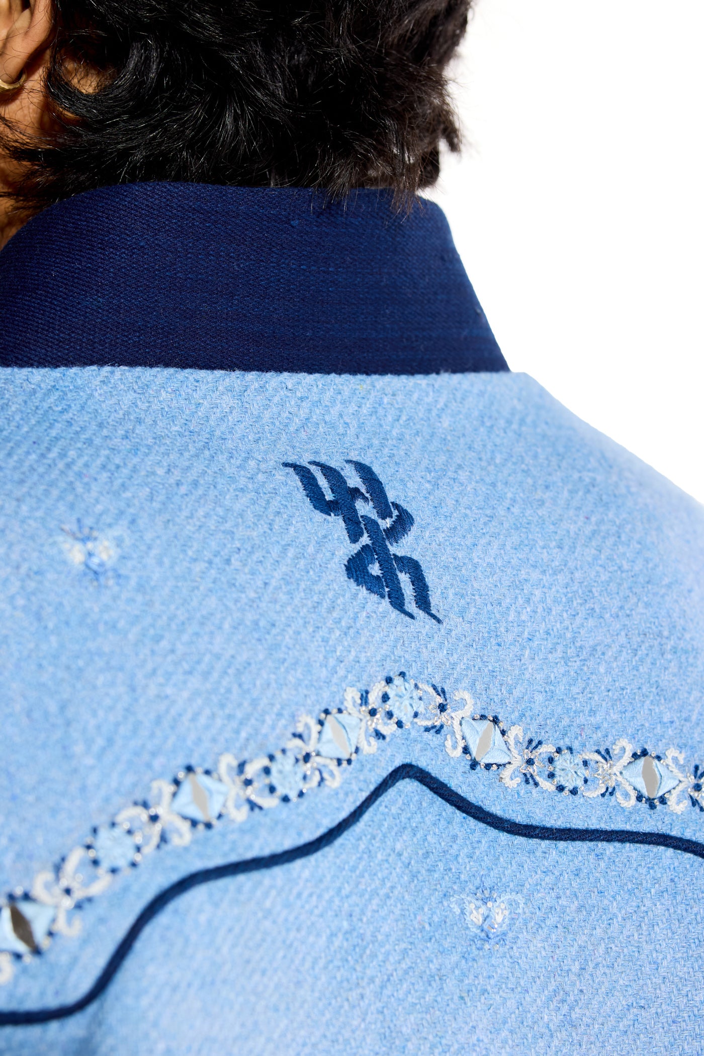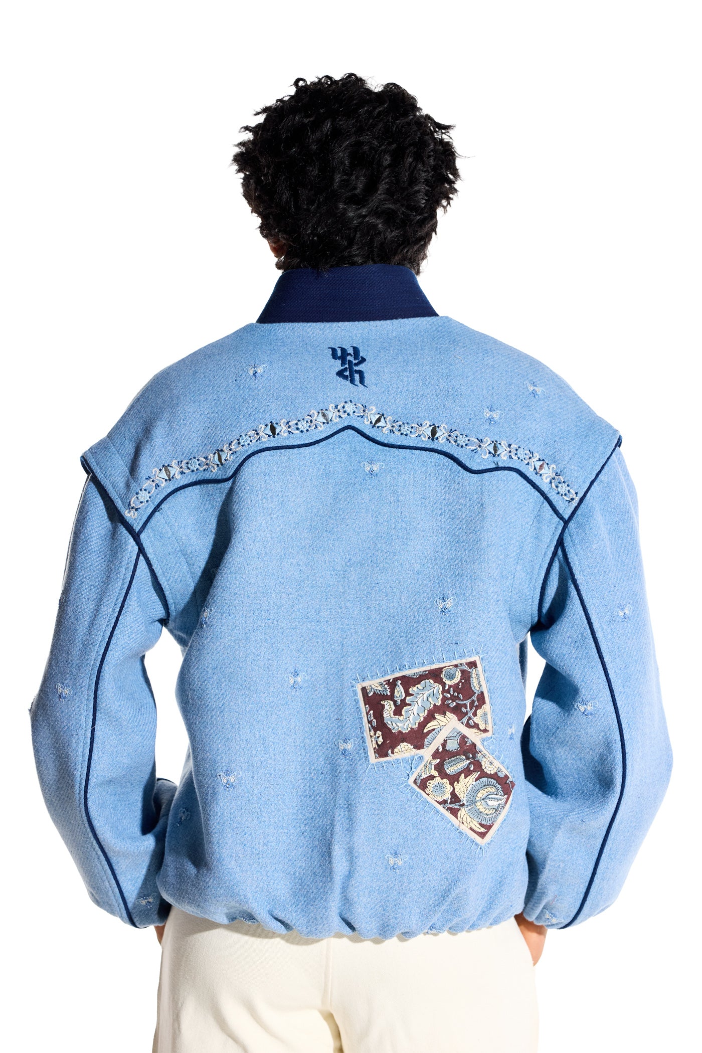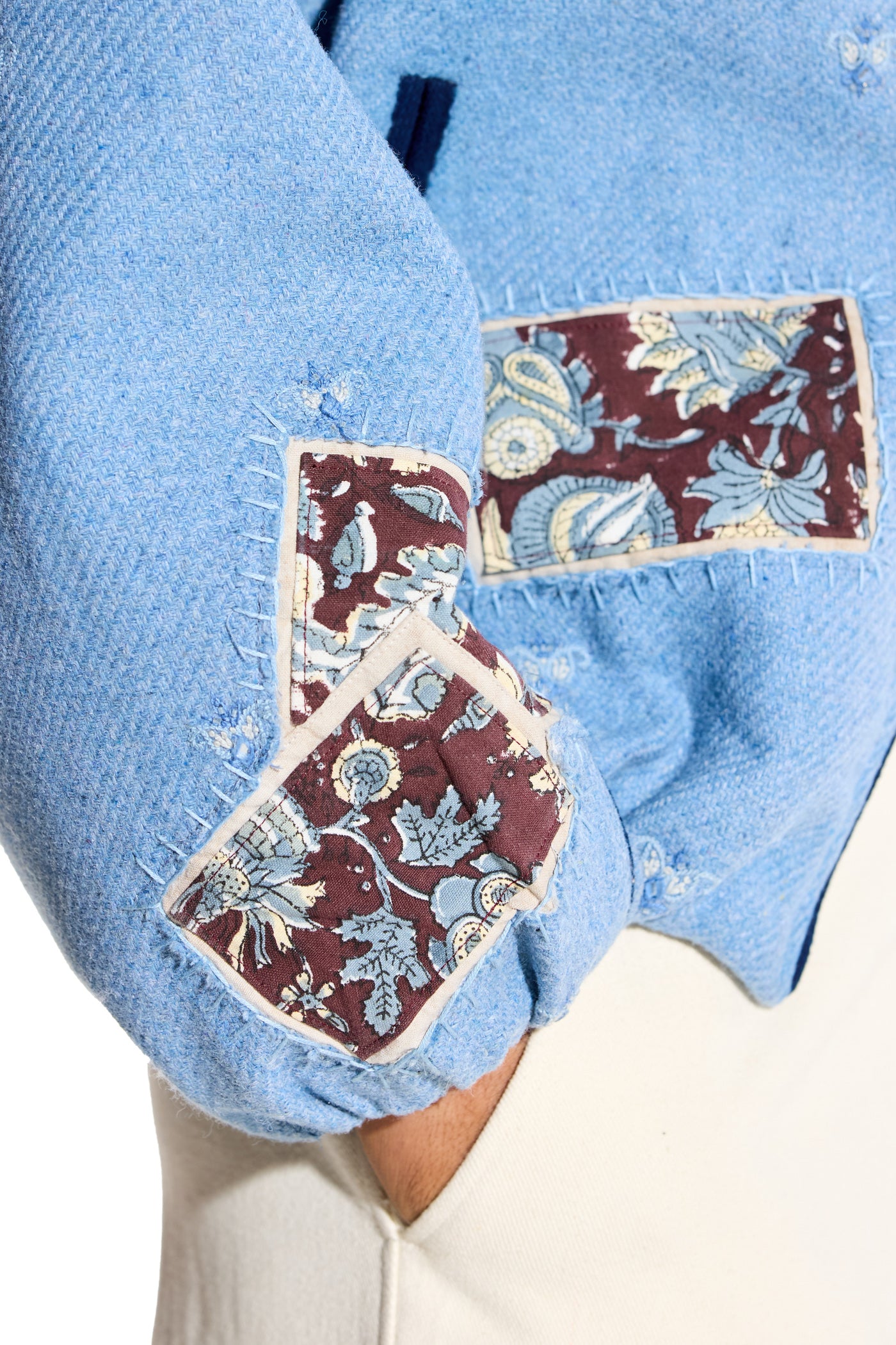 The Remnant Bomber Jacket is a tactile study of restraint, texture, and handcraft, made from 100% wool and shaped through 16 hours of skilled artisanal work. The jacket features a soft, naturally toned blue surface with a gently structured, relaxed unisex silhouette, finished with ribbed hems that lend the bomber its classic form. Subtle hand embroidery is scattered across the body, adding quiet detail and depth, while handprinted wooden block patches—notably on the sleeves—introduce contrast, narrative, and visible repair-inspired character. A clean zipper closure keeps the design functional and contemporary, balanced by the understated presence of a FARAK brass logo tag. Rooted in slow fashion and intentional imperfection, the Remnant Bomber Jacket stands as a wearable artifact shaped by time, touch, and thoughtful design.