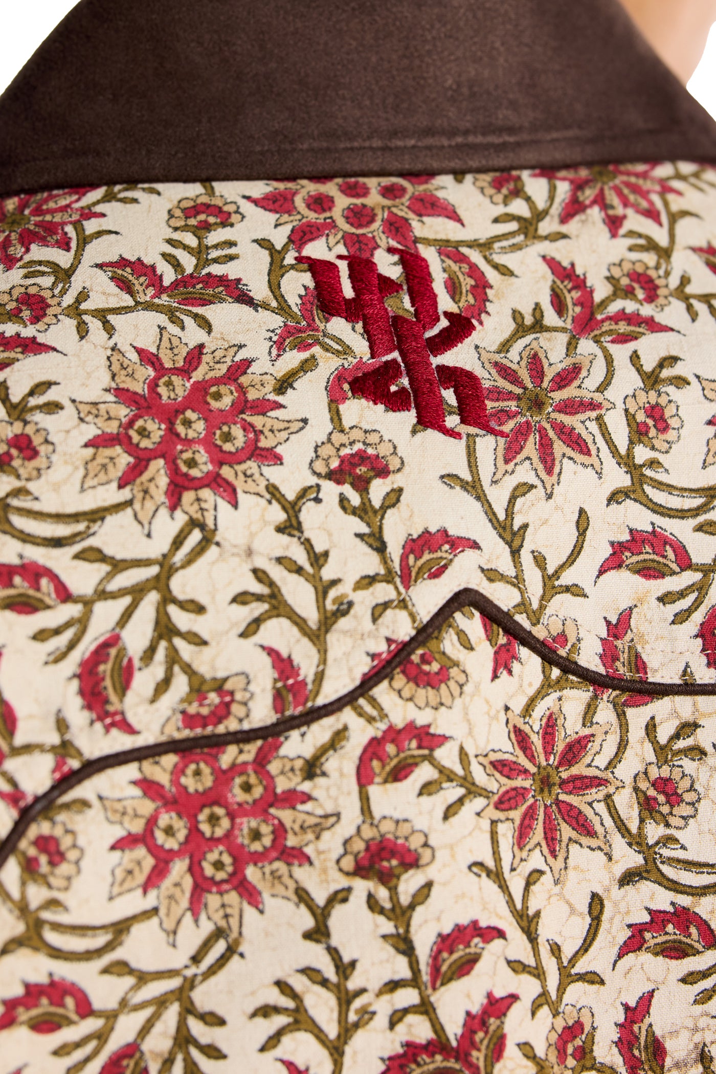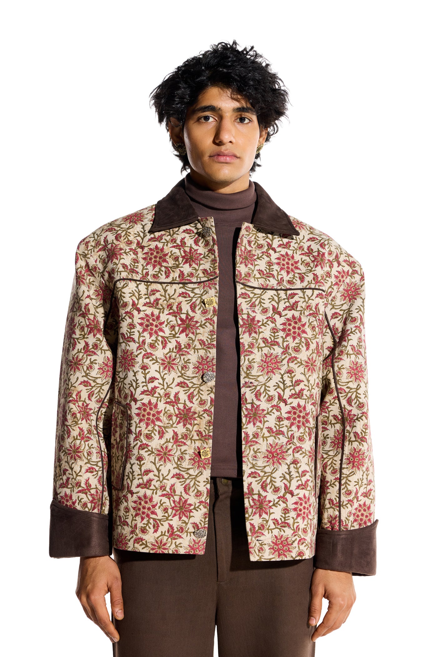 The Yaadon Ka Baag Jacket is a quiet celebration of memory and craft, crafted from 100% organic cotton and shaped through 24 hours of handweaving. Dyed using natural pigments, the jacket features a warm, time-worn base brought to life with handprinted floral motifs created using traditional wooden blocks, evoking the feeling of a preserved garden of memories. The surface carries a gentle rhythm of repetition and variation, highlighting the organic nature of the printing process. Designed in a relaxed unisex silhouette, the jacket balances softness with structure, finished with brass snap buttons and a subtle FARAK metal tag for a refined, utilitarian touch. Each piece stands as an expression of slow fashion—where heritage techniques, natural materials, and thoughtful restraint come together in wearable form.Key Highlights: Unisex Relaxed Fit 100% Organic Cotton FARAK Metal Tag Brass Snap Buttons Handwoven and Natural Dye Handprinted Using Wooden Blocks Note: This piece is entirely made by hand using traditional methods in a very limited quantity. Therefore it will never be restocked once sold out.