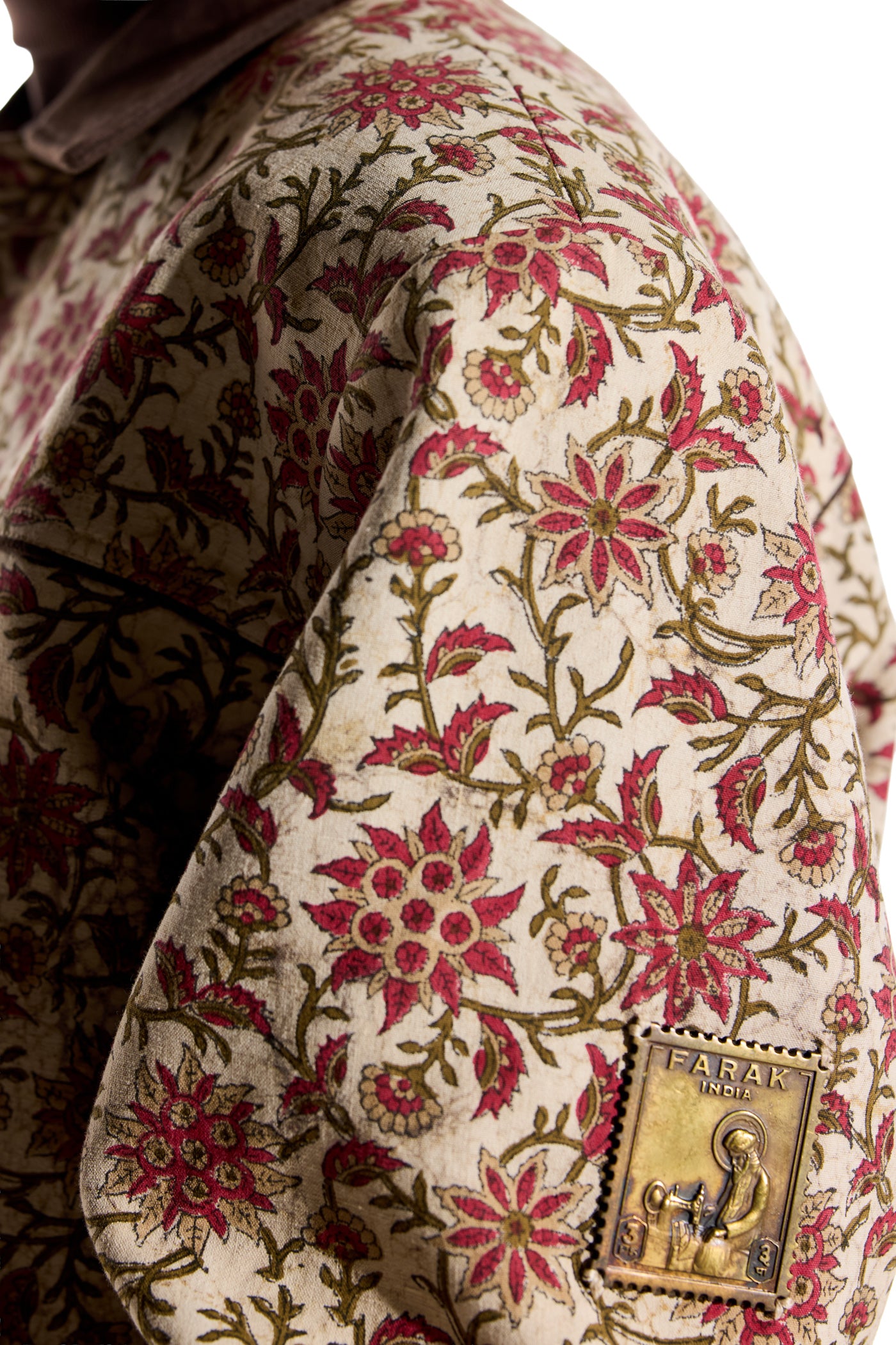 The Yaadon Ka Baag Jacket is a quiet celebration of memory and craft, crafted from 100% organic cotton and shaped through 24 hours of handweaving. Dyed using natural pigments, the jacket features a warm, time-worn base brought to life with handprinted floral motifs created using traditional wooden blocks, evoking the feeling of a preserved garden of memories. The surface carries a gentle rhythm of repetition and variation, highlighting the organic nature of the printing process. Designed in a relaxed unisex silhouette, the jacket balances softness with structure, finished with brass snap buttons and a subtle FARAK metal tag for a refined, utilitarian touch. Each piece stands as an expression of slow fashion—where heritage techniques, natural materials, and thoughtful restraint come together in wearable form.