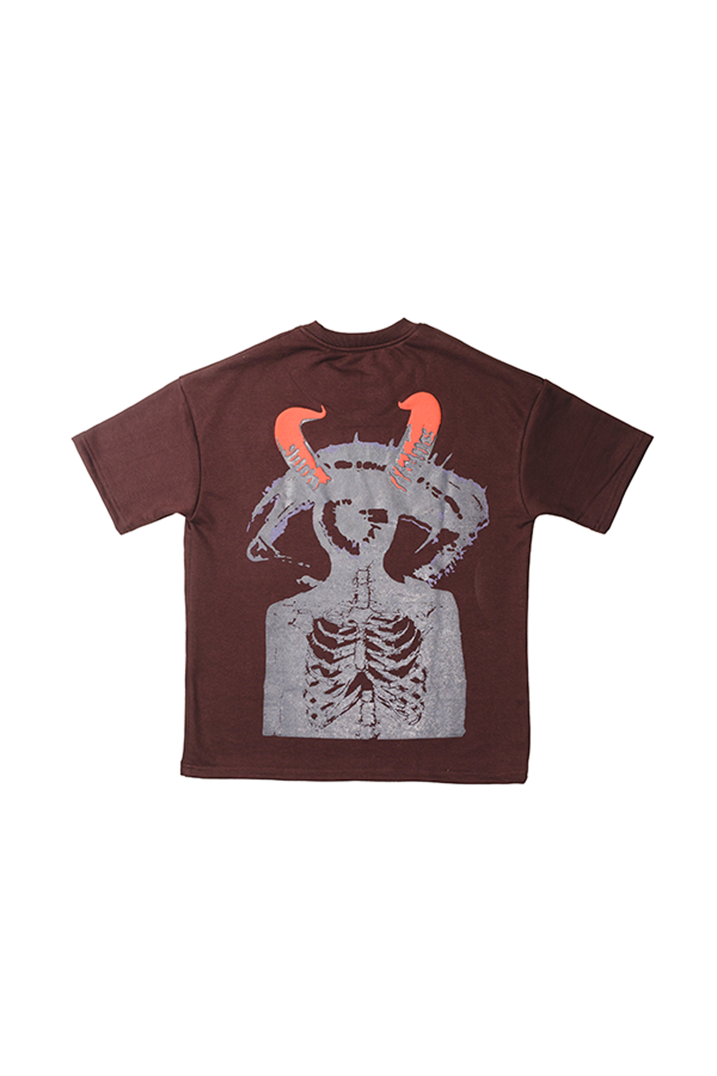 The design features a sketch portraying a figure with horns, symbolizing the inherent evil within. Unique within our collection, this garment reflects the creative director's personal journey and holds a special place, imbued with a sense of favouritism and authenticity.