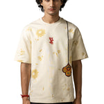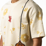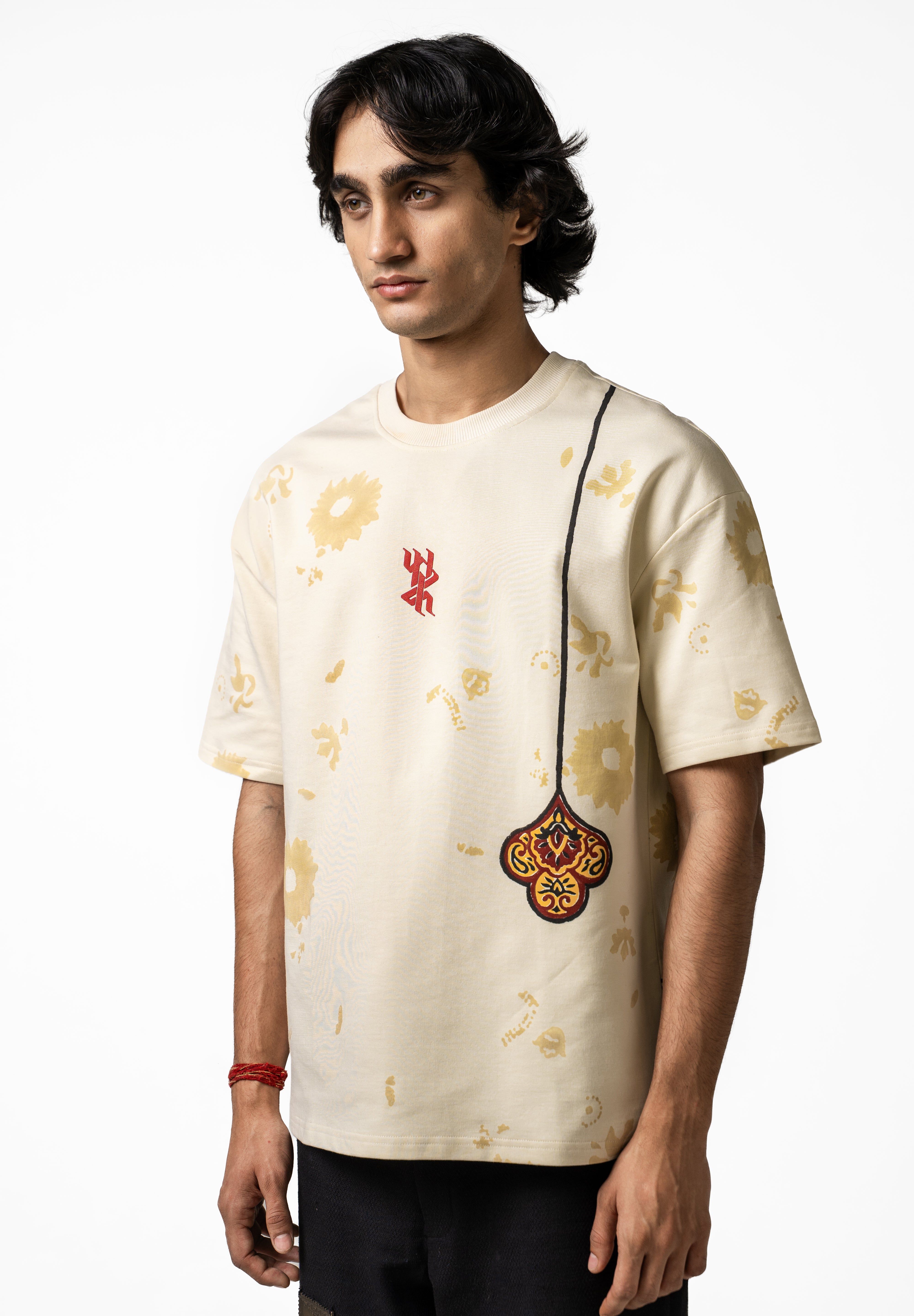 Crafted in 100% organic cotton, the “Jugnoo” T-shirt captures the charm of heritage craft through delicate hand block printing using old vintage wooden blocks that carry years of artisanal history. The soft cream base is scattered with subtle mustard block-printed florals and abstract motifs, creating a gentle, sun-washed effect inspired by firefly trails. A striking embroidered Farak emblem sits at the chest, while a bold, embroidered hanging ornament motif on the right side adds a standout visual detail that anchors the design. With 8 hours of dedicated weaving and printing, this piece blends comfort with storytelling—an ode to light, tradition, and the quiet beauty of handcrafted clothing.