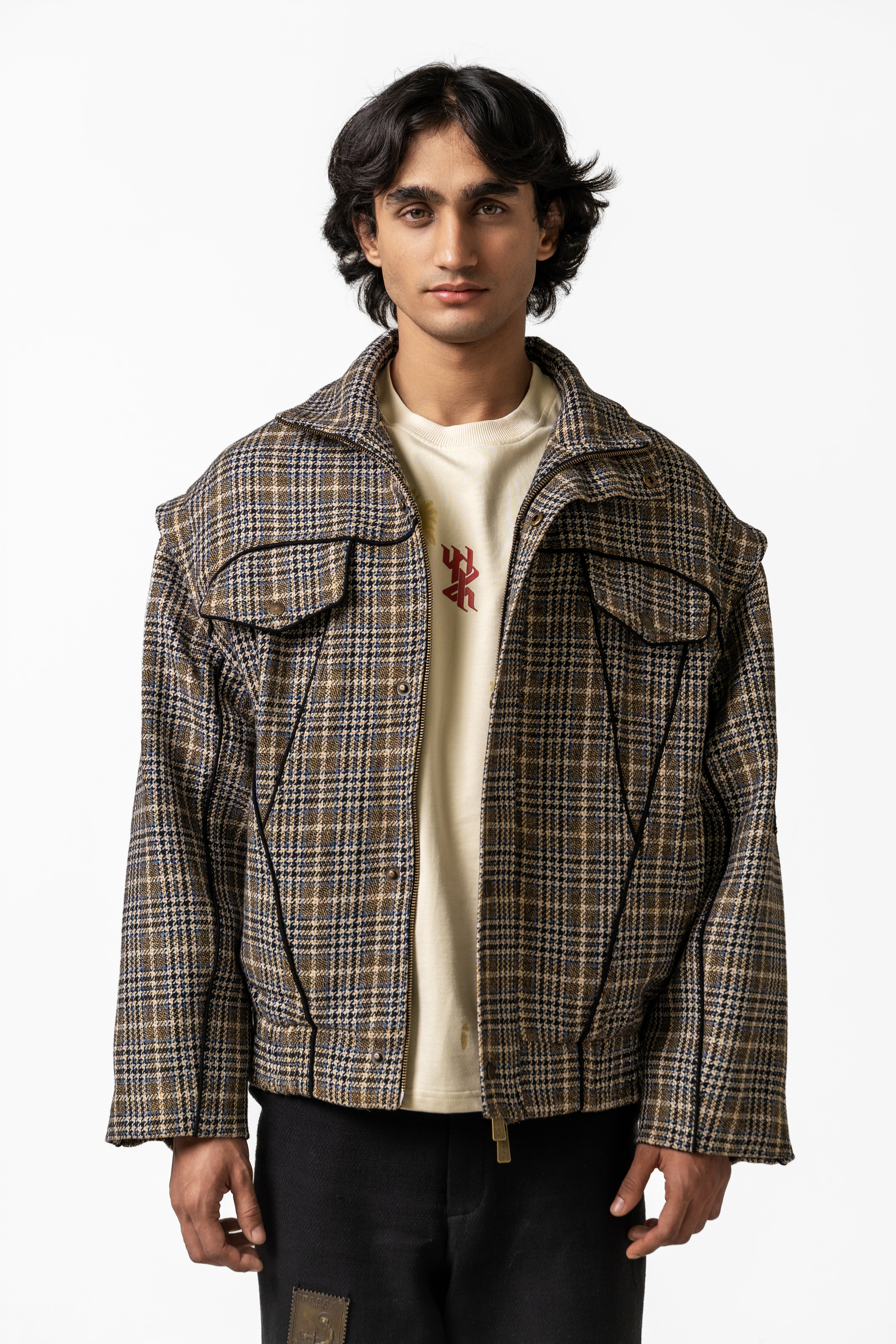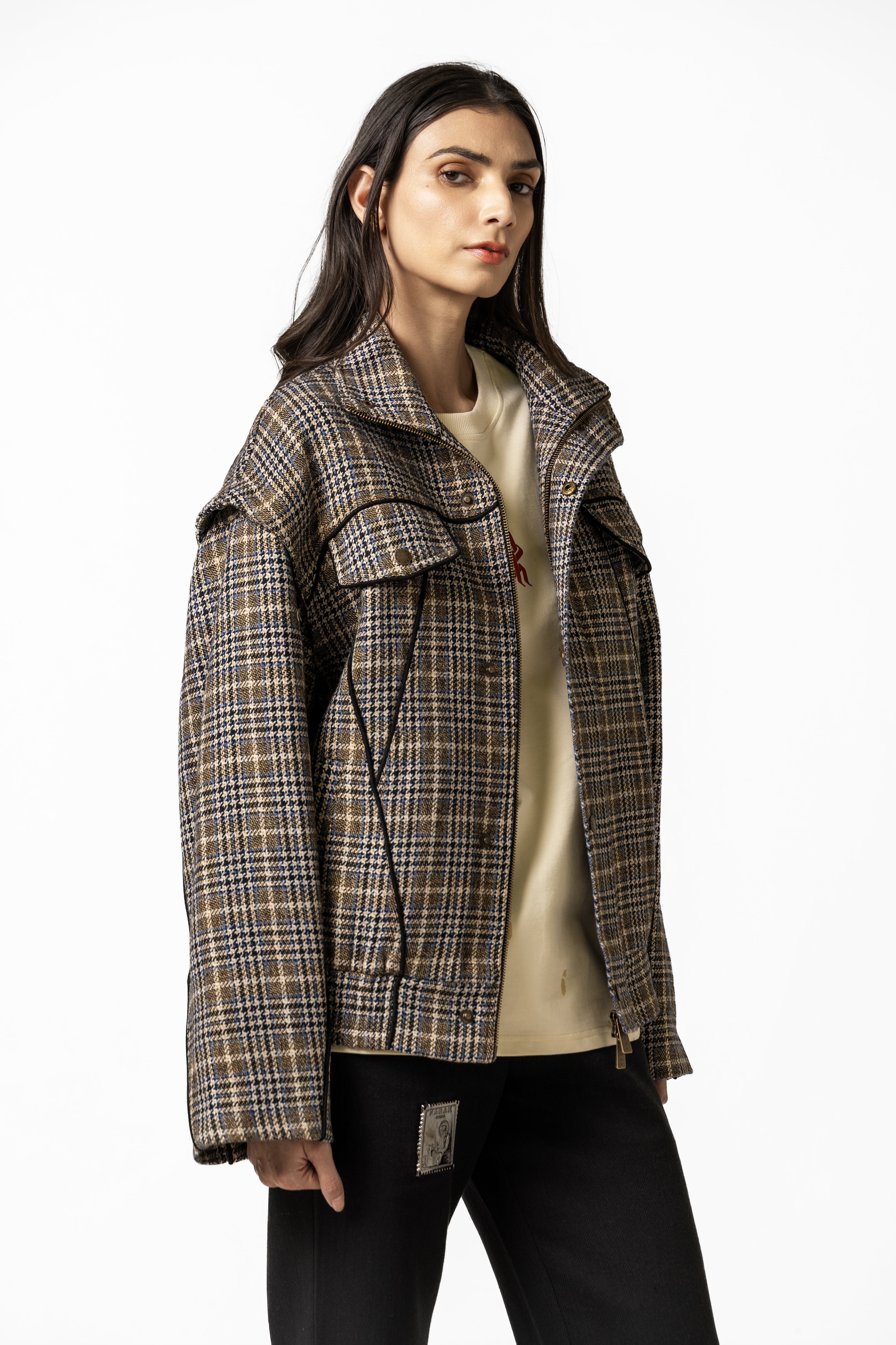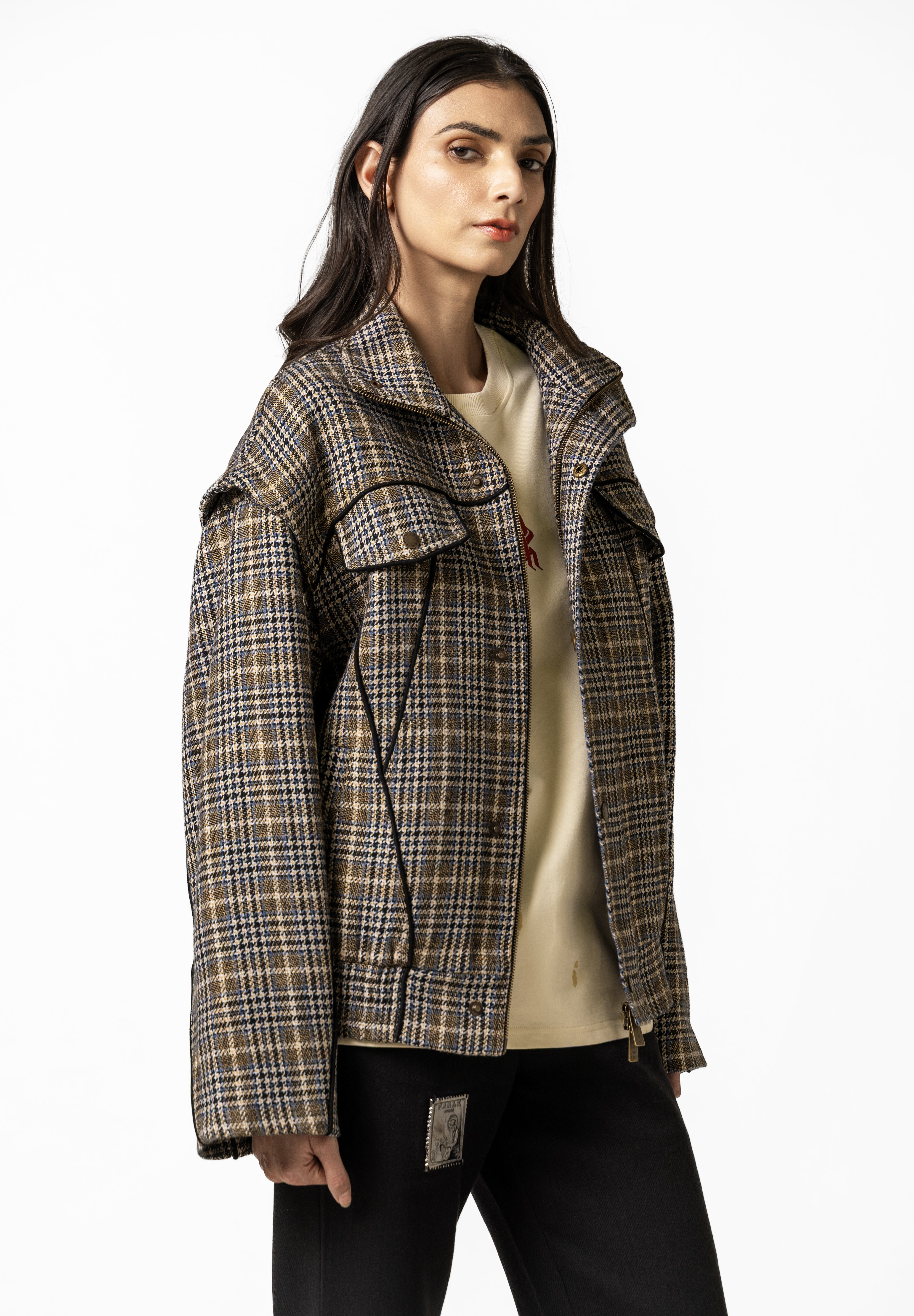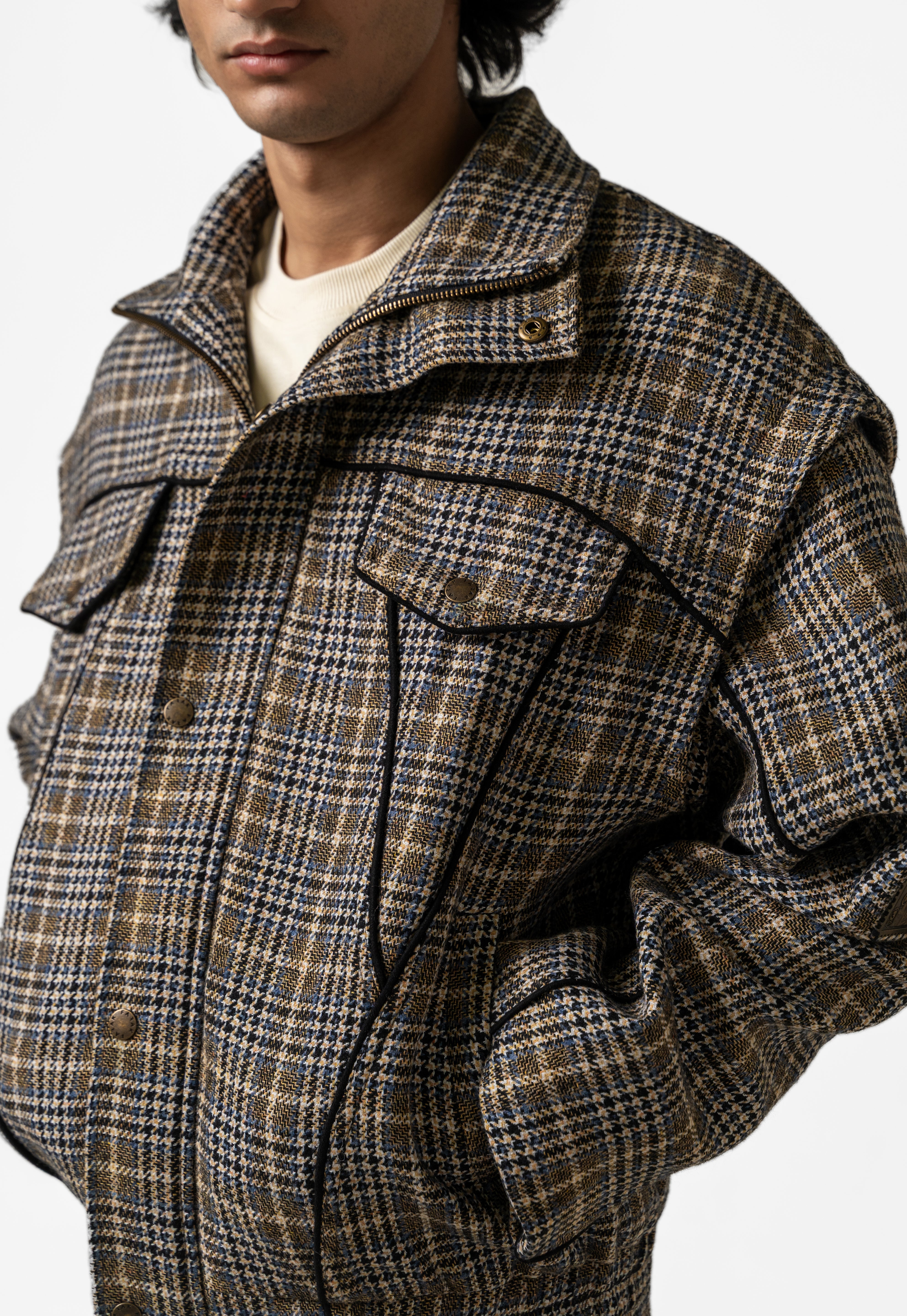 .The Plaid Bomber Jacket stands out with its bold, exaggerated shoulder design, giving it a structured and confident silhouette that instantly elevates the overall look. Crafted in a rich, textured plaid fabric, the jacket blends earthy tones with classic patterning, making it both visually striking and timeless. It features a dual-closure front combining a smooth zipper and secure snap buttons, ensuring both style and practicality. Further enhancing its modern appeal, the zipper detailing on the sleeves adds a sharp, contemporary touch. With clean seam lines, spacious pockets, and a well-built form, this jacket offers a perfect balance of durability, warmth, and statement-making design, ideal for those who want their winter wear to feel refined, premium, and effortlessly standout.