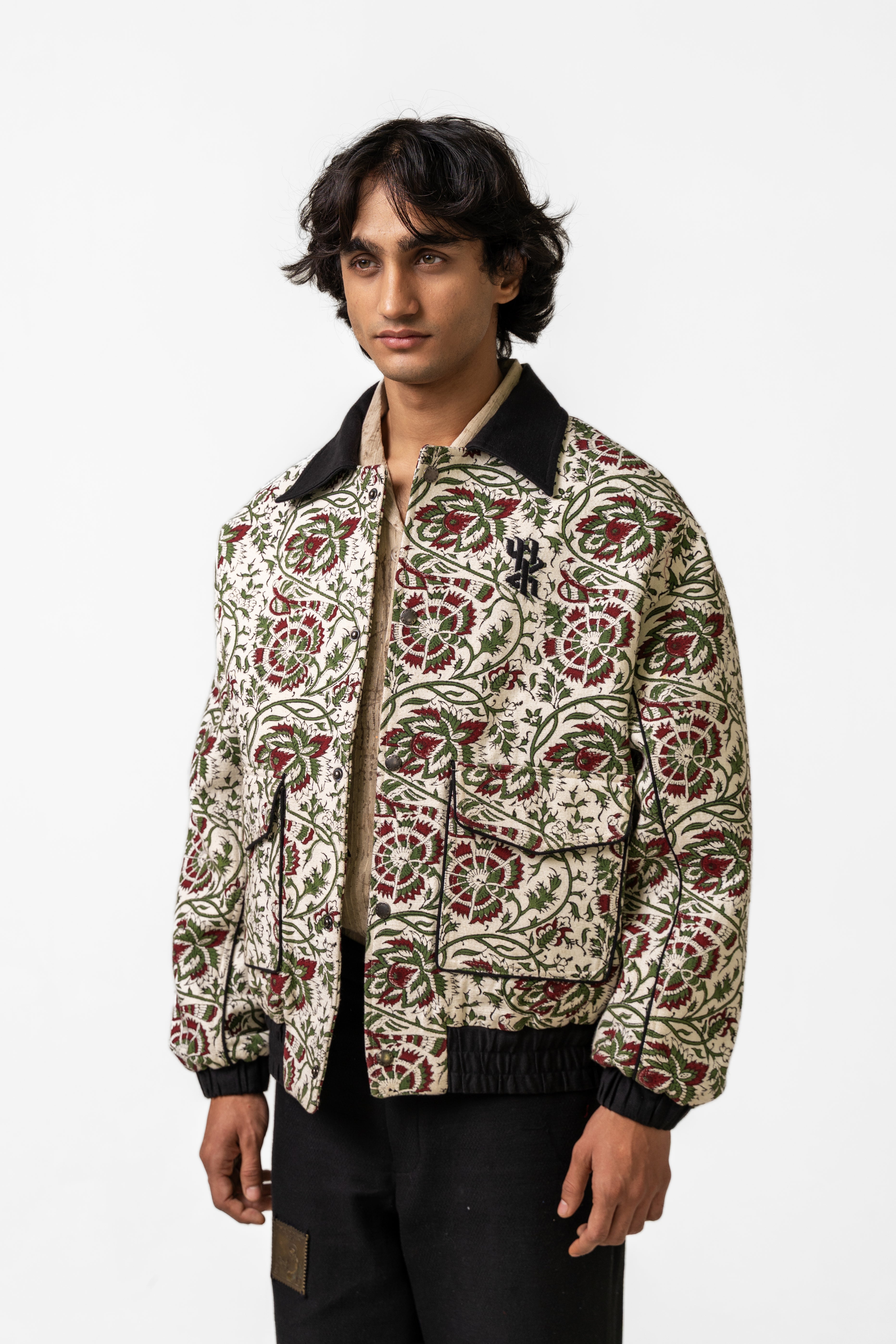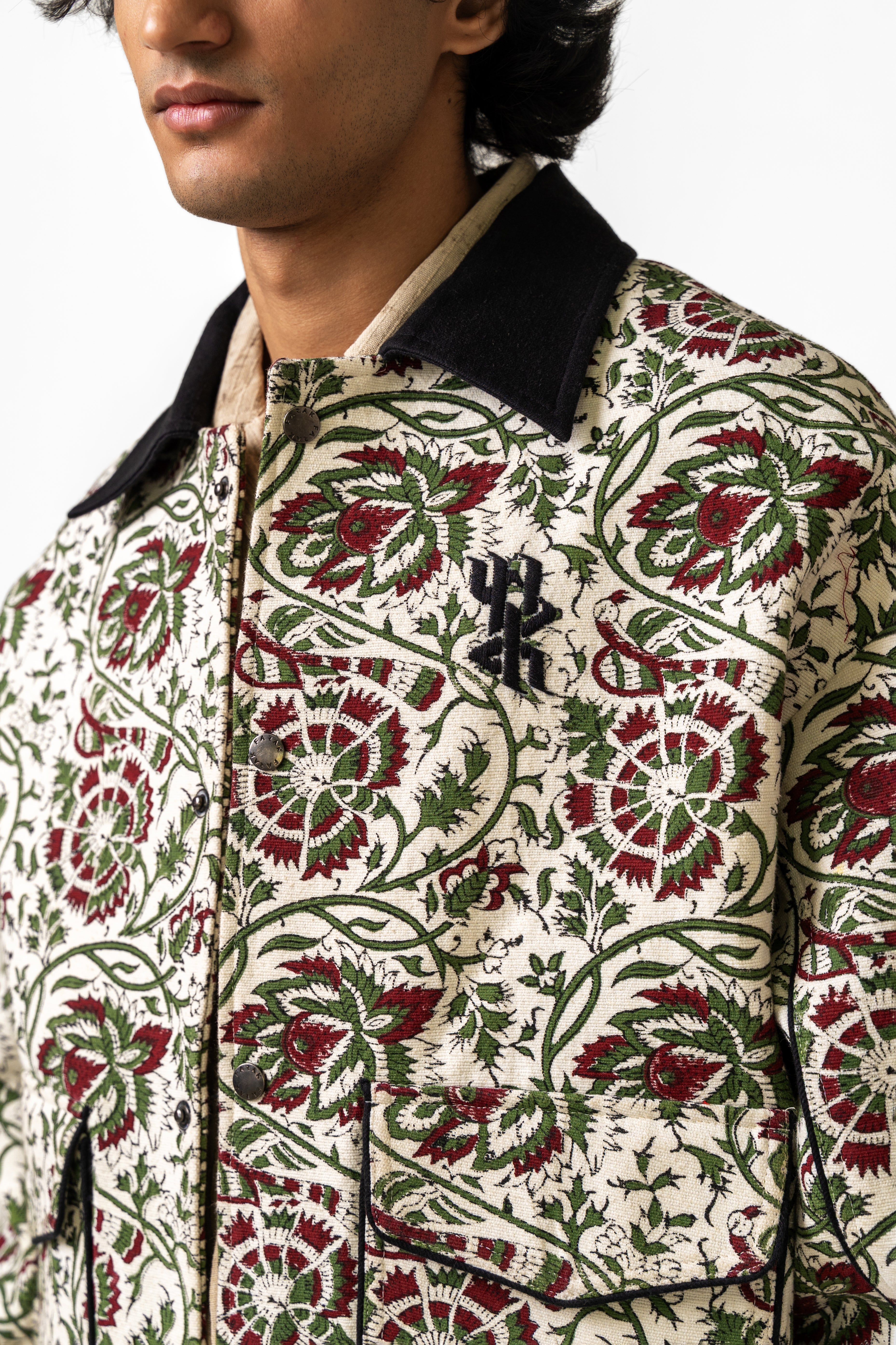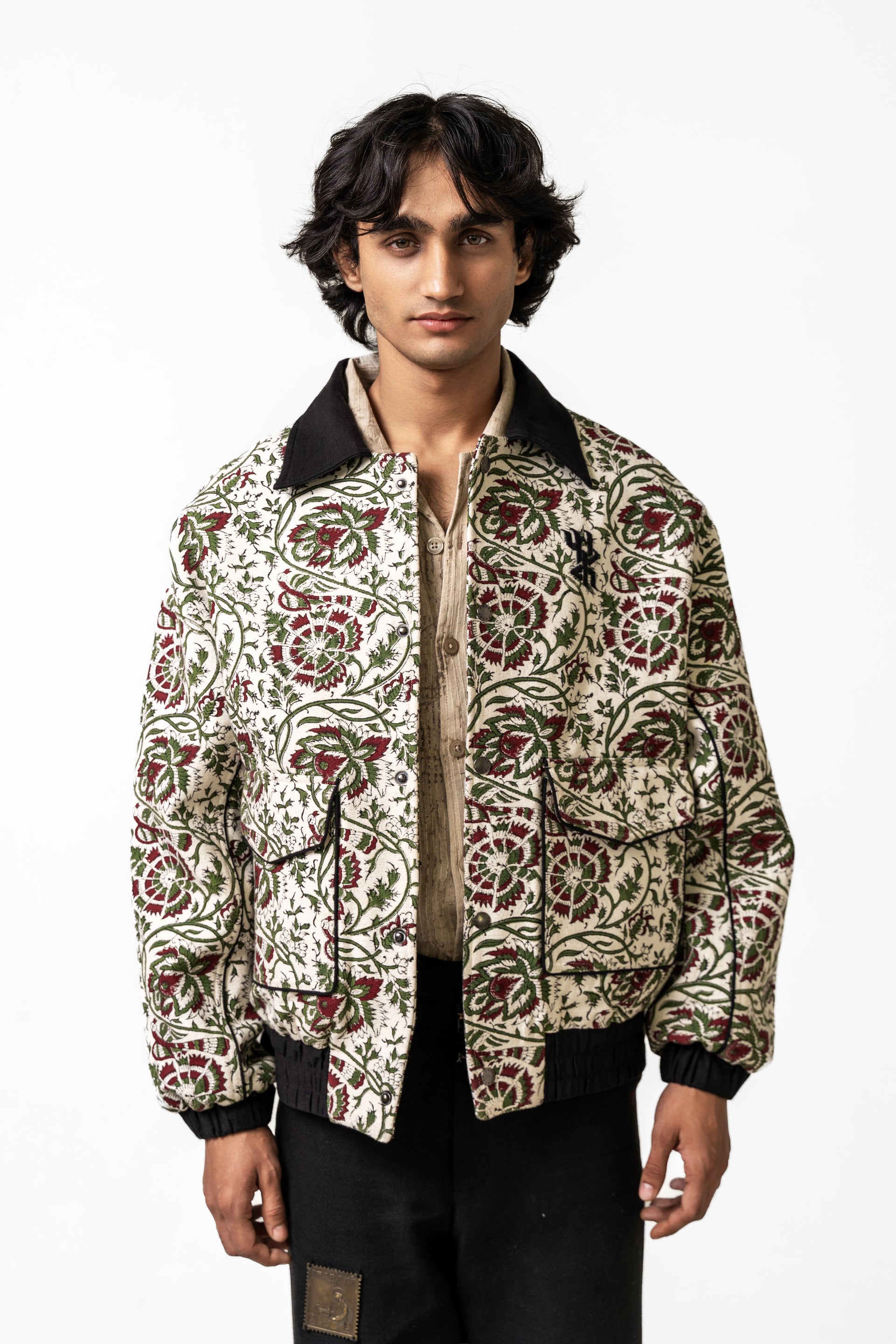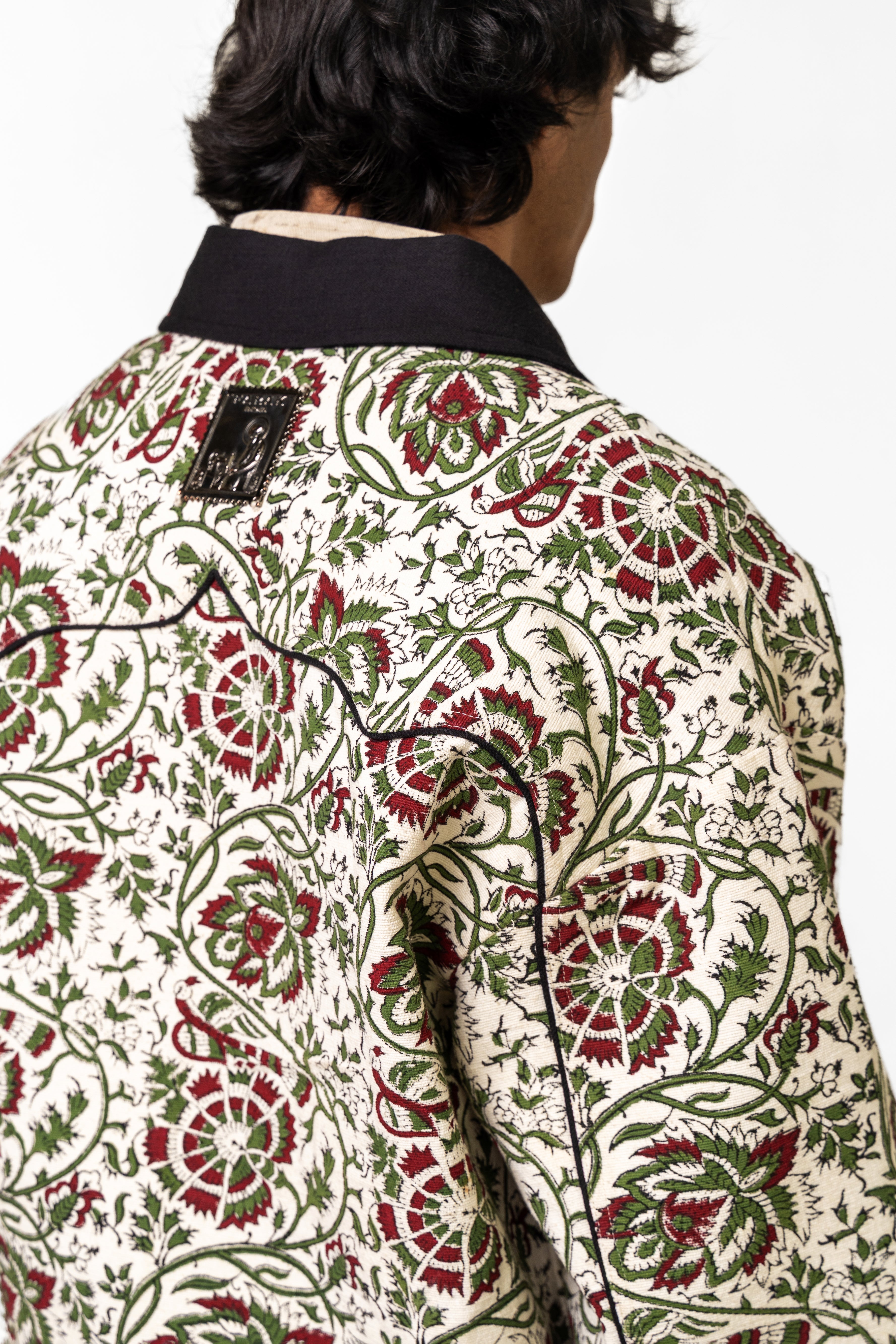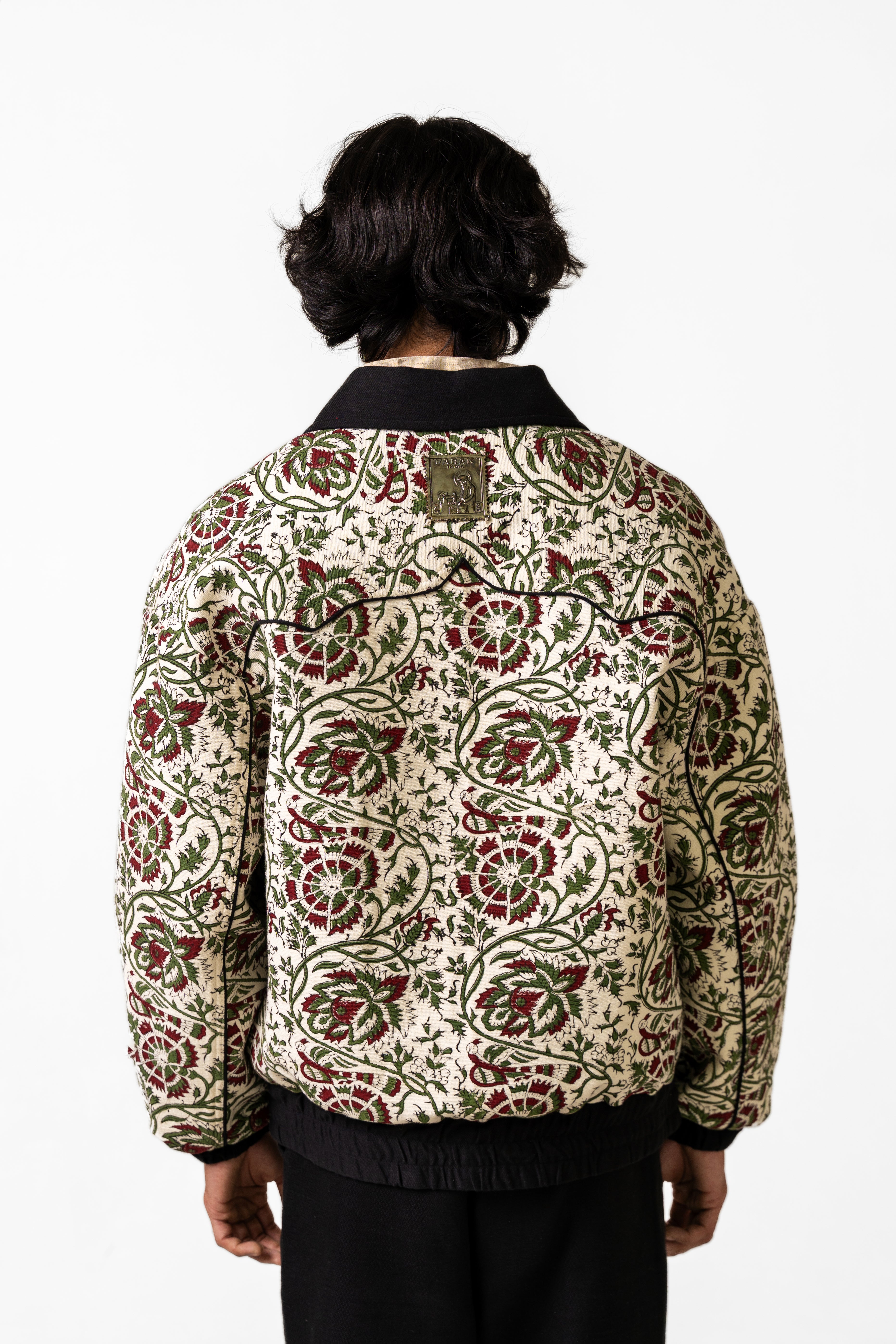 The Raag Handmade Jacket is crafted from 100% organic cotton and woven on traditional handlooms, carrying the warmth, depth, and texture of over 16 hours of dedicated weaving. The fabric serves as a rich canvas for intricate hand block–printed motifs, arranged in a balanced, rhythmic pattern that echoes the jacket’s name—Raag, a harmony of design and craft. The thoughtful placement of prints across the front, sleeves, and edges enhances the artisanal appeal while maintaining a clean, contemporary silhouette. A distinctive metal tag on the backside adds a refined, signature touch, grounding the piece in modern identity. With its structured yet comfortable form and its blend of handwoven texture and traditional printwork, the Raag Jacket stands as a sophisticated expression of craft, culture, and timeless handmade artistry.