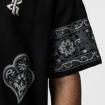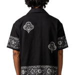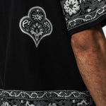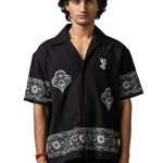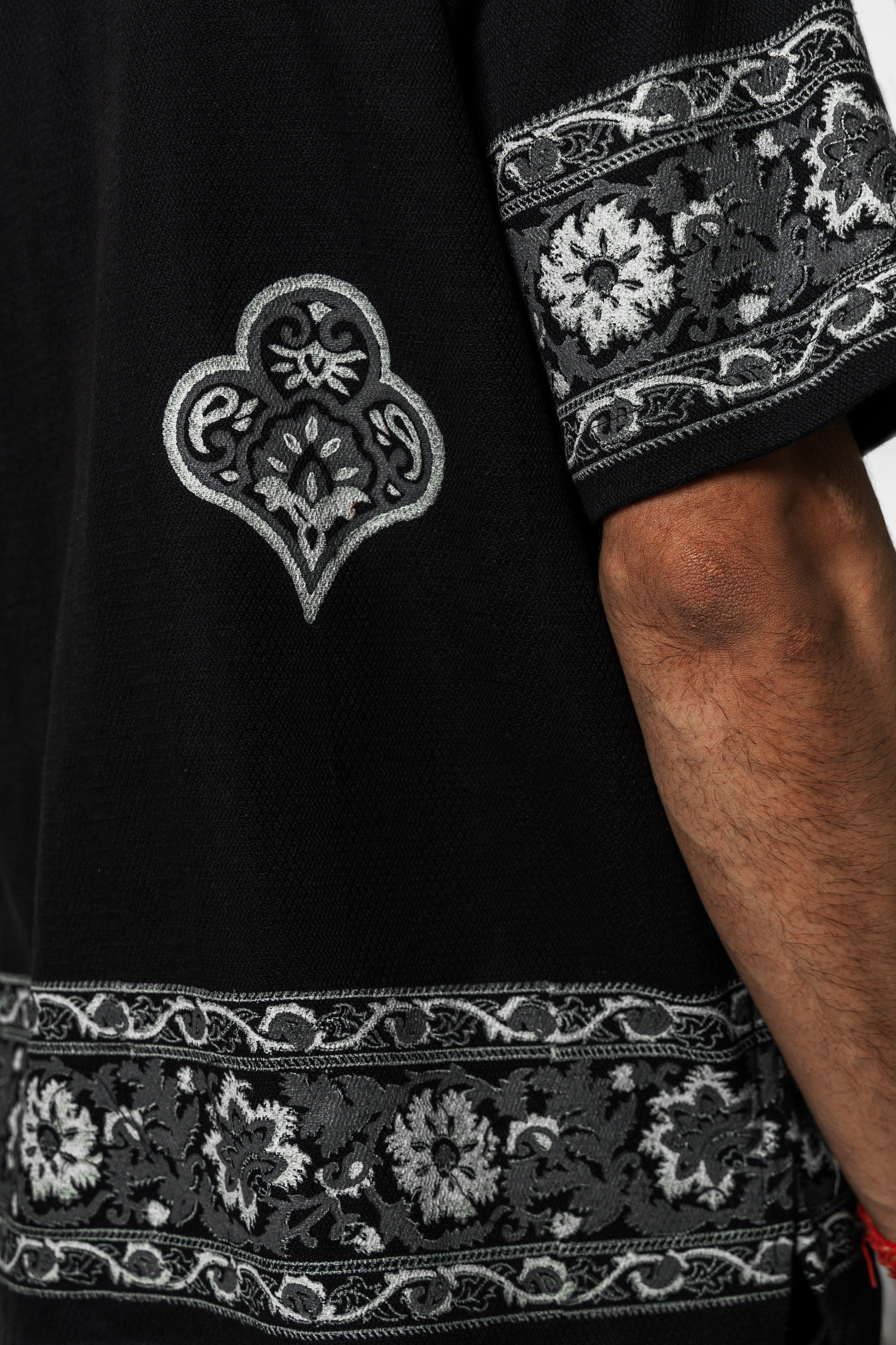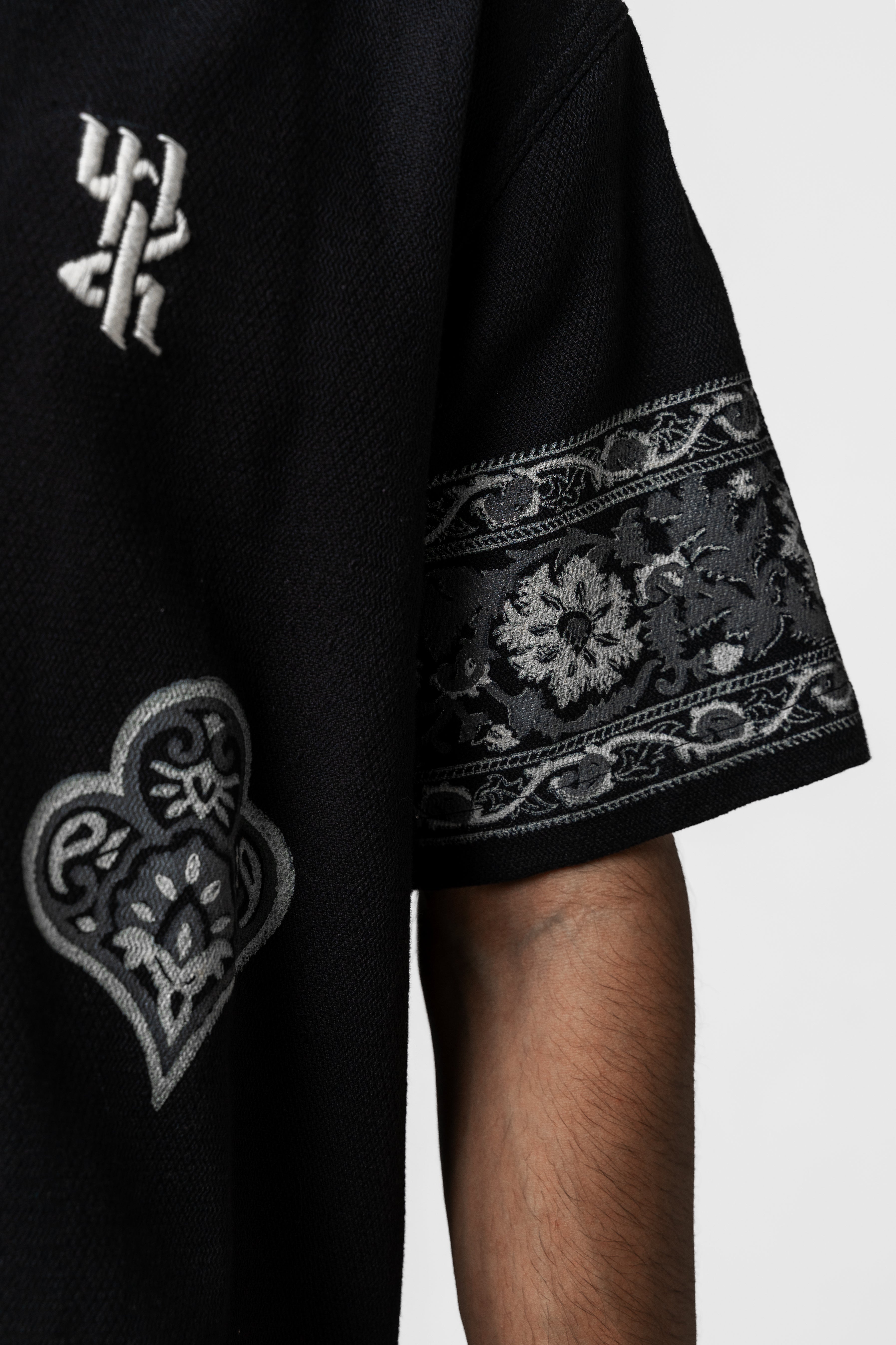 Crafted from 100% organic cotton, the Raatkala Handmade Shirt is woven on a traditional handloom over 12 meticulous hours, resulting in a rich, textured black fabric that sets the tone for its bold craftsmanship. The shirt features hand block printed floral and geometric borders along the sleeves and hem, created using heritage wooden blocks that lend a timeless character to the piece. The heart-shaped motifs seen across the front are also hand block printed, showcasing precise detailing and the charm of vintage block-carved forms. A hand-embroidered Farak emblem at the chest adds a subtle signature touch. Every element—from the placement of motifs to the depth of the prints—reflects the quiet intensity of nightfall, making this piece a refined blend of tradition, texture, and contemporary heritage.