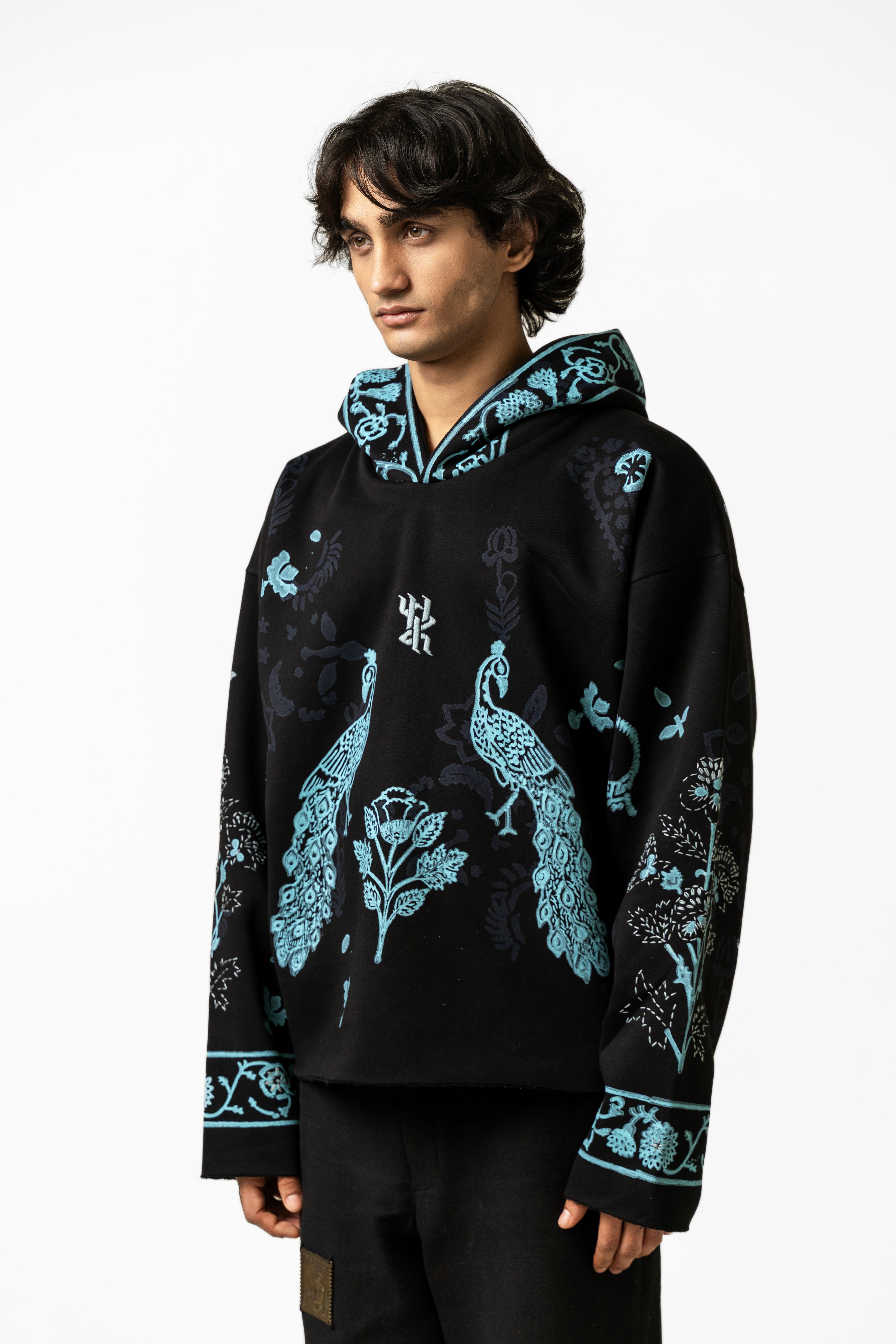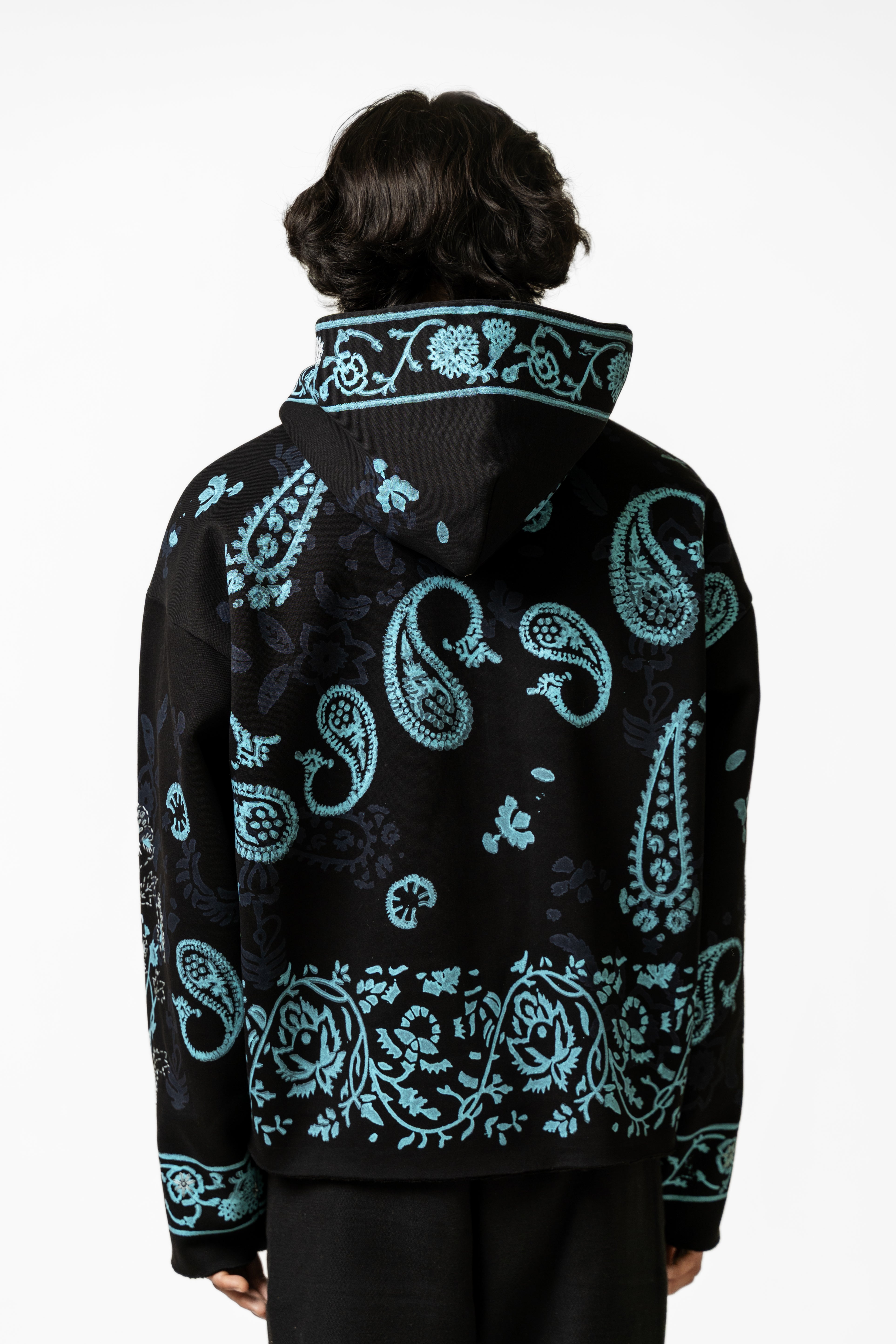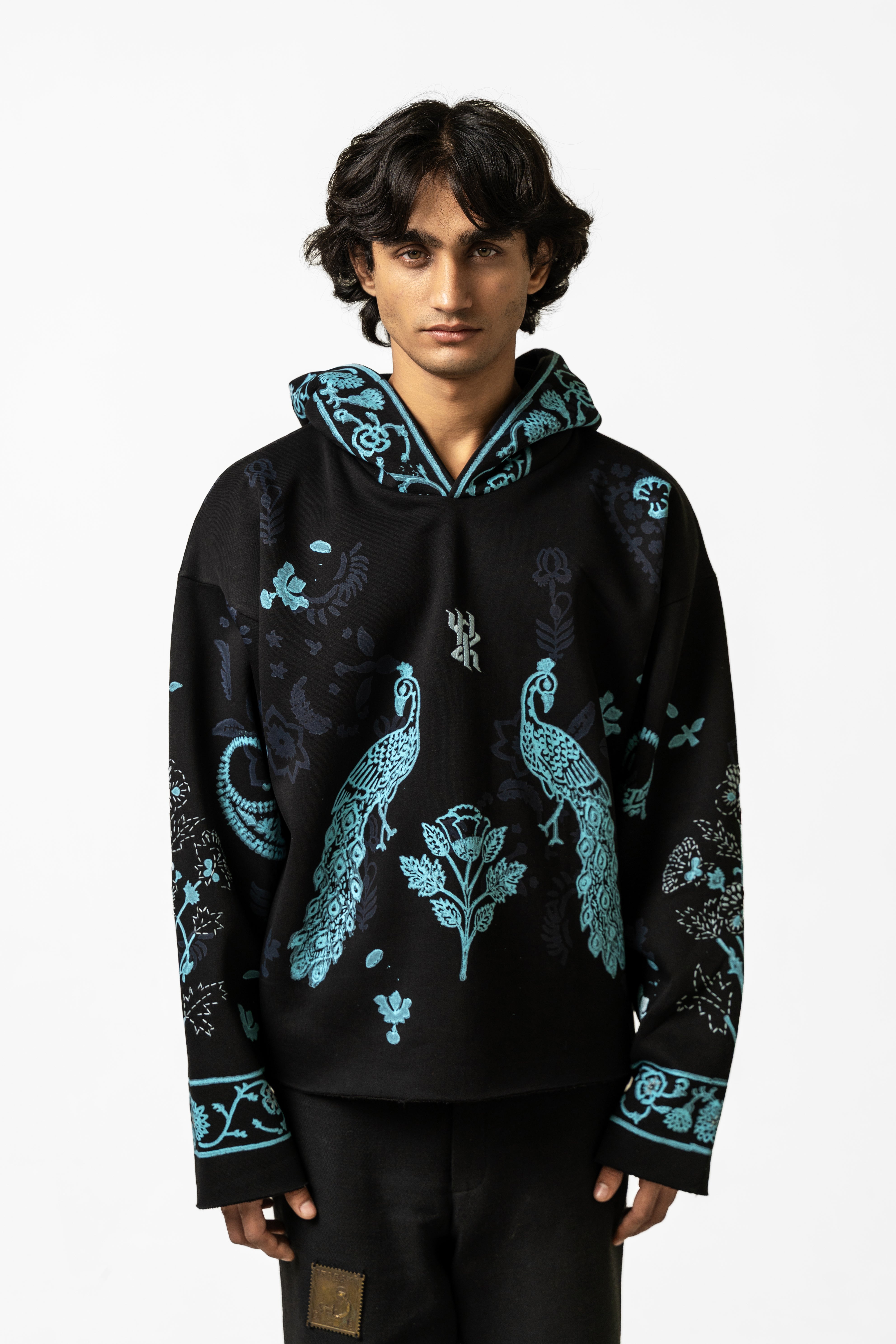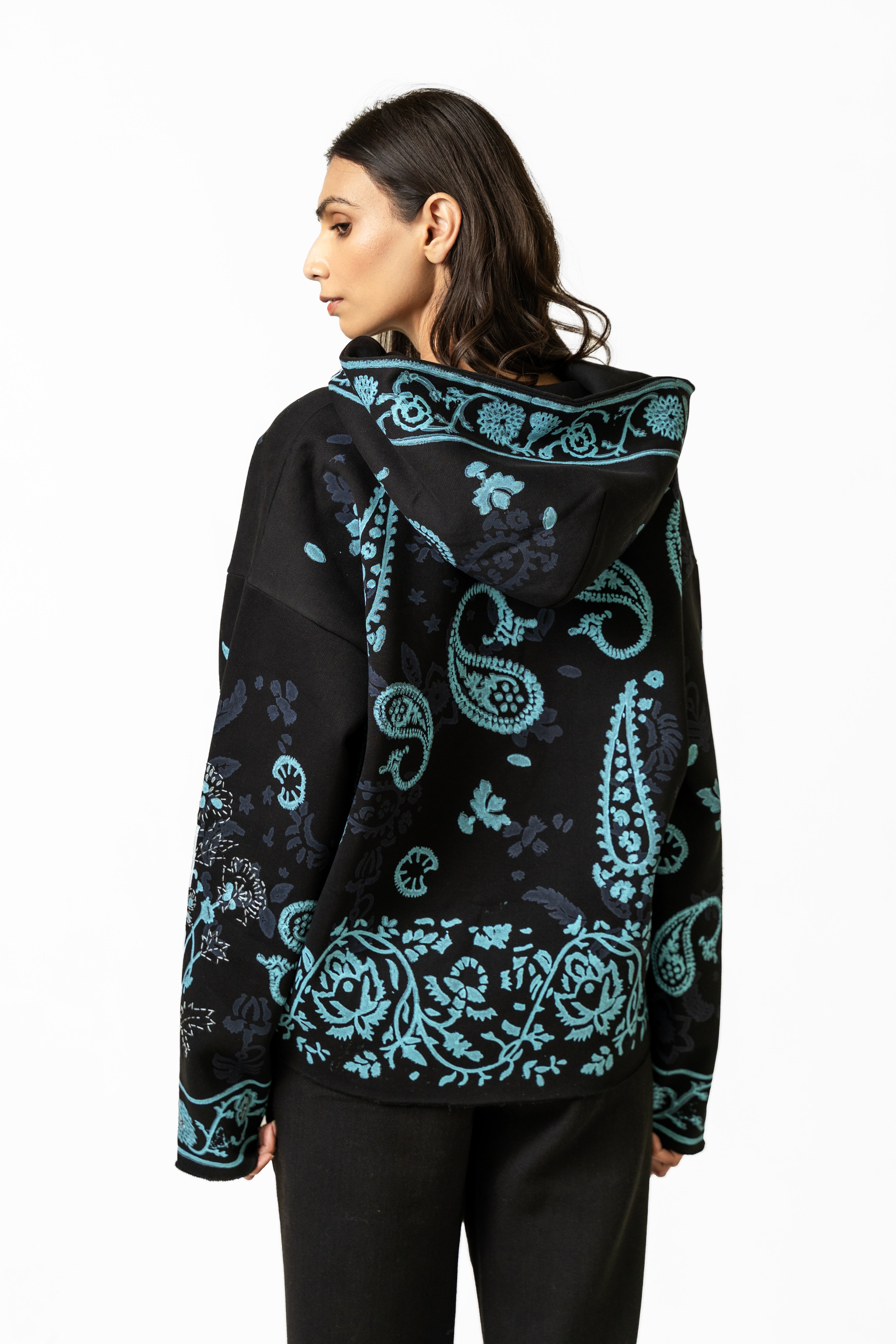 The Sapphire Handmade Hoodie is crafted from soft, durable poly-cotton fleece and elevated with rich artisanal detailing that brings the piece to life. Featuring an intricately hand-embroidered logo at the chest, the hoodie showcases beautifully arranged handblock-printed motifs inspired by traditional textile art, designed to stand out like sapphire accents against the fabric. The surface is further enhanced with kantha embroidery throughout, adding layers of texture, movement, and handcrafted charm that trace the contours of the prints. The relaxed silhouette, spacious hood, and clean finishing make it both comfortable and statement-worthy, blending cultural craftsmanship with modern streetwear appeal. The Sapphire Handmade Hoodie is a wearable reflection of precision, color, and contemporary artistry—crafted for those who value detail in every stitch.