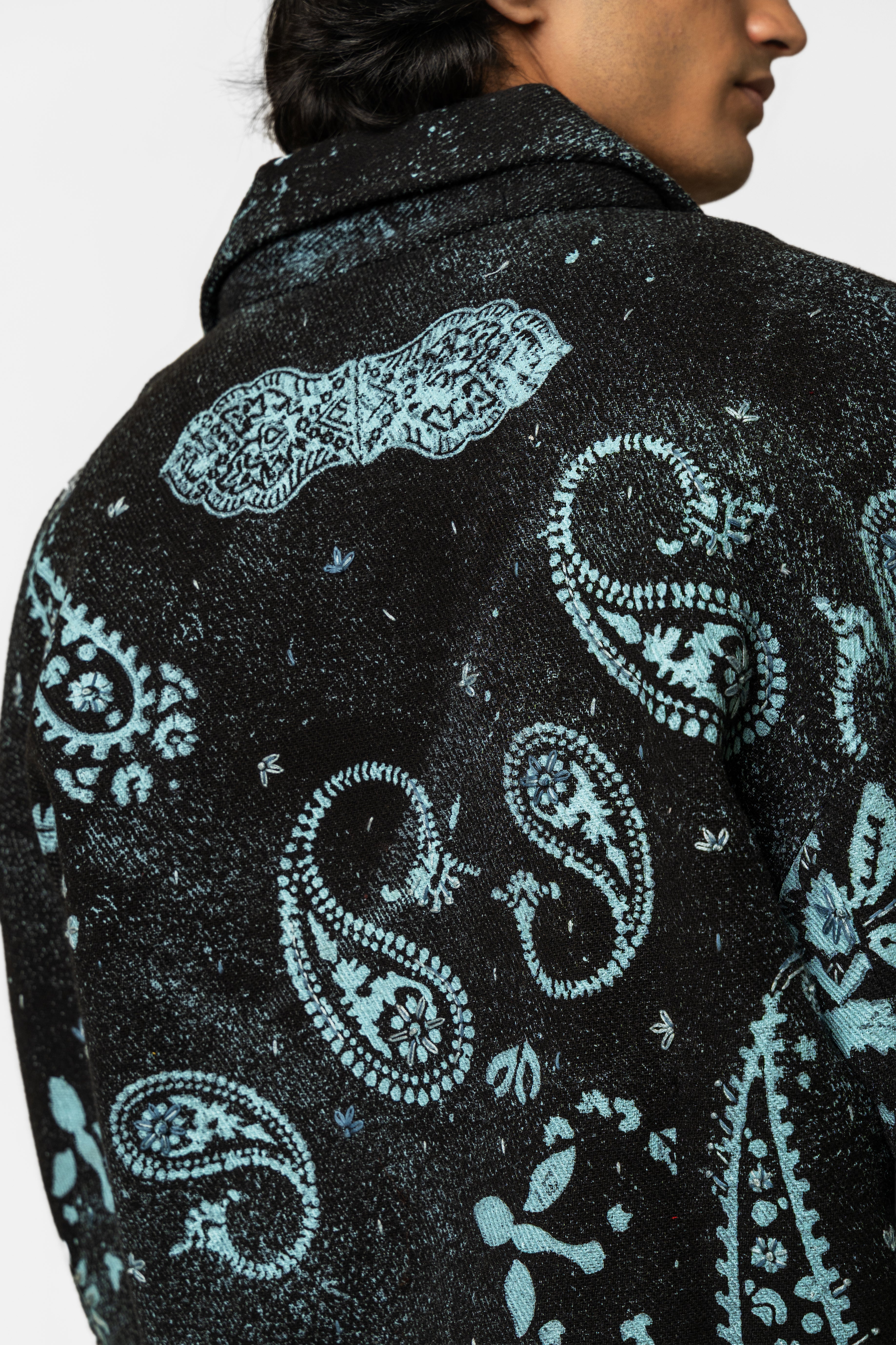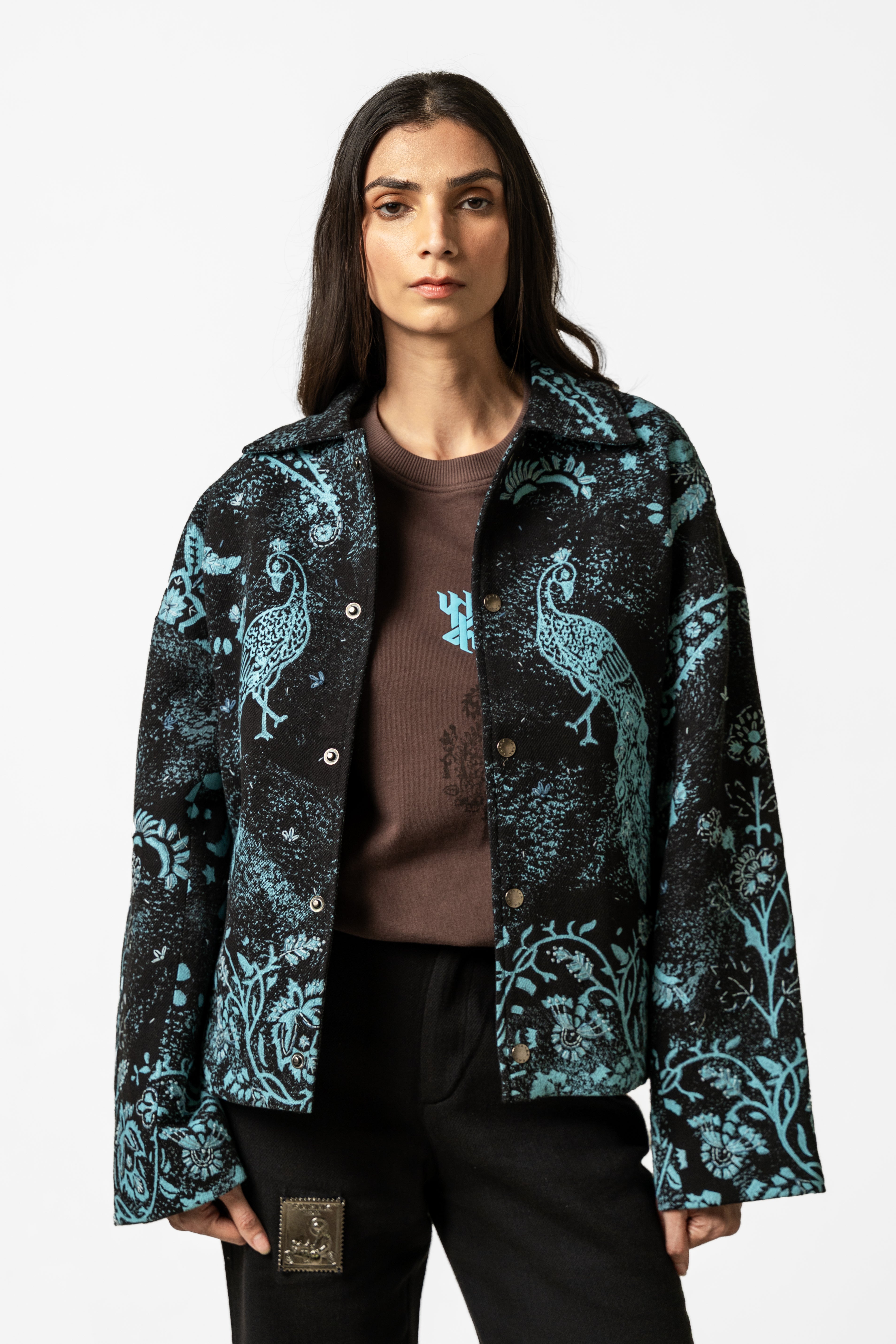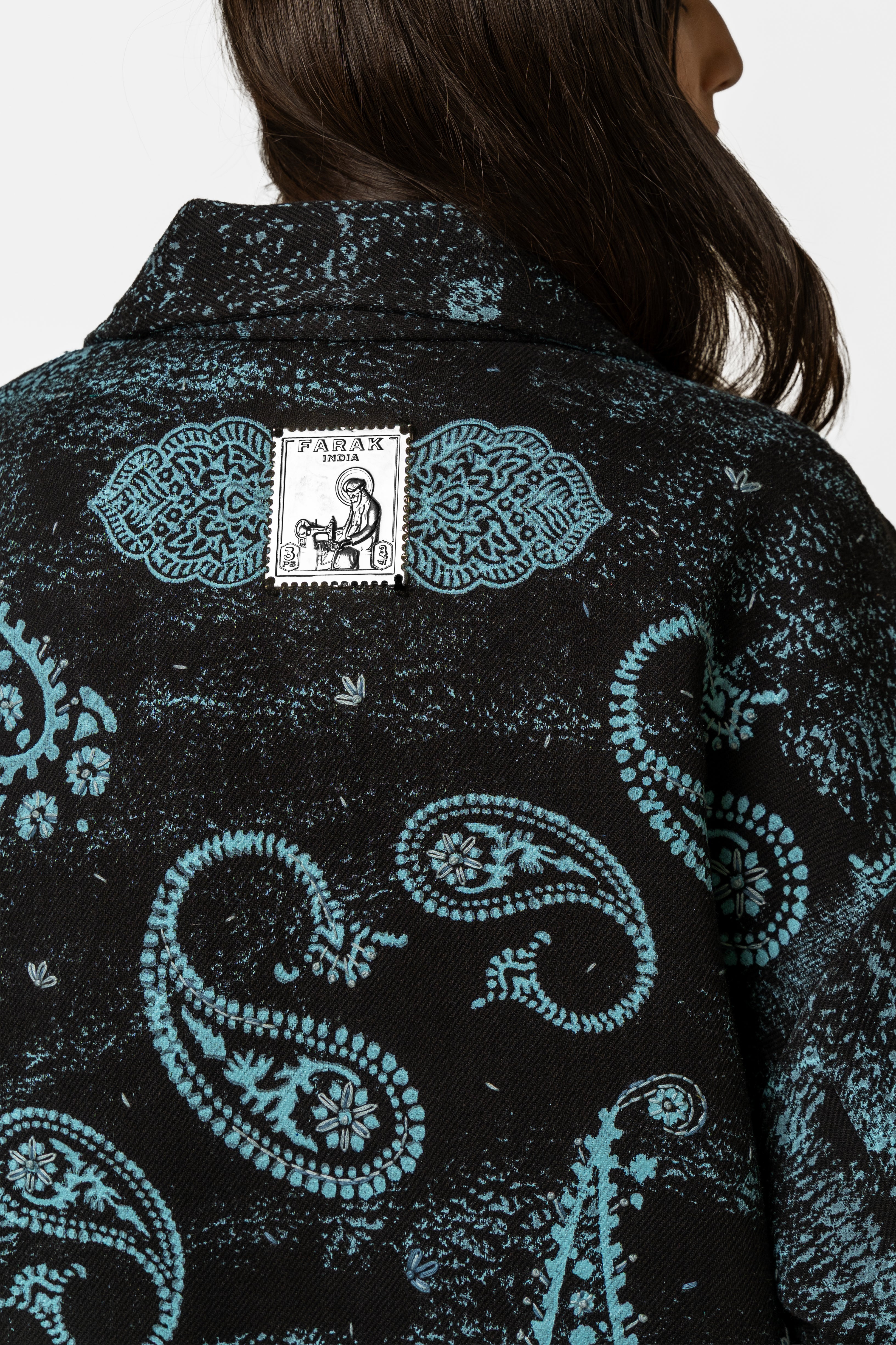 The Sapphire Handmade Jacket is crafted from 100% organic cotton, woven on traditional handlooms with over 12 hours of dedicated weaving, giving the fabric a rich, authentic texture that reflects true artisanal craft. The surface is adorned with intricate hand block–printed motifs, arranged thoughtfully to highlight the jacket’s structure and create a harmonious sapphire-inspired visual rhythm. Delicate kantha embroidery runs throughout, adding depth, movement, and handcrafted character to every panel of the garment. A distinctive metal tag at the backside offers a refined signature touch, grounding the jacket in contemporary identity while preserving its traditional soul. With its clean silhouette, cultural artistry, and meticulous handmade details, the Sapphire Handmade Jacket stands as a sophisticated blend of craft, comfort, and timeless design.