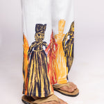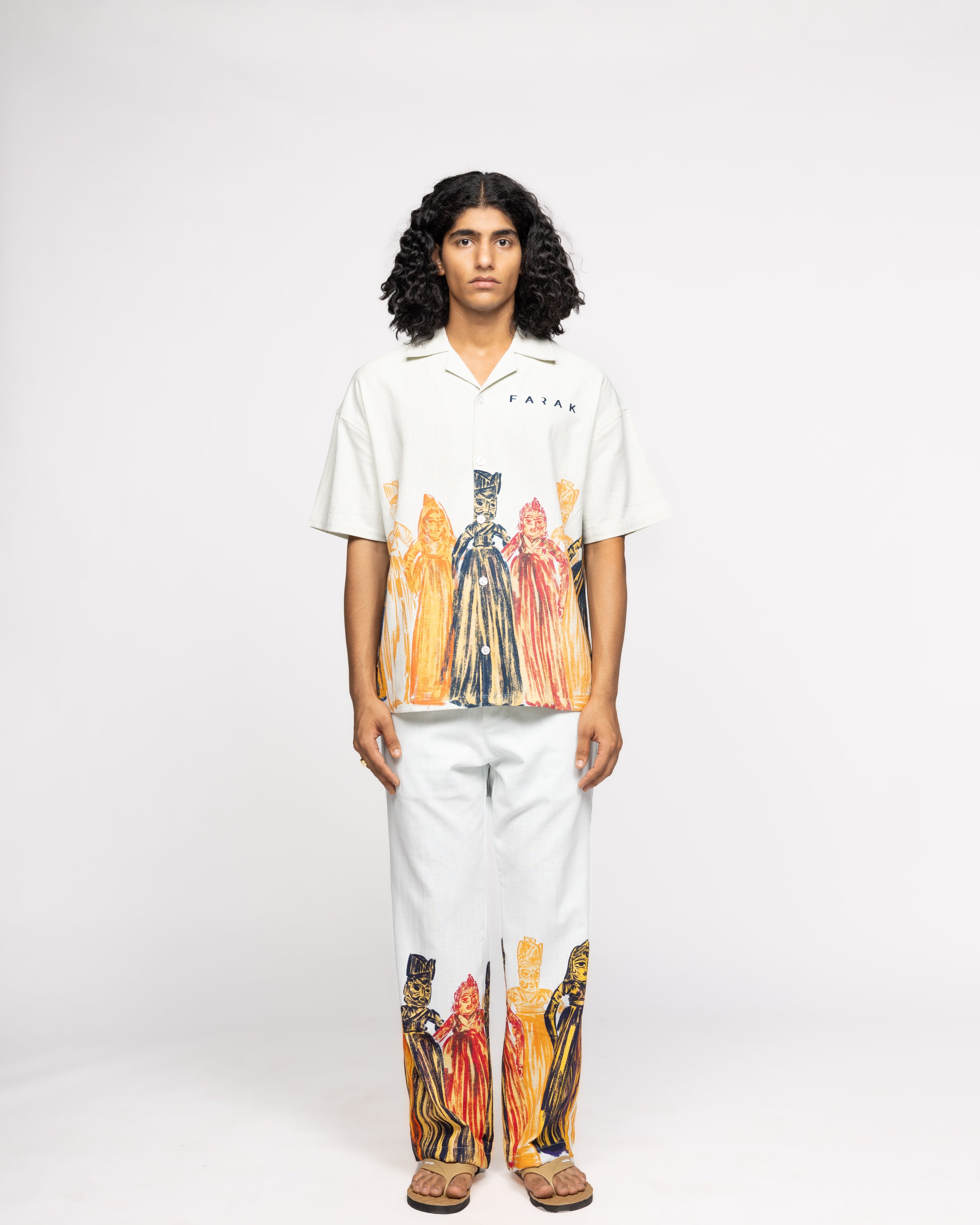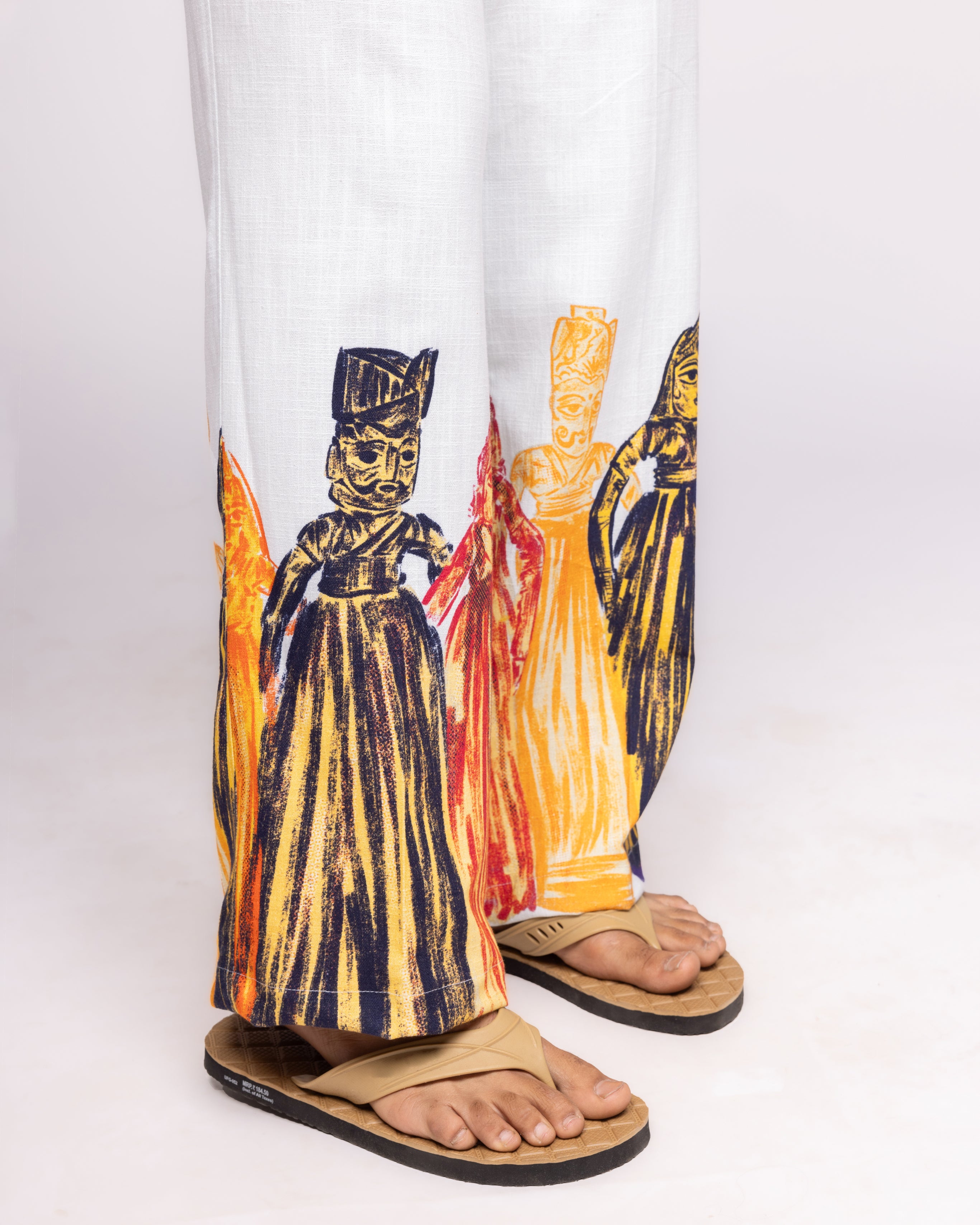 "The World's a Stage Pant, crafted from 100% organic cotton, merges cultural heritage with timeless wisdom. This pant showcases digitally printed designs inspired by Rajasthani puppetry and William Shakespeare's iconic adage, "All the world’s a stage, and all the men and women merely players." Drawing from the vibrant colours and intricate details of Rajasthani puppets, the pant's design tells a captivating story. These puppets, central to Rajasthan's cultural heritage, dance across the fabric, symbolizing the theatrical essence of life. The digital printing process ensures vivid colours and precise details, perfectly capturing the fusion of cultural and literary themes. Our creative director, Rishabh has expertly combined these narratives into a single, wearable piece of art. The World's Stage Pant not only celebrates the rich tradition of puppetry but also pays homage to Shakespeare's profound words, inviting wearers to reflect on the roles we all play in the grand theatre of life. This shirt is more than just clothing; it’s a tribute to the stories that shape our lives and the stages upon which we perform. It evokes nostalgia and intellectual curiosity.