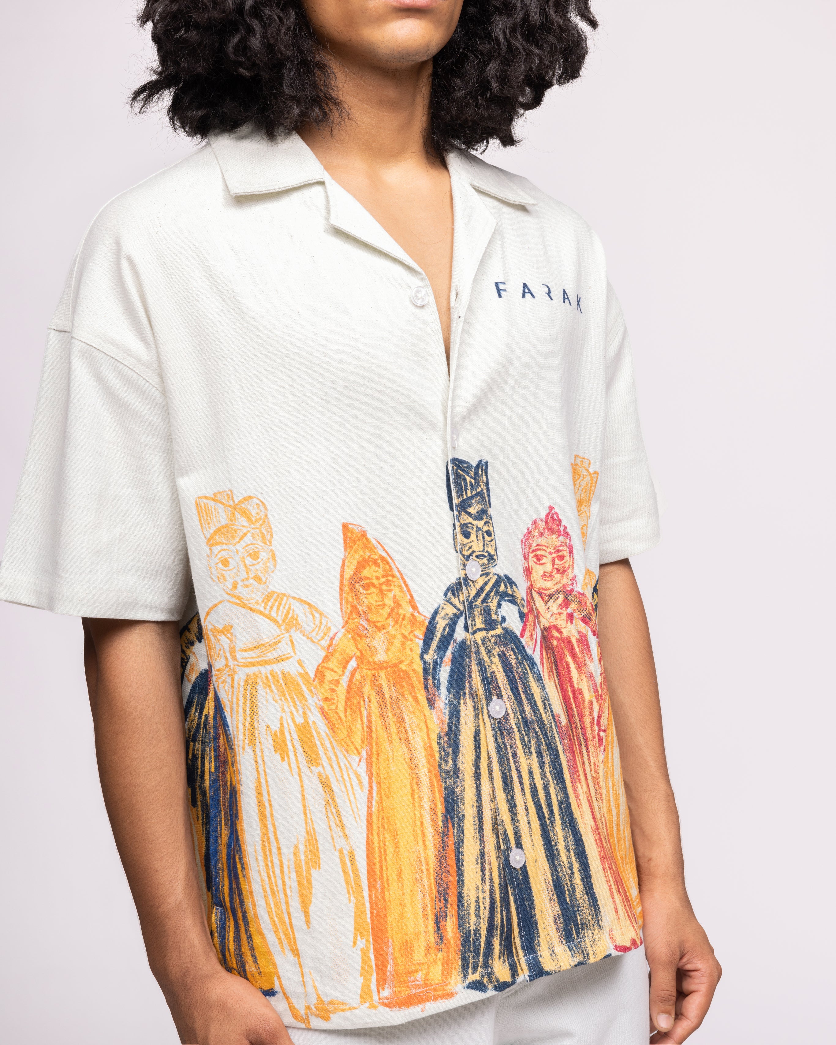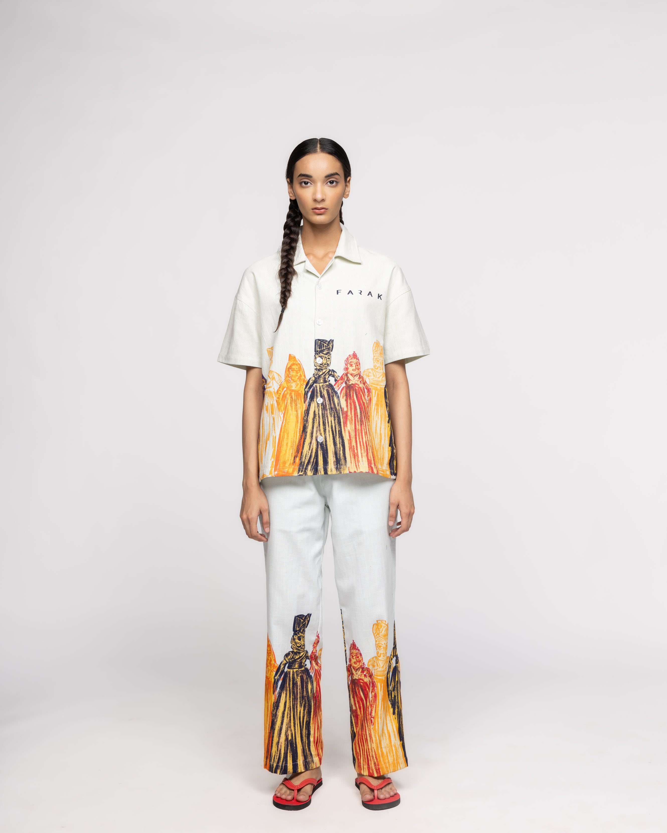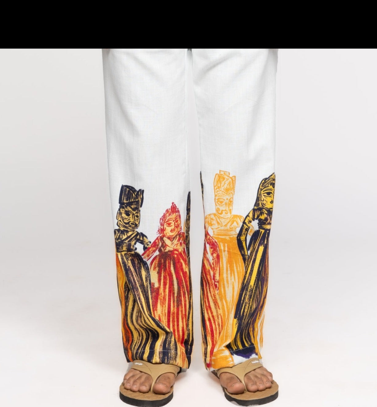 "The World's a Stage Pant, crafted from 100% organic cotton, merges cultural heritage with timeless wisdom. This pant showcases digitally printed designs inspired by Rajasthani puppetry and William Shakespeare's iconic adage, "All the world’s a stage, and all the men and women merely players." Drawing from the vibrant colours and intricate details of Rajasthani puppets, the pant's design tells a captivating story. These puppets, central to Rajasthan's cultural heritage, dance across the fabric, symbolizing the theatrical essence of life. The digital printing process ensures vivid colours and precise details, perfectly capturing the fusion of cultural and literary themes. Our creative director, Rishabh has expertly combined these narratives into a single, wearable piece of art. The World's Stage Pant not only celebrates the rich tradition of puppetry but also pays homage to Shakespeare's profound words, inviting wearers to reflect on the roles we all play in the grand theatre of life. This shirt is more than just clothing; it’s a tribute to the stories that shape our lives and the stages upon which we perform. It evokes nostalgia and intellectual curiosity.